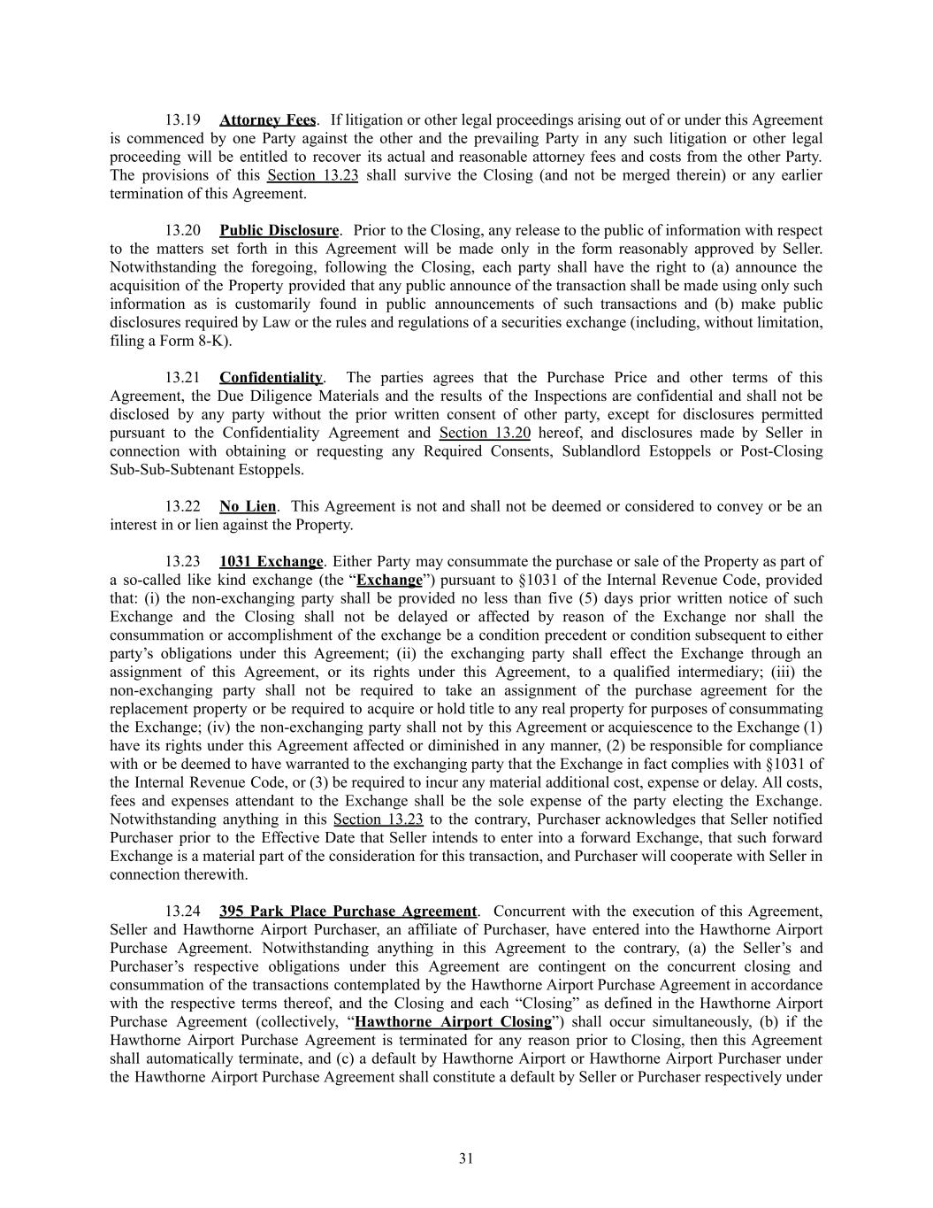 13.19​ Attorney Fees. If litigation or other legal proceedings arising out of or under this Agreement is commenced by one Party against the other and the prevailing Party in any such litigation or other legal proceeding will be entitled to recover its actual and reasonable attorney fees and costs from the other Party. The provisions of this Section 13.23 shall survive the Closing (and not be merged therein) or any earlier termination of this Agreement. 13.20​ Public Disclosure. Prior to the Closing, any release to the public of information with respect to the matters set forth in this Agreement will be made only in the form reasonably approved by Seller. Notwithstanding the foregoing, following the Closing, each party shall have the right to (a) announce the acquisition of the Property provided that any public announce of the transaction shall be made using only such information as is customarily found in public announcements of such transactions and (b) make public disclosures required by Law or the rules and regulations of a securities exchange (including, without limitation, filing a Form 8-K). 13.21​ Confidentiality. The parties agrees that the Purchase Price and other terms of this Agreement, the Due Diligence Materials and the results of the Inspections are confidential and shall not be disclosed by any party without the prior written consent of other party, except for disclosures permitted pursuant to the Confidentiality Agreement and Section 13.20 hereof, and disclosures made by Seller in connection with obtaining or requesting any Required Consents, Sublandlord Estoppels or Post-Closing Sub-Sub-Subtenant Estoppels. 13.22​ No Lien. This Agreement is not and shall not be deemed or considered to convey or be an interest in or lien against the Property. 13.23​ 1031 Exchange. Either Party may consummate the purchase or sale of the Property as part of a so-called like kind exchange (the “Exchange”) pursuant to §1031 of the Internal Revenue Code, provided that: (i) the non-exchanging party shall be provided no less than five (5) days prior written notice of such Exchange and the Closing shall not be delayed or affected by reason of the Exchange nor shall the consummation or accomplishment of the exchange be a condition precedent or condition subsequent to either party’s obligations under this Agreement; (ii) the exchanging party shall effect the Exchange through an assignment of this Agreement, or its rights under this Agreement, to a qualified intermediary; (iii) the non-exchanging party shall not be required to take an assignment of the purchase agreement for the replacement property or be required to acquire or hold title to any real property for purposes of consummating the Exchange; (iv) the non-exchanging party shall not by this Agreement or acquiescence to the Exchange (1) have its rights under this Agreement affected or diminished in any manner, (2) be responsible for compliance with or be deemed to have warranted to the exchanging party that the Exchange in fact complies with §1031 of the Internal Revenue Code, or (3) be required to incur any material additional cost, expense or delay. All costs, fees and expenses attendant to the Exchange shall be the sole expense of the party electing the Exchange. Notwithstanding anything in this Section 13.23 to the contrary, Purchaser acknowledges that Seller notified Purchaser prior to the Effective Date that Seller intends to enter into a forward Exchange, that such forward Exchange is a material part of the consideration for this transaction, and Purchaser will cooperate with Seller in connection therewith. 13.24​ 395 Park Place Purchase Agreement. Concurrent with the execution of this Agreement, Seller and Hawthorne Airport Purchaser, an affiliate of Purchaser, have entered into the Hawthorne Airport Purchase Agreement. Notwithstanding anything in this Agreement to the contrary, (a) the Seller’s and Purchaser’s respective obligations under this Agreement are contingent on the concurrent closing and consummation of the transactions contemplated by the Hawthorne Airport Purchase Agreement in accordance with the respective terms thereof, and the Closing and each “Closing” as defined in the Hawthorne Airport Purchase Agreement (collectively, “Hawthorne Airport Closing”) shall occur simultaneously, (b) if the Hawthorne Airport Purchase Agreement is terminated for any reason prior to Closing, then this Agreement shall automatically terminate, and (c) a default by Hawthorne Airport or Hawthorne Airport Purchaser under the Hawthorne Airport Purchase Agreement shall constitute a default by Seller or Purchaser respectively under 31