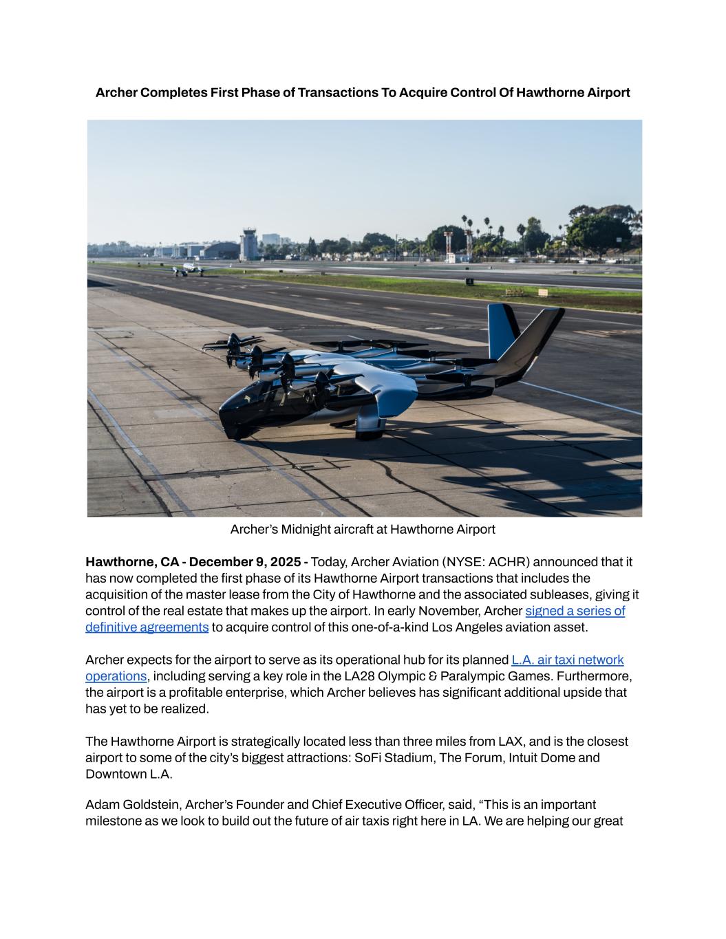 Archer Completes First Phase of Transactions To Acquire Control Of Hawthorne Airport Archer’s Midnight aircraft at Hawthorne Airport Hawthorne, CA - December 9, 2025 - Today, Archer Aviation (NYSE: ACHR) announced that it has now completed the first phase of its Hawthorne Airport transactions that includes the acquisition of the master lease from the City of Hawthorne and the associated subleases, giving it control of the real estate that makes up the airport. In early November, Archer signed a series of definitive agreements to acquire control of this one-of-a-kind Los Angeles aviation asset. Archer expects for the airport to serve as its operational hub for its planned L.A. air taxi network operations, including serving a key role in the LA28 Olympic & Paralympic Games. Furthermore, the airport is a profitable enterprise, which Archer believes has significant additional upside that has yet to be realized. The Hawthorne Airport is strategically located less than three miles from LAX, and is the closest airport to some of the city’s biggest attractions: SoFi Stadium, The Forum, Intuit Dome and Downtown L.A. Adam Goldstein, Archer’s Founder and Chief Executive Officer, said, “This is an important milestone as we look to build out the future of air taxis right here in LA. We are helping our great