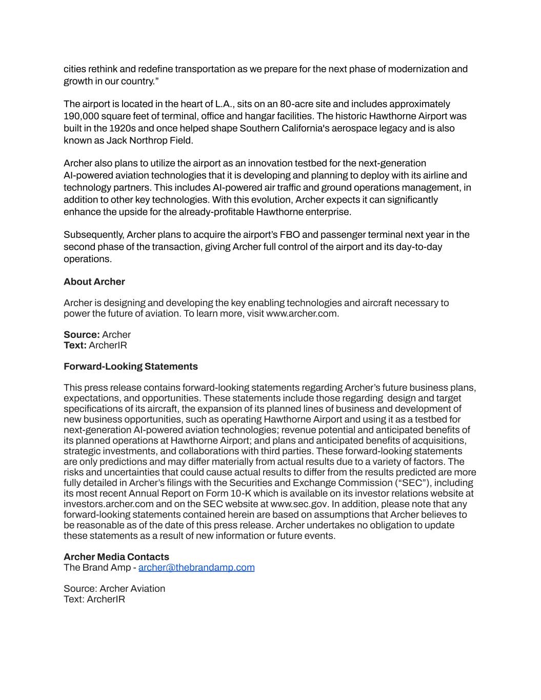 cities rethink and redefine transportation as we prepare for the next phase of modernization and growth in our country.” The airport is located in the heart of L.A., sits on an 80-acre site and includes approximately 190,000 square feet of terminal, office and hangar facilities. The historic Hawthorne Airport was built in the 1920s and once helped shape Southern California's aerospace legacy and is also known as Jack Northrop Field. Archer also plans to utilize the airport as an innovation testbed for the next-generation AI-powered aviation technologies that it is developing and planning to deploy with its airline and technology partners. This includes AI-powered air traffic and ground operations management, in addition to other key technologies. With this evolution, Archer expects it can significantly enhance the upside for the already-profitable Hawthorne enterprise. Subsequently, Archer plans to acquire the airport’s FBO and passenger terminal next year in the second phase of the transaction, giving Archer full control of the airport and its day-to-day operations. About Archer Archer is designing and developing the key enabling technologies and aircraft necessary to power the future of aviation. To learn more, visit www.archer.com. Source: Archer​ Text: ArcherIR Forward-Looking Statements This press release contains forward-looking statements regarding Archer’s future business plans, expectations, and opportunities. These statements include those regarding design and target specifications of its aircraft, the expansion of its planned lines of business and development of new business opportunities, such as operating Hawthorne Airport and using it as a testbed for next-generation AI-powered aviation technologies; revenue potential and anticipated benefits of its planned operations at Hawthorne Airport; and plans and anticipated benefits of acquisitions, strategic investments, and collaborations with third parties. These forward-looking statements are only predictions and may differ materially from actual results due to a variety of factors. The risks and uncertainties that could cause actual results to differ from the results predicted are more fully detailed in Archer’s filings with the Securities and Exchange Commission (“SEC”), including its most recent Annual Report on Form 10-K which is available on its investor relations website at investors.archer.com and on the SEC website at www.sec.gov. In addition, please note that any forward-looking statements contained herein are based on assumptions that Archer believes to be reasonable as of the date of this press release. Archer undertakes no obligation to update these statements as a result of new information or future events. Archer Media Contacts​ The Brand Amp - archer@thebrandamp.com Source: Archer Aviation​ Text: ArcherIR