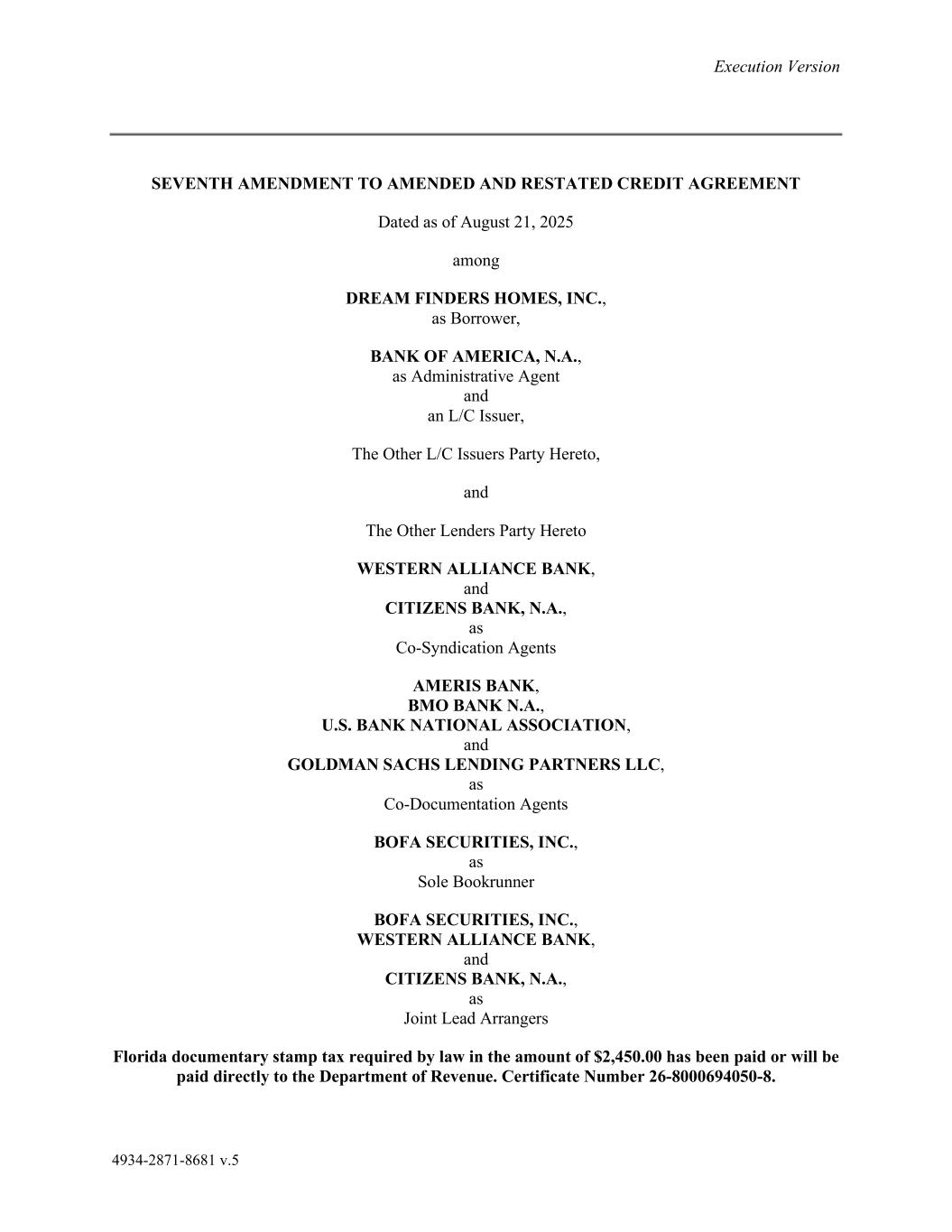 4934-2871-8681 v.5 Execution Version SEVENTH AMENDMENT TO AMENDED AND RESTATED CREDIT AGREEMENT Dated as of August 21, 2025 among DREAM FINDERS HOMES, INC., as Borrower, BANK OF AMERICA, N.A., as Administrative Agent and an L/C Issuer, The Other L/C Issuers Party Hereto, and The Other Lenders Party Hereto WESTERN ALLIANCE BANK, and CITIZENS BANK, N.A., as Co-Syndication Agents AMERIS BANK, BMO BANK N.A., U.S. BANK NATIONAL ASSOCIATION, and GOLDMAN SACHS LENDING PARTNERS LLC, as Co-Documentation Agents BOFA SECURITIES, INC., as Sole Bookrunner BOFA SECURITIES, INC., WESTERN ALLIANCE BANK, and CITIZENS BANK, N.A., as Joint Lead Arrangers Florida documentary stamp tax required by law in the amount of $2,450.00 has been paid or will be paid directly to the Department of Revenue. Certificate Number 26-8000694050-8.