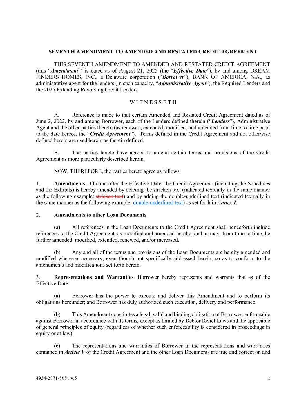 4934-2871-8681 v.5 2 SEVENTH AMENDMENT TO AMENDED AND RESTATED CREDIT AGREEMENT THIS SEVENTH AMENDMENT TO AMENDED AND RESTATED CREDIT AGREEMENT (this “Amendment”) is dated as of August 21, 2025 (the “Effective Date”), by and among DREAM FINDERS HOMES, INC., a Delaware corporation (“Borrower”), BANK OF AMERICA, N.A., as administrative agent for the lenders (in such capacity, “Administrative Agent”), the Required Lenders and the 2025 Extending Revolving Credit Lenders. W I T N E S S E T H A. Reference is made to that certain Amended and Restated Credit Agreement dated as of June 2, 2022, by and among Borrower, each of the Lenders defined therein (“Lenders”), Administrative Agent and the other parties thereto (as renewed, extended, modified, and amended from time to time prior to the date hereof, the “Credit Agreement”). Terms defined in the Credit Agreement and not otherwise defined herein are used herein as therein defined. B. The parties hereto have agreed to amend certain terms and provisions of the Credit Agreement as more particularly described herein. NOW, THEREFORE, the parties hereto agree as follows: 1. Amendments. On and after the Effective Date, the Credit Agreement (including the Schedules and the Exhibits) is hereby amended by deleting the stricken text (indicated textually in the same manner as the following example: stricken text) and by adding the double-underlined text (indicated textually in the same manner as the following example: double-underlined text) as set forth in Annex I. 2. Amendments to other Loan Documents. (a) All references in the Loan Documents to the Credit Agreement shall henceforth include references to the Credit Agreement, as modified and amended hereby, and as may, from time to time, be further amended, modified, extended, renewed, and/or increased. (b) Any and all of the terms and provisions of the Loan Documents are hereby amended and modified wherever necessary, even though not specifically addressed herein, so as to conform to the amendments and modifications set forth herein. 3. Representations and Warranties. Borrower hereby represents and warrants that as of the Effective Date: (a) Borrower has the power to execute and deliver this Amendment and to perform its obligations hereunder; and Borrower has duly authorized such execution, delivery and performance. (b) This Amendment constitutes a legal, valid and binding obligation of Borrower, enforceable against Borrower in accordance with its terms, except as limited by Debtor Relief Laws and the applicable of general principles of equity (regardless of whether such enforceability is considered in proceedings in equity or at law). (c) The representations and warranties of Borrower in the representations and warranties contained in Article V of the Credit Agreement and the other Loan Documents are true and correct on and