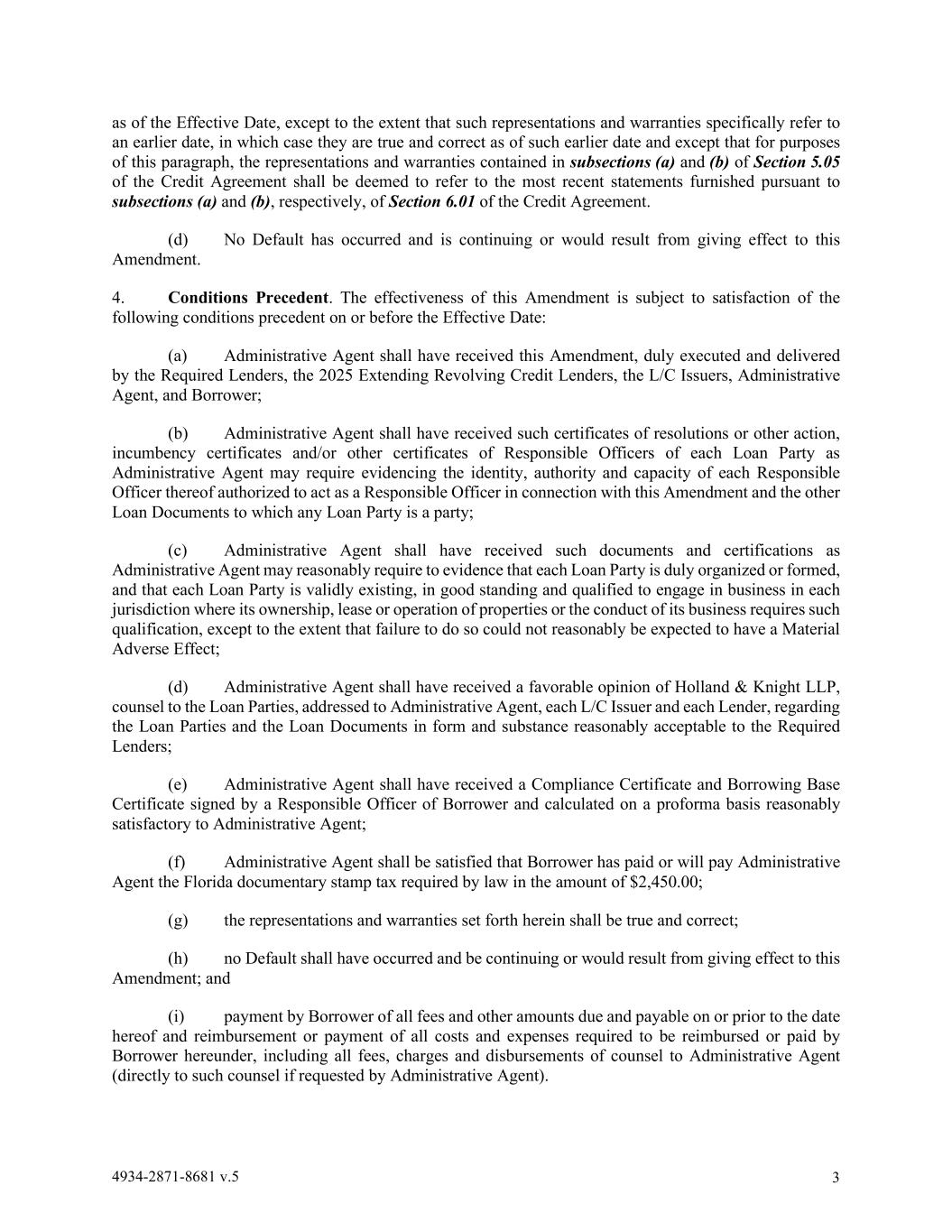 4934-2871-8681 v.5 3 as of the Effective Date, except to the extent that such representations and warranties specifically refer to an earlier date, in which case they are true and correct as of such earlier date and except that for purposes of this paragraph, the representations and warranties contained in subsections (a) and (b) of Section 5.05 of the Credit Agreement shall be deemed to refer to the most recent statements furnished pursuant to subsections (a) and (b), respectively, of Section 6.01 of the Credit Agreement. (d) No Default has occurred and is continuing or would result from giving effect to this Amendment. 4. Conditions Precedent. The effectiveness of this Amendment is subject to satisfaction of the following conditions precedent on or before the Effective Date: (a) Administrative Agent shall have received this Amendment, duly executed and delivered by the Required Lenders, the 2025 Extending Revolving Credit Lenders, the L/C Issuers, Administrative Agent, and Borrower; (b) Administrative Agent shall have received such certificates of resolutions or other action, incumbency certificates and/or other certificates of Responsible Officers of each Loan Party as Administrative Agent may require evidencing the identity, authority and capacity of each Responsible Officer thereof authorized to act as a Responsible Officer in connection with this Amendment and the other Loan Documents to which any Loan Party is a party; (c) Administrative Agent shall have received such documents and certifications as Administrative Agent may reasonably require to evidence that each Loan Party is duly organized or formed, and that each Loan Party is validly existing, in good standing and qualified to engage in business in each jurisdiction where its ownership, lease or operation of properties or the conduct of its business requires such qualification, except to the extent that failure to do so could not reasonably be expected to have a Material Adverse Effect; (d) Administrative Agent shall have received a favorable opinion of Holland & Knight LLP, counsel to the Loan Parties, addressed to Administrative Agent, each L/C Issuer and each Lender, regarding the Loan Parties and the Loan Documents in form and substance reasonably acceptable to the Required Lenders; (e) Administrative Agent shall have received a Compliance Certificate and Borrowing Base Certificate signed by a Responsible Officer of Borrower and calculated on a proforma basis reasonably satisfactory to Administrative Agent; (f) Administrative Agent shall be satisfied that Borrower has paid or will pay Administrative Agent the Florida documentary stamp tax required by law in the amount of $2,450.00; (g) the representations and warranties set forth herein shall be true and correct; (h) no Default shall have occurred and be continuing or would result from giving effect to this Amendment; and (i) payment by Borrower of all fees and other amounts due and payable on or prior to the date hereof and reimbursement or payment of all costs and expenses required to be reimbursed or paid by Borrower hereunder, including all fees, charges and disbursements of counsel to Administrative Agent (directly to such counsel if requested by Administrative Agent).
