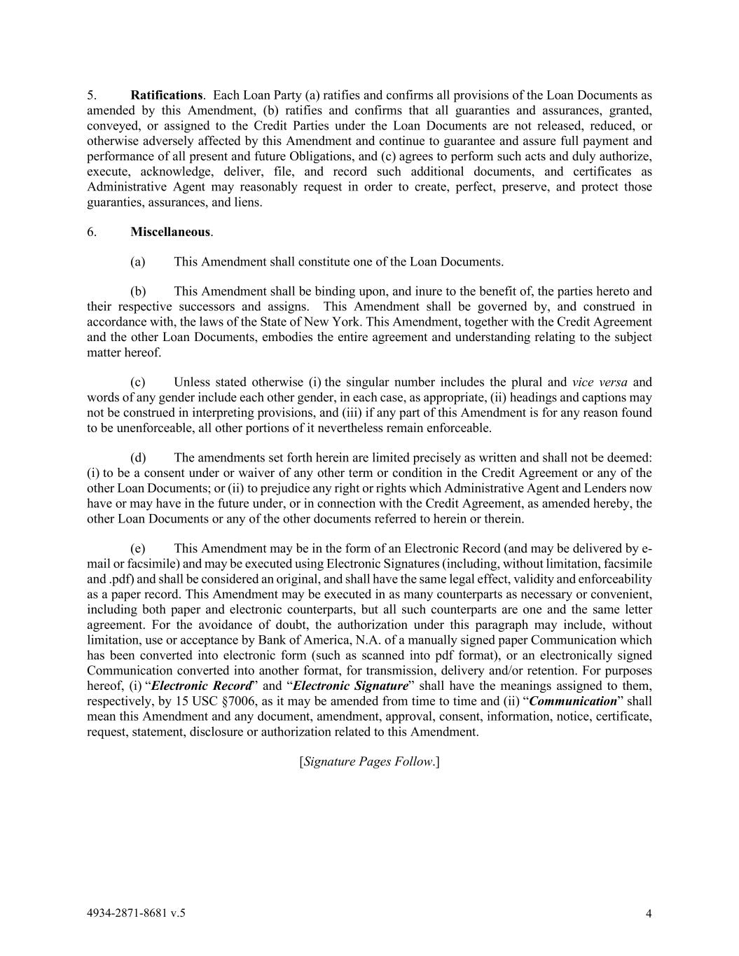 4934-2871-8681 v.5 4 5. Ratifications. Each Loan Party (a) ratifies and confirms all provisions of the Loan Documents as amended by this Amendment, (b) ratifies and confirms that all guaranties and assurances, granted, conveyed, or assigned to the Credit Parties under the Loan Documents are not released, reduced, or otherwise adversely affected by this Amendment and continue to guarantee and assure full payment and performance of all present and future Obligations, and (c) agrees to perform such acts and duly authorize, execute, acknowledge, deliver, file, and record such additional documents, and certificates as Administrative Agent may reasonably request in order to create, perfect, preserve, and protect those guaranties, assurances, and liens. 6. Miscellaneous. (a) This Amendment shall constitute one of the Loan Documents. (b) This Amendment shall be binding upon, and inure to the benefit of, the parties hereto and their respective successors and assigns. This Amendment shall be governed by, and construed in accordance with, the laws of the State of New York. This Amendment, together with the Credit Agreement and the other Loan Documents, embodies the entire agreement and understanding relating to the subject matter hereof. (c) Unless stated otherwise (i) the singular number includes the plural and vice versa and words of any gender include each other gender, in each case, as appropriate, (ii) headings and captions may not be construed in interpreting provisions, and (iii) if any part of this Amendment is for any reason found to be unenforceable, all other portions of it nevertheless remain enforceable. (d) The amendments set forth herein are limited precisely as written and shall not be deemed: (i) to be a consent under or waiver of any other term or condition in the Credit Agreement or any of the other Loan Documents; or (ii) to prejudice any right or rights which Administrative Agent and Lenders now have or may have in the future under, or in connection with the Credit Agreement, as amended hereby, the other Loan Documents or any of the other documents referred to herein or therein. (e) This Amendment may be in the form of an Electronic Record (and may be delivered by e- mail or facsimile) and may be executed using Electronic Signatures (including, without limitation, facsimile and .pdf) and shall be considered an original, and shall have the same legal effect, validity and enforceability as a paper record. This Amendment may be executed in as many counterparts as necessary or convenient, including both paper and electronic counterparts, but all such counterparts are one and the same letter agreement. For the avoidance of doubt, the authorization under this paragraph may include, without limitation, use or acceptance by Bank of America, N.A. of a manually signed paper Communication which has been converted into electronic form (such as scanned into pdf format), or an electronically signed Communication converted into another format, for transmission, delivery and/or retention. For purposes hereof, (i) “Electronic Record” and “Electronic Signature” shall have the meanings assigned to them, respectively, by 15 USC §7006, as it may be amended from time to time and (ii) “Communication” shall mean this Amendment and any document, amendment, approval, consent, information, notice, certificate, request, statement, disclosure or authorization related to this Amendment. [Signature Pages Follow.]