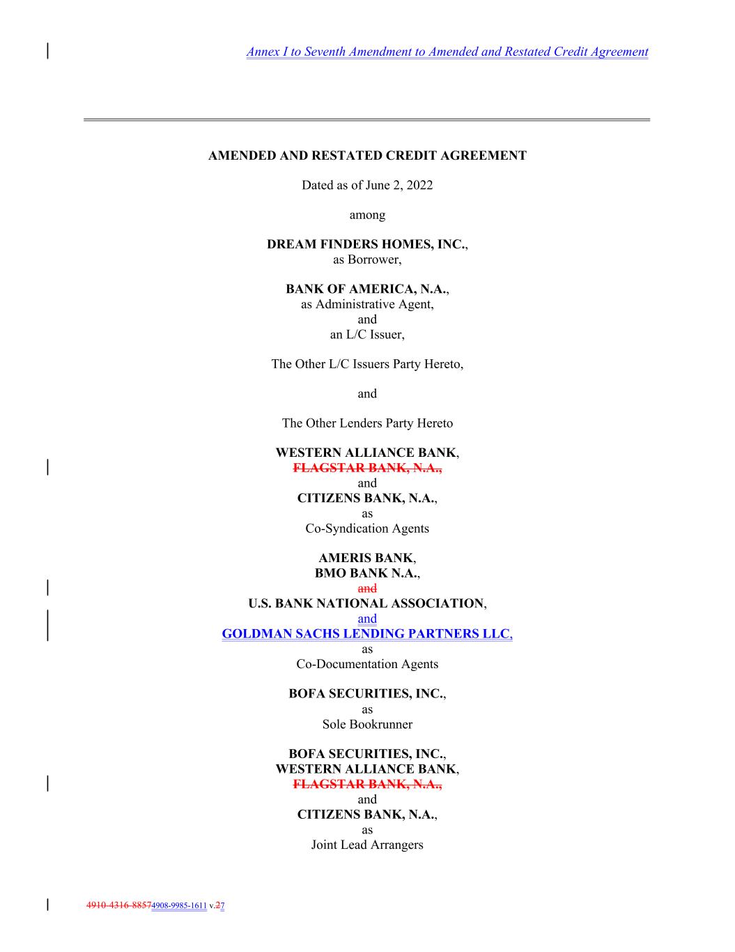 4910-4316-88574908-9985-1611 v.27 Annex I to Seventh Amendment to Amended and Restated Credit Agreement AMENDED AND RESTATED CREDIT AGREEMENT Dated as of June 2, 2022 among DREAM FINDERS HOMES, INC., as Borrower, BANK OF AMERICA, N.A., as Administrative Agent, and an L/C Issuer, The Other L/C Issuers Party Hereto, and The Other Lenders Party Hereto WESTERN ALLIANCE BANK, FLAGSTAR BANK, N.A., and CITIZENS BANK, N.A., as Co-Syndication Agents AMERIS BANK, BMO BANK N.A., and U.S. BANK NATIONAL ASSOCIATION, and GOLDMAN SACHS LENDING PARTNERS LLC, as Co-Documentation Agents BOFA SECURITIES, INC., as Sole Bookrunner BOFA SECURITIES, INC., WESTERN ALLIANCE BANK, FLAGSTAR BANK, N.A., and CITIZENS BANK, N.A., as Joint Lead Arrangers