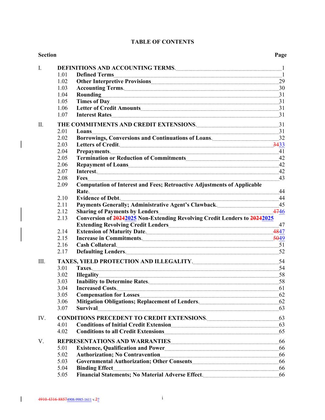 4910-4316-88574908-9985-1611 v.27 i TABLE OF CONTENTS Section Page I. DEFINITIONS AND ACCOUNTING TERMS. 1 1.01 Defined Terms 1 1.02 Other Interpretive Provisions 29 1.03 Accounting Terms. 30 1.04 Rounding 31 1.05 Times of Day 31 1.06 Letter of Credit Amounts 31 1.07 Interest Rates 31 II. THE COMMITMENTS AND CREDIT EXTENSIONS. 31 2.01 Loans 31 2.02 Borrowings, Conversions and Continuations of Loans. 32 2.03 Letters of Credit. 3433 2.04 Prepayments. 41 2.05 Termination or Reduction of Commitments 42 2.06 Repayment of Loans 42 2.07 Interest. 42 2.08 Fees 43 2.09 Computation of Interest and Fees; Retroactive Adjustments of Applicable Rate. 44 2.10 Evidence of Debt. 44 2.11 Payments Generally; Administrative Agent’s Clawback. 45 2.12 Sharing of Payments by Lenders 4746 2.13 Conversion of 20242025 Non-Extending Revolving Credit Lenders to 20242025 Extending Revolving Credit Lenders 47 2.14 Extension of Maturity Date. 4847 2.15 Increase in Commitments. 5049 2.16 Cash Collateral. 51 2.17 Defaulting Lenders. 52 III. TAXES, YIELD PROTECTION AND ILLEGALITY. 54 3.01 Taxes. 54 3.02 Illegality 58 3.03 Inability to Determine Rates. 58 3.04 Increased Costs. 61 3.05 Compensation for Losses 62 3.06 Mitigation Obligations; Replacement of Lenders. 62 3.07 Survival 63 IV. CONDITIONS PRECEDENT TO CREDIT EXTENSIONS. 63 4.01 Conditions of Initial Credit Extension 63 4.02 Conditions to all Credit Extensions 65 V. REPRESENTATIONS AND WARRANTIES 66 5.01 Existence, Qualification and Power 66 5.02 Authorization; No Contravention 66 5.03 Governmental Authorization; Other Consents 66 5.04 Binding Effect 66 5.05 Financial Statements; No Material Adverse Effect. 66