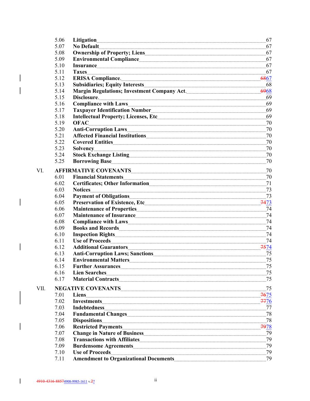 4910-4316-88574908-9985-1611 v.27 ii 5.06 Litigation 67 5.07 No Default 67 5.08 Ownership of Property; Liens 67 5.09 Environmental Compliance 67 5.10 Insurance 67 5.11 Taxes 67 5.12 ERISA Compliance. 6867 5.13 Subsidiaries; Equity Interests 68 5.14 Margin Regulations; Investment Company Act. 6968 5.15 Disclosure. 69 5.16 Compliance with Laws 69 5.17 Taxpayer Identification Number 69 5.18 Intellectual Property; Licenses, Etc 69 5.19 OFAC 70 5.20 Anti-Corruption Laws 70 5.21 Affected Financial Institutions 70 5.22 Covered Entities 70 5.23 Solvency 70 5.24 Stock Exchange Listing 70 5.25 Borrowing Base 70 VI. AFFIRMATIVE COVENANTS 70 6.01 Financial Statements 70 6.02 Certificates; Other Information 71 6.03 Notices 73 6.04 Payment of Obligations 73 6.05 Preservation of Existence, Etc 7473 6.06 Maintenance of Properties 74 6.07 Maintenance of Insurance 74 6.08 Compliance with Laws 74 6.09 Books and Records 74 6.10 Inspection Rights 74 6.11 Use of Proceeds 74 6.12 Additional Guarantors 7574 6.13 Anti-Corruption Laws; Sanctions 75 6.14 Environmental Matters 75 6.15 Further Assurances 75 6.16 Lien Searches 75 6.17 Material Contracts 75 VII. NEGATIVE COVENANTS 75 7.01 Liens 7675 7.02 Investments 7776 7.03 Indebtedness 77 7.04 Fundamental Changes 78 7.05 Dispositions 78 7.06 Restricted Payments 7978 7.07 Change in Nature of Business 79 7.08 Transactions with Affiliates 79 7.09 Burdensome Agreements 79 7.10 Use of Proceeds 79 7.11 Amendment to Organizational Documents 79