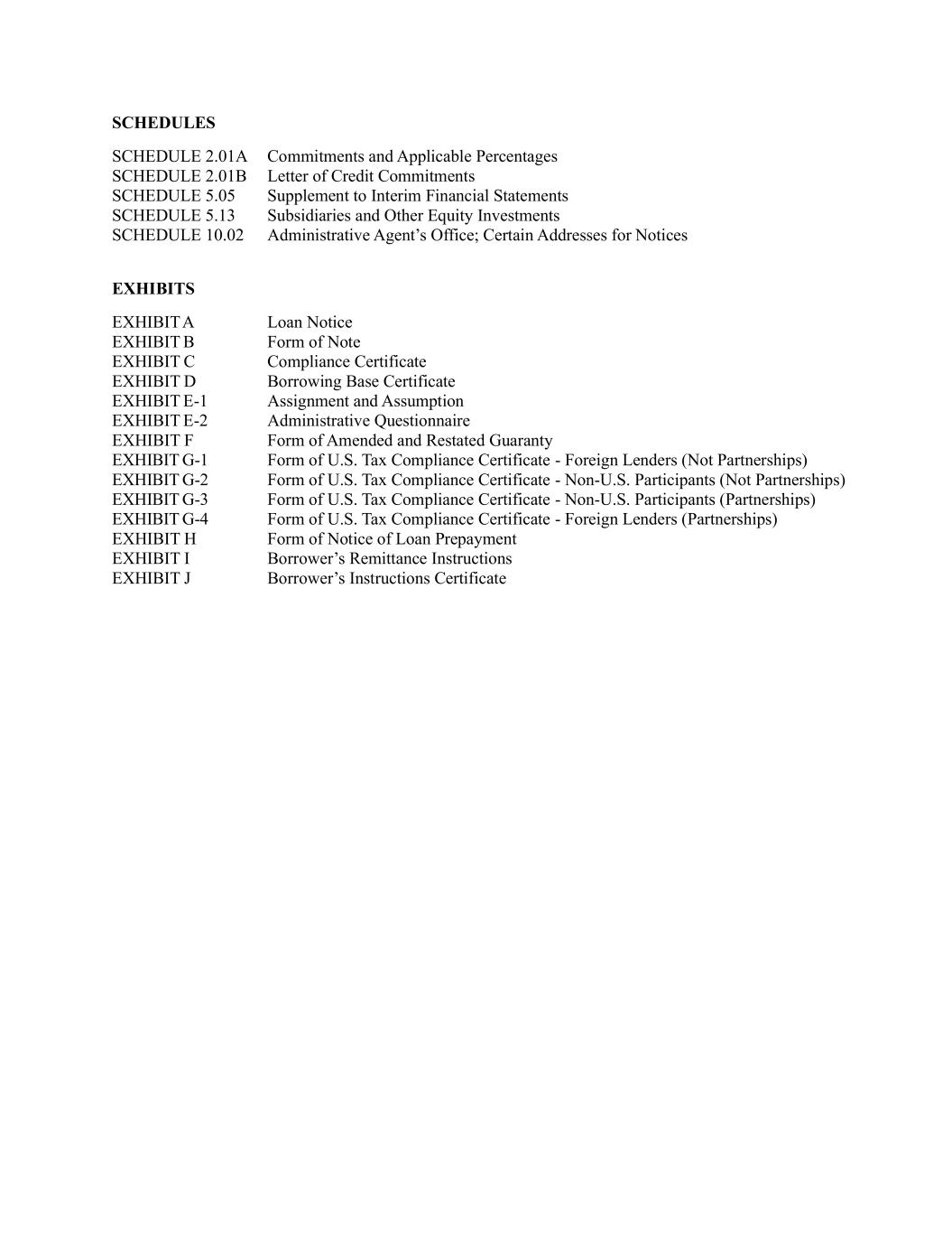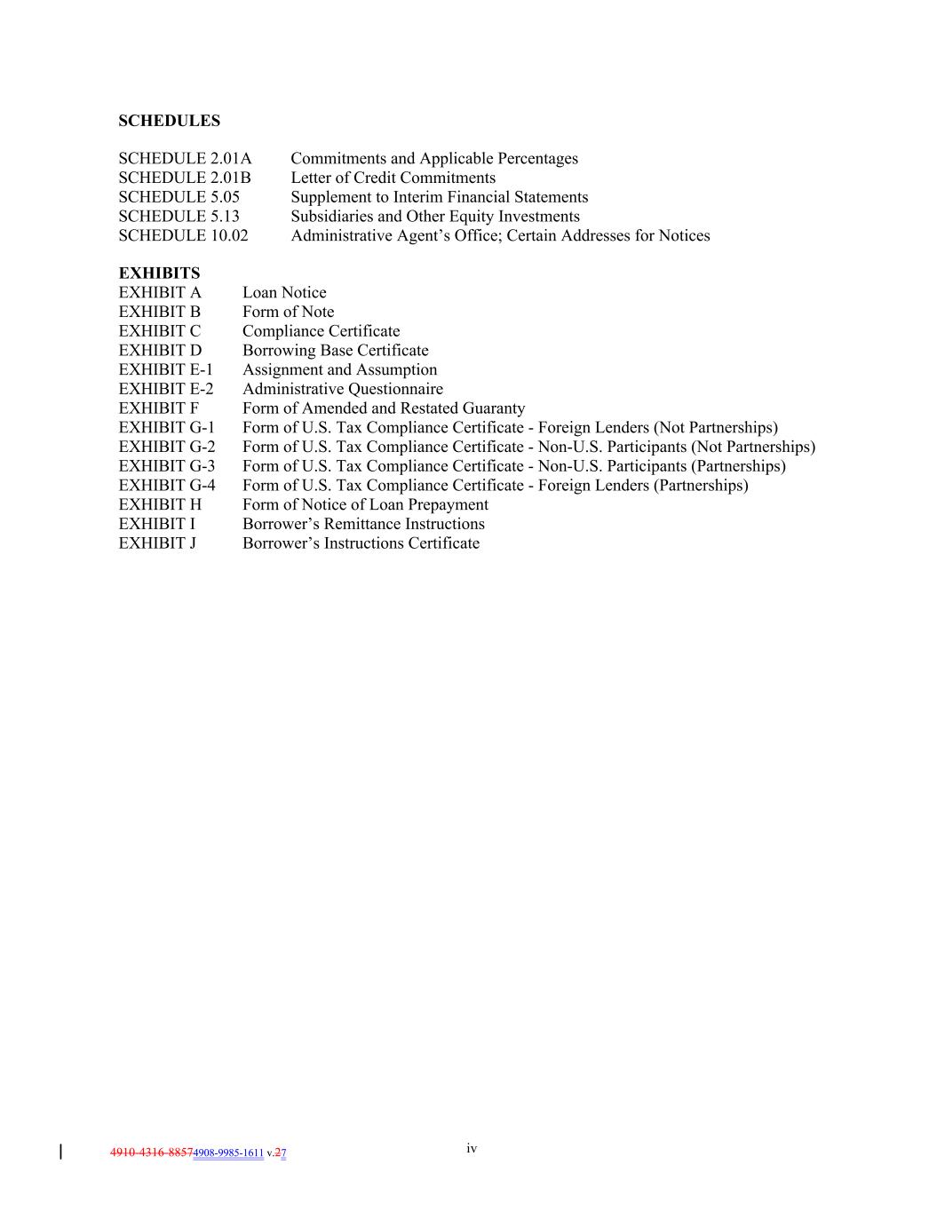 SCHEDULES SCHEDULE 2.01A Commitments and Applicable Percentages SCHEDULE 2.01B Letter of Credit Commitments SCHEDULE 5.05 Supplement to Interim Financial Statements SCHEDULE 5.13 Subsidiaries and Other Equity Investments SCHEDULE 10.02 Administrative Agent’s Office; Certain Addresses for Notices EXHIBITS EXHIBIT A Loan Notice EXHIBIT B Form of Note EXHIBIT C Compliance Certificate EXHIBIT D Borrowing Base Certificate EXHIBIT E-1 Assignment and Assumption EXHIBIT E-2 Administrative Questionnaire EXHIBIT F Form of Amended and Restated Guaranty EXHIBIT G-1 Form of U.S. Tax Compliance Certificate - Foreign Lenders (Not Partnerships) EXHIBIT G-2 Form of U.S. Tax Compliance Certificate - Non-U.S. Participants (Not Partnerships) EXHIBIT G-3 Form of U.S. Tax Compliance Certificate - Non-U.S. Participants (Partnerships) EXHIBIT G-4 Form of U.S. Tax Compliance Certificate - Foreign Lenders (Partnerships) EXHIBIT H Form of Notice of Loan Prepayment EXHIBIT I Borrower’s Remittance Instructions EXHIBIT J Borrower’s Instructions Certificate