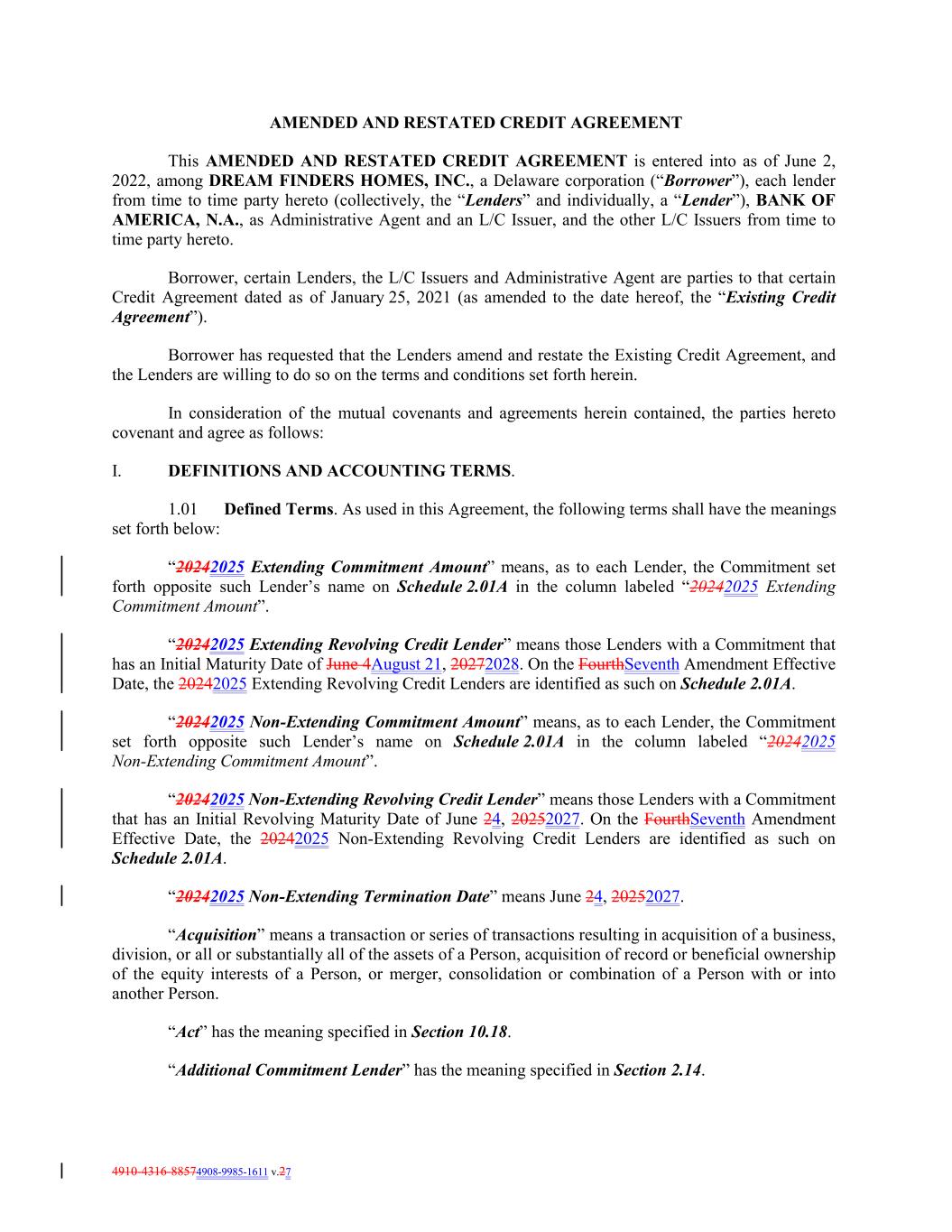 4910-4316-88574908-9985-1611 v.27 AMENDED AND RESTATED CREDIT AGREEMENT This AMENDED AND RESTATED CREDIT AGREEMENT is entered into as of June 2, 2022, among DREAM FINDERS HOMES, INC., a Delaware corporation (“Borrower”), each lender from time to time party hereto (collectively, the “Lenders” and individually, a “Lender”), BANK OF AMERICA, N.A., as Administrative Agent and an L/C Issuer, and the other L/C Issuers from time to time party hereto. Borrower, certain Lenders, the L/C Issuers and Administrative Agent are parties to that certain Credit Agreement dated as of January 25, 2021 (as amended to the date hereof, the “Existing Credit Agreement”). Borrower has requested that the Lenders amend and restate the Existing Credit Agreement, and the Lenders are willing to do so on the terms and conditions set forth herein. In consideration of the mutual covenants and agreements herein contained, the parties hereto covenant and agree as follows: I. DEFINITIONS AND ACCOUNTING TERMS. 1.01 Defined Terms. As used in this Agreement, the following terms shall have the meanings set forth below: “20242025 Extending Commitment Amount” means, as to each Lender, the Commitment set forth opposite such Lender’s name on Schedule 2.01A in the column labeled “20242025 Extending Commitment Amount”. “20242025 Extending Revolving Credit Lender” means those Lenders with a Commitment that has an Initial Maturity Date of June 4August 21, 20272028. On the FourthSeventh Amendment Effective Date, the 20242025 Extending Revolving Credit Lenders are identified as such on Schedule 2.01A. “20242025 Non-Extending Commitment Amount” means, as to each Lender, the Commitment set forth opposite such Lender’s name on Schedule 2.01A in the column labeled “20242025 Non-Extending Commitment Amount”. “20242025 Non-Extending Revolving Credit Lender” means those Lenders with a Commitment that has an Initial Revolving Maturity Date of June 24, 20252027. On the FourthSeventh Amendment Effective Date, the 20242025 Non-Extending Revolving Credit Lenders are identified as such on Schedule 2.01A. “20242025 Non-Extending Termination Date” means June 24, 20252027. “Acquisition” means a transaction or series of transactions resulting in acquisition of a business, division, or all or substantially all of the assets of a Person, acquisition of record or beneficial ownership of the equity interests of a Person, or merger, consolidation or combination of a Person with or into another Person. “Act” has the meaning specified in Section 10.18. “Additional Commitment Lender” has the meaning specified in Section 2.14.