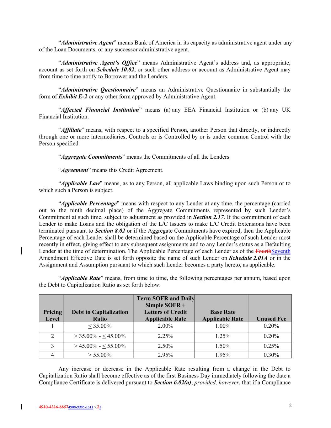4910-4316-88574908-9985-1611 v.27 2 3 < 35.00% > 45.00% - < 55.00% “Administrative Agent” means Bank of America in its capacity as administrative agent under any of the Loan Documents, or any successor administrative agent. “Administrative Agent’s Office” means Administrative Agent’s address and, as appropriate, account as set forth on Schedule 10.02, or such other address or account as Administrative Agent may from time to time notify to Borrower and the Lenders. “Administrative Questionnaire” means an Administrative Questionnaire in substantially the form of Exhibit E-2 or any other form approved by Administrative Agent. “Affected Financial Institution” means (a) any EEA Financial Institution or (b) any UK Financial Institution. “Affiliate” means, with respect to a specified Person, another Person that directly, or indirectly through one or more intermediaries, Controls or is Controlled by or is under common Control with the Person specified. “Aggregate Commitments” means the Commitments of all the Lenders. “Agreement” means this Credit Agreement. “Applicable Law” means, as to any Person, all applicable Laws binding upon such Person or to which such a Person is subject. “Applicable Percentage” means with respect to any Lender at any time, the percentage (carried out to the ninth decimal place) of the Aggregate Commitments represented by such Lender’s Commitment at such time, subject to adjustment as provided in Section 2.17. If the commitment of each Lender to make Loans and the obligation of the L/C Issuers to make L/C Credit Extensions have been terminated pursuant to Section 8.02 or if the Aggregate Commitments have expired, then the Applicable Percentage of each Lender shall be determined based on the Applicable Percentage of such Lender most recently in effect, giving effect to any subsequent assignments and to any Lender’s status as a Defaulting Lender at the time of determination. The Applicable Percentage of each Lender as of the FourthSeventh Amendment Effective Date is set forth opposite the name of such Lender on Schedule 2.01A or in the Assignment and Assumption pursuant to which such Lender becomes a party hereto, as applicable. “Applicable Rate” means, from time to time, the following percentages per annum, based upon the Debt to Capitalization Ratio as set forth below: 2.50% 2.00% 1.50% Term SOFR and Daily Simple SOFR + Letters of Credit Applicable Rate 0.25% 1.00% 4 0.20% > 55.00% Base Rate Applicable Rate 2.95% 1.95% 0.30% 2 Unused Fee > 35.00% - < 45.00% Pricing Level 2.25% 1.25% Any increase or decrease in the Applicable Rate resulting from a change in the Debt to Capitalization Ratio shall become effective as of the first Business Day immediately following the date a Compliance Certificate is delivered pursuant to Section 6.02(a); provided, however, that if a Compliance 0.20% 1 Debt to Capitalization Ratio