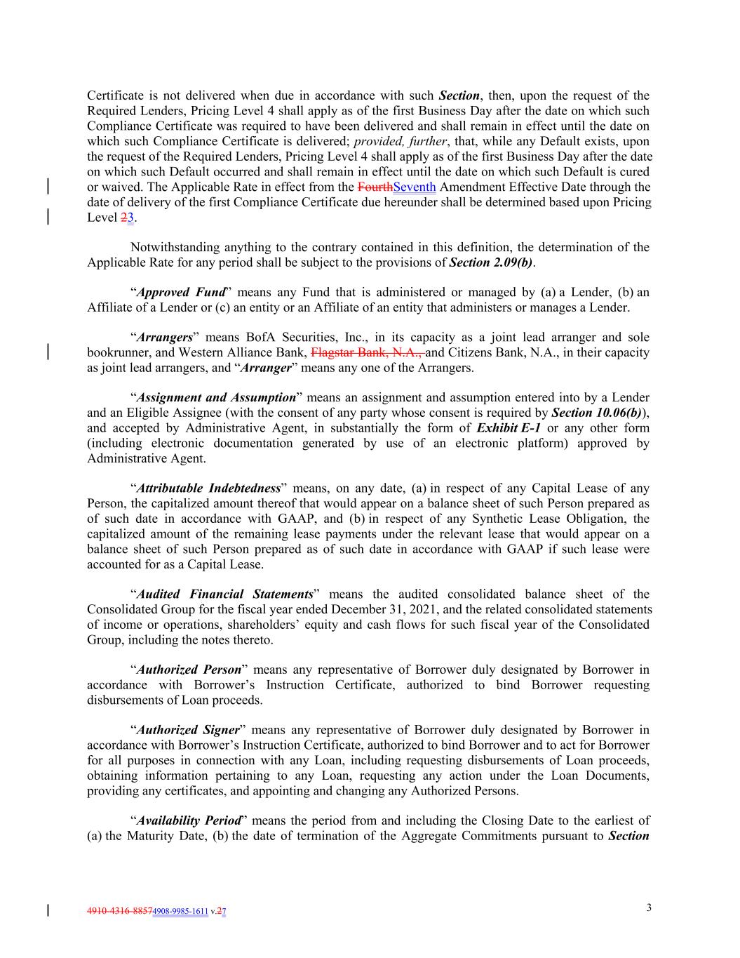 4910-4316-88574908-9985-1611 v.27 3 Certificate is not delivered when due in accordance with such Section, then, upon the request of the Required Lenders, Pricing Level 4 shall apply as of the first Business Day after the date on which such Compliance Certificate was required to have been delivered and shall remain in effect until the date on which such Compliance Certificate is delivered; provided, further, that, while any Default exists, upon the request of the Required Lenders, Pricing Level 4 shall apply as of the first Business Day after the date on which such Default occurred and shall remain in effect until the date on which such Default is cured or waived. The Applicable Rate in effect from the FourthSeventh Amendment Effective Date through the date of delivery of the first Compliance Certificate due hereunder shall be determined based upon Pricing Level 23. Notwithstanding anything to the contrary contained in this definition, the determination of the Applicable Rate for any period shall be subject to the provisions of Section 2.09(b). “Approved Fund” means any Fund that is administered or managed by (a) a Lender, (b) an Affiliate of a Lender or (c) an entity or an Affiliate of an entity that administers or manages a Lender. “Arrangers” means BofA Securities, Inc., in its capacity as a joint lead arranger and sole bookrunner, and Western Alliance Bank, Flagstar Bank, N.A., and Citizens Bank, N.A., in their capacity as joint lead arrangers, and “Arranger” means any one of the Arrangers. “Assignment and Assumption” means an assignment and assumption entered into by a Lender and an Eligible Assignee (with the consent of any party whose consent is required by Section 10.06(b)), and accepted by Administrative Agent, in substantially the form of Exhibit E-1 or any other form (including electronic documentation generated by use of an electronic platform) approved by Administrative Agent. “Attributable Indebtedness” means, on any date, (a) in respect of any Capital Lease of any Person, the capitalized amount thereof that would appear on a balance sheet of such Person prepared as of such date in accordance with GAAP, and (b) in respect of any Synthetic Lease Obligation, the capitalized amount of the remaining lease payments under the relevant lease that would appear on a balance sheet of such Person prepared as of such date in accordance with GAAP if such lease were accounted for as a Capital Lease. “Audited Financial Statements” means the audited consolidated balance sheet of the Consolidated Group for the fiscal year ended December 31, 2021, and the related consolidated statements of income or operations, shareholders’ equity and cash flows for such fiscal year of the Consolidated Group, including the notes thereto. “Authorized Person” means any representative of Borrower duly designated by Borrower in accordance with Borrower’s Instruction Certificate, authorized to bind Borrower requesting disbursements of Loan proceeds. “Authorized Signer” means any representative of Borrower duly designated by Borrower in accordance with Borrower’s Instruction Certificate, authorized to bind Borrower and to act for Borrower for all purposes in connection with any Loan, including requesting disbursements of Loan proceeds, obtaining information pertaining to any Loan, requesting any action under the Loan Documents, providing any certificates, and appointing and changing any Authorized Persons. “Availability Period” means the period from and including the Closing Date to the earliest of (a) the Maturity Date, (b) the date of termination of the Aggregate Commitments pursuant to Section
