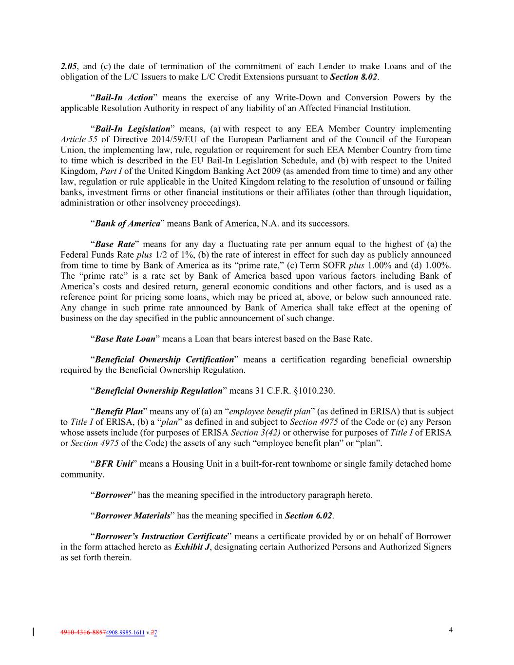 4910-4316-88574908-9985-1611 v.27 4 2.05, and (c) the date of termination of the commitment of each Lender to make Loans and of the obligation of the L/C Issuers to make L/C Credit Extensions pursuant to Section 8.02. “Bail-In Action” means the exercise of any Write-Down and Conversion Powers by the applicable Resolution Authority in respect of any liability of an Affected Financial Institution. “Bail-In Legislation” means, (a) with respect to any EEA Member Country implementing Article 55 of Directive 2014/59/EU of the European Parliament and of the Council of the European Union, the implementing law, rule, regulation or requirement for such EEA Member Country from time to time which is described in the EU Bail-In Legislation Schedule, and (b) with respect to the United Kingdom, Part I of the United Kingdom Banking Act 2009 (as amended from time to time) and any other law, regulation or rule applicable in the United Kingdom relating to the resolution of unsound or failing banks, investment firms or other financial institutions or their affiliates (other than through liquidation, administration or other insolvency proceedings). “Bank of America” means Bank of America, N.A. and its successors. “Base Rate” means for any day a fluctuating rate per annum equal to the highest of (a) the Federal Funds Rate plus 1/2 of 1%, (b) the rate of interest in effect for such day as publicly announced from time to time by Bank of America as its “prime rate,” (c) Term SOFR plus 1.00% and (d) 1.00%. The “prime rate” is a rate set by Bank of America based upon various factors including Bank of America’s costs and desired return, general economic conditions and other factors, and is used as a reference point for pricing some loans, which may be priced at, above, or below such announced rate. Any change in such prime rate announced by Bank of America shall take effect at the opening of business on the day specified in the public announcement of such change. “Base Rate Loan” means a Loan that bears interest based on the Base Rate. “Beneficial Ownership Certification” means a certification regarding beneficial ownership required by the Beneficial Ownership Regulation. “Beneficial Ownership Regulation” means 31 C.F.R. §1010.230. “Benefit Plan” means any of (a) an “employee benefit plan” (as defined in ERISA) that is subject to Title I of ERISA, (b) a “plan” as defined in and subject to Section 4975 of the Code or (c) any Person whose assets include (for purposes of ERISA Section 3(42) or otherwise for purposes of Title I of ERISA or Section 4975 of the Code) the assets of any such “employee benefit plan” or “plan”. “BFR Unit” means a Housing Unit in a built-for-rent townhome or single family detached home community. “Borrower” has the meaning specified in the introductory paragraph hereto. “Borrower Materials” has the meaning specified in Section 6.02. “Borrower’s Instruction Certificate” means a certificate provided by or on behalf of Borrower in the form attached hereto as Exhibit J, designating certain Authorized Persons and Authorized Signers as set forth therein.