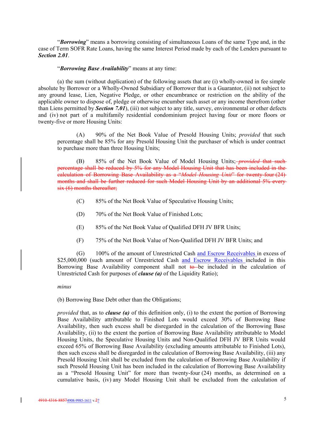 4910-4316-88574908-9985-1611 v.27 5 “Borrowing” means a borrowing consisting of simultaneous Loans of the same Type and, in the case of Term SOFR Rate Loans, having the same Interest Period made by each of the Lenders pursuant to Section 2.01. “Borrowing Base Availability” means at any time: (a) the sum (without duplication) of the following assets that are (i) wholly-owned in fee simple absolute by Borrower or a Wholly-Owned Subsidiary of Borrower that is a Guarantor, (ii) not subject to any ground lease, Lien, Negative Pledge, or other encumbrance or restriction on the ability of the applicable owner to dispose of, pledge or otherwise encumber such asset or any income therefrom (other than Liens permitted by Section 7.01), (iii) not subject to any title, survey, environmental or other defects and (iv) not part of a multifamily residential condominium project having four or more floors or twenty-five or more Housing Units: (A) 90% of the Net Book Value of Presold Housing Units; provided that such percentage shall be 85% for any Presold Housing Unit the purchaser of which is under contract to purchase more than three Housing Units; (B) 85% of the Net Book Value of Model Housing Units; provided that such percentage shall be reduced by 5% for any Model Housing Unit that has been included in the calculation of Borrowing Base Availability as a “Model Housing Unit” for twenty-four (24) months and shall be further reduced for such Model Housing Unit by an additional 5% every six (6) months thereafter; (C) 85% of the Net Book Value of Speculative Housing Units; (D) 70% of the Net Book Value of Finished Lots; (E) 85% of the Net Book Value of Qualified DFH JV BFR Units; (F) 75% of the Net Book Value of Non-Qualified DFH JV BFR Units; and (G) 100% of the amount of Unrestricted Cash and Escrow Receivables in excess of $25,000,000 (such amount of Unrestricted Cash and Escrow Receivables included in this Borrowing Base Availability component shall not to be included in the calculation of Unrestricted Cash for purposes of clause (a) of the Liquidity Ratio); minus (b) Borrowing Base Debt other than the Obligations; provided that, as to clause (a) of this definition only, (i) to the extent the portion of Borrowing Base Availability attributable to Finished Lots would exceed 30% of Borrowing Base Availability, then such excess shall be disregarded in the calculation of the Borrowing Base Availability, (ii) to the extent the portion of Borrowing Base Availability attributable to Model Housing Units, the Speculative Housing Units and Non-Qualified DFH JV BFR Units would exceed 65% of Borrowing Base Availability (excluding amounts attributable to Finished Lots), then such excess shall be disregarded in the calculation of Borrowing Base Availability, (iii) any Presold Housing Unit shall be excluded from the calculation of Borrowing Base Availability if such Presold Housing Unit has been included in the calculation of Borrowing Base Availability as a “Presold Housing Unit” for more than twenty-four (24) months, as determined on a cumulative basis, (iv) any Model Housing Unit shall be excluded from the calculation of