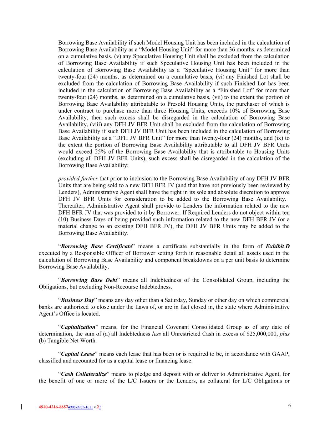 4910-4316-88574908-9985-1611 v.27 6 Borrowing Base Availability if such Model Housing Unit has been included in the calculation of Borrowing Base Availability as a “Model Housing Unit” for more than 36 months, as determined on a cumulative basis, (v) any Speculative Housing Unit shall be excluded from the calculation of Borrowing Base Availability if such Speculative Housing Unit has been included in the calculation of Borrowing Base Availability as a “Speculative Housing Unit” for more than twenty-four (24) months, as determined on a cumulative basis, (vi) any Finished Lot shall be excluded from the calculation of Borrowing Base Availability if such Finished Lot has been included in the calculation of Borrowing Base Availability as a “Finished Lot” for more than twenty-four (24) months, as determined on a cumulative basis, (vii) to the extent the portion of Borrowing Base Availability attributable to Presold Housing Units, the purchaser of which is under contract to purchase more than three Housing Units, exceeds 10% of Borrowing Base Availability, then such excess shall be disregarded in the calculation of Borrowing Base Availability, (viii) any DFH JV BFR Unit shall be excluded from the calculation of Borrowing Base Availability if such DFH JV BFR Unit has been included in the calculation of Borrowing Base Availability as a “DFH JV BFR Unit” for more than twenty-four (24) months, and (ix) to the extent the portion of Borrowing Base Availability attributable to all DFH JV BFR Units would exceed 25% of the Borrowing Base Availability that is attributable to Housing Units (excluding all DFH JV BFR Units), such excess shall be disregarded in the calculation of the Borrowing Base Availability; provided further that prior to inclusion to the Borrowing Base Availability of any DFH JV BFR Units that are being sold to a new DFH BFR JV (and that have not previously been reviewed by Lenders), Administrative Agent shall have the right in its sole and absolute discretion to approve DFH JV BFR Units for consideration to be added to the Borrowing Base Availability. Thereafter, Administrative Agent shall provide to Lenders the information related to the new DFH BFR JV that was provided to it by Borrower. If Required Lenders do not object within ten (10) Business Days of being provided such information related to the new DFH BFR JV (or a material change to an existing DFH BFR JV), the DFH JV BFR Units may be added to the Borrowing Base Availability. “Borrowing Base Certificate” means a certificate substantially in the form of Exhibit D executed by a Responsible Officer of Borrower setting forth in reasonable detail all assets used in the calculation of Borrowing Base Availability and component breakdowns on a per unit basis to determine Borrowing Base Availability. “Borrowing Base Debt” means all Indebtedness of the Consolidated Group, including the Obligations, but excluding Non-Recourse Indebtedness. “Business Day” means any day other than a Saturday, Sunday or other day on which commercial banks are authorized to close under the Laws of, or are in fact closed in, the state where Administrative Agent’s Office is located. “Capitalization” means, for the Financial Covenant Consolidated Group as of any date of determination, the sum of (a) all Indebtedness less all Unrestricted Cash in excess of $25,000,000, plus (b) Tangible Net Worth. “Capital Lease” means each lease that has been or is required to be, in accordance with GAAP, classified and accounted for as a capital lease or financing lease. “Cash Collateralize” means to pledge and deposit with or deliver to Administrative Agent, for the benefit of one or more of the L/C Issuers or the Lenders, as collateral for L/C Obligations or