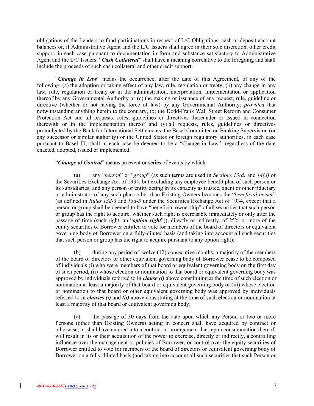4910-4316-88574908-9985-1611 v.27 7 obligations of the Lenders to fund participations in respect of L/C Obligations, cash or deposit account balances or, if Administrative Agent and the L/C Issuers shall agree in their sole discretion, other credit support, in each case pursuant to documentation in form and substance satisfactory to Administrative Agent and the L/C Issuers. “Cash Collateral” shall have a meaning correlative to the foregoing and shall include the proceeds of such cash collateral and other credit support. “Change in Law” means the occurrence, after the date of this Agreement, of any of the following: (a) the adoption or taking effect of any law, rule, regulation or treaty, (b) any change in any law, rule, regulation or treaty or in the administration, interpretation, implementation or application thereof by any Governmental Authority or (c) the making or issuance of any request, rule, guideline or directive (whether or not having the force of law) by any Governmental Authority; provided that notwithstanding anything herein to the contrary, (x) the Dodd-Frank Wall Street Reform and Consumer Protection Act and all requests, rules, guidelines or directives thereunder or issued in connection therewith or in the implementation thereof and (y) all requests, rules, guidelines or directives promulgated by the Bank for International Settlements, the Basel Committee on Banking Supervision (or any successor or similar authority) or the United States or foreign regulatory authorities, in each case pursuant to Basel III, shall in each case be deemed to be a “Change in Law”, regardless of the date enacted, adopted, issued or implemented. “Change of Control” means an event or series of events by which: (a) any “person” or “group” (as such terms are used in Sections 13(d) and 14(d) of the Securities Exchange Act of 1934, but excluding any employee benefit plan of such person or its subsidiaries, and any person or entity acting in its capacity as trustee, agent or other fiduciary or administrator of any such plan) other than Existing Owners becomes the “beneficial owner” (as defined in Rules 13d-3 and 13d-5 under the Securities Exchange Act of 1934, except that a person or group shall be deemed to have “beneficial ownership” of all securities that such person or group has the right to acquire, whether such right is exercisable immediately or only after the passage of time (such right, an “option right”)), directly or indirectly, of 25% or more of the equity securities of Borrower entitled to vote for members of the board of directors or equivalent governing body of Borrower on a fully-diluted basis (and taking into account all such securities that such person or group has the right to acquire pursuant to any option right); (b) during any period of twelve (12) consecutive months, a majority of the members of the board of directors or other equivalent governing body of Borrower cease to be composed of individuals (i) who were members of that board or equivalent governing body on the first day of such period, (ii) whose election or nomination to that board or equivalent governing body was approved by individuals referred to in clause (i) above constituting at the time of such election or nomination at least a majority of that board or equivalent governing body or (iii) whose election or nomination to that board or other equivalent governing body was approved by individuals referred to in clauses (i) and (ii) above constituting at the time of such election or nomination at least a majority of that board or equivalent governing body; (c) the passage of 30 days from the date upon which any Person or two or more Persons (other than Existing Owners) acting in concert shall have acquired by contract or otherwise, or shall have entered into a contract or arrangement that, upon consummation thereof, will result in its or their acquisition of the power to exercise, directly or indirectly, a controlling influence over the management or policies of Borrower, or control over the equity securities of Borrower entitled to vote for members of the board of directors or equivalent governing body of Borrower on a fully-diluted basis (and taking into account all such securities that such Person or