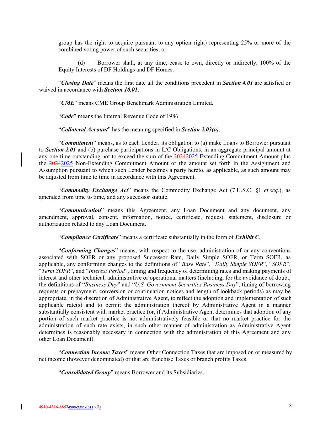 4910-4316-88574908-9985-1611 v.27 8 group has the right to acquire pursuant to any option right) representing 25% or more of the combined voting power of such securities; or (d) Borrower shall, at any time, cease to own, directly or indirectly, 100% of the Equity Interests of DF Holdings and DF Homes. “Closing Date” means the first date all the conditions precedent in Section 4.01 are satisfied or waived in accordance with Section 10.01. “CME” means CME Group Benchmark Administration Limited. “Code” means the Internal Revenue Code of 1986. “Collateral Account” has the meaning specified in Section 2.03(o). “Commitment” means, as to each Lender, its obligation to (a) make Loans to Borrower pursuant to Section 2.01 and (b) purchase participations in L/C Obligations, in an aggregate principal amount at any one time outstanding not to exceed the sum of the 20242025 Extending Commitment Amount plus the 20242025 Non-Extending Commitment Amount or the amount set forth in the Assignment and Assumption pursuant to which such Lender becomes a party hereto, as applicable, as such amount may be adjusted from time to time in accordance with this Agreement. “Commodity Exchange Act” means the Commodity Exchange Act (7 U.S.C. §1 et seq.), as amended from time to time, and any successor statute. “Communication” means this Agreement, any Loan Document and any document, any amendment, approval, consent, information, notice, certificate, request, statement, disclosure or authorization related to any Loan Document. “Compliance Certificate” means a certificate substantially in the form of Exhibit C. “Conforming Changes” means, with respect to the use, administration of or any conventions associated with SOFR or any proposed Successor Rate, Daily Simple SOFR, or Term SOFR, as applicable, any conforming changes to the definitions of “Base Rate”, “Daily Simple SOFR”, “SOFR”, “Term SOFR”, and “Interest Period”, timing and frequency of determining rates and making payments of interest and other technical, administrative or operational matters (including, for the avoidance of doubt, the definitions of “Business Day” and “U.S. Government Securities Business Day”, timing of borrowing requests or prepayment, conversion or continuation notices and length of lookback periods) as may be appropriate, in the discretion of Administrative Agent, to reflect the adoption and implementation of such applicable rate(s) and to permit the administration thereof by Administrative Agent in a manner substantially consistent with market practice (or, if Administrative Agent determines that adoption of any portion of such market practice is not administratively feasible or that no market practice for the administration of such rate exists, in such other manner of administration as Administrative Agent determines is reasonably necessary in connection with the administration of this Agreement and any other Loan Document). “Connection Income Taxes” means Other Connection Taxes that are imposed on or measured by net income (however denominated) or that are franchise Taxes or branch profits Taxes. “Consolidated Group” means Borrower and its Subsidiaries.