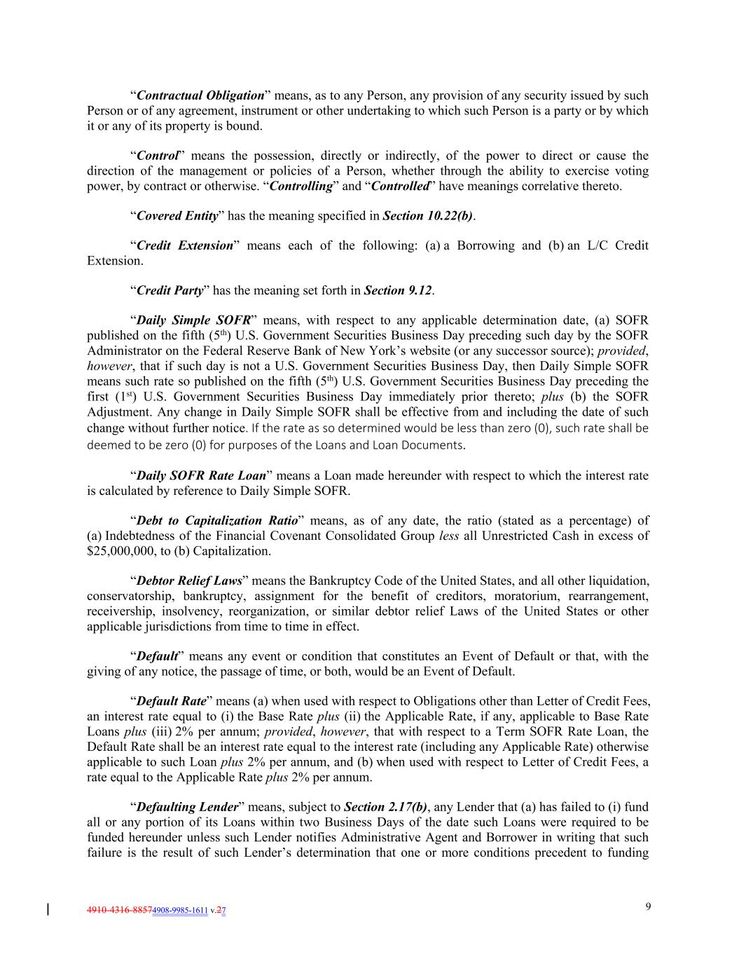 4910-4316-88574908-9985-1611 v.27 9 “Contractual Obligation” means, as to any Person, any provision of any security issued by such Person or of any agreement, instrument or other undertaking to which such Person is a party or by which it or any of its property is bound. “Control” means the possession, directly or indirectly, of the power to direct or cause the direction of the management or policies of a Person, whether through the ability to exercise voting power, by contract or otherwise. “Controlling” and “Controlled” have meanings correlative thereto. “Covered Entity” has the meaning specified in Section 10.22(b). “Credit Extension” means each of the following: (a) a Borrowing and (b) an L/C Credit Extension. “Credit Party” has the meaning set forth in Section 9.12. “Daily Simple SOFR” means, with respect to any applicable determination date, (a) SOFR published on the fifth (5th) U.S. Government Securities Business Day preceding such day by the SOFR Administrator on the Federal Reserve Bank of New York’s website (or any successor source); provided, however, that if such day is not a U.S. Government Securities Business Day, then Daily Simple SOFR means such rate so published on the fifth (5th) U.S. Government Securities Business Day preceding the first (1st) U.S. Government Securities Business Day immediately prior thereto; plus (b) the SOFR Adjustment. Any change in Daily Simple SOFR shall be effective from and including the date of such change without further notice. If the rate as so determined would be less than zero (0), such rate shall be deemed to be zero (0) for purposes of the Loans and Loan Documents. “Daily SOFR Rate Loan” means a Loan made hereunder with respect to which the interest rate is calculated by reference to Daily Simple SOFR. “Debt to Capitalization Ratio” means, as of any date, the ratio (stated as a percentage) of (a) Indebtedness of the Financial Covenant Consolidated Group less all Unrestricted Cash in excess of $25,000,000, to (b) Capitalization. “Debtor Relief Laws” means the Bankruptcy Code of the United States, and all other liquidation, conservatorship, bankruptcy, assignment for the benefit of creditors, moratorium, rearrangement, receivership, insolvency, reorganization, or similar debtor relief Laws of the United States or other applicable jurisdictions from time to time in effect. “Default” means any event or condition that constitutes an Event of Default or that, with the giving of any notice, the passage of time, or both, would be an Event of Default. “Default Rate” means (a) when used with respect to Obligations other than Letter of Credit Fees, an interest rate equal to (i) the Base Rate plus (ii) the Applicable Rate, if any, applicable to Base Rate Loans plus (iii) 2% per annum; provided, however, that with respect to a Term SOFR Rate Loan, the Default Rate shall be an interest rate equal to the interest rate (including any Applicable Rate) otherwise applicable to such Loan plus 2% per annum, and (b) when used with respect to Letter of Credit Fees, a rate equal to the Applicable Rate plus 2% per annum. “Defaulting Lender” means, subject to Section 2.17(b), any Lender that (a) has failed to (i) fund all or any portion of its Loans within two Business Days of the date such Loans were required to be funded hereunder unless such Lender notifies Administrative Agent and Borrower in writing that such failure is the result of such Lender’s determination that one or more conditions precedent to funding