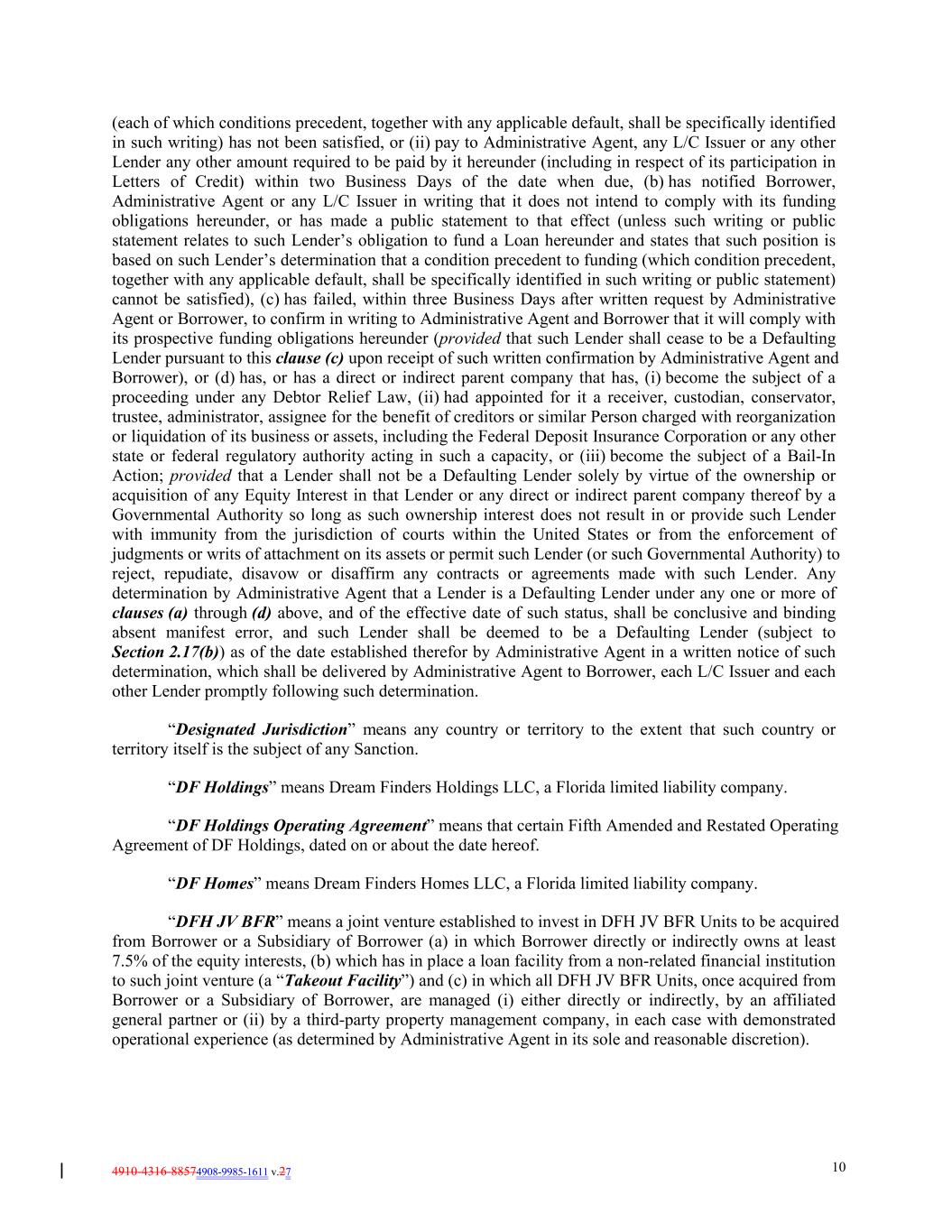 4910-4316-88574908-9985-1611 v.27 10 (each of which conditions precedent, together with any applicable default, shall be specifically identified in such writing) has not been satisfied, or (ii) pay to Administrative Agent, any L/C Issuer or any other Lender any other amount required to be paid by it hereunder (including in respect of its participation in Letters of Credit) within two Business Days of the date when due, (b) has notified Borrower, Administrative Agent or any L/C Issuer in writing that it does not intend to comply with its funding obligations hereunder, or has made a public statement to that effect (unless such writing or public statement relates to such Lender’s obligation to fund a Loan hereunder and states that such position is based on such Lender’s determination that a condition precedent to funding (which condition precedent, together with any applicable default, shall be specifically identified in such writing or public statement) cannot be satisfied), (c) has failed, within three Business Days after written request by Administrative Agent or Borrower, to confirm in writing to Administrative Agent and Borrower that it will comply with its prospective funding obligations hereunder (provided that such Lender shall cease to be a Defaulting Lender pursuant to this clause (c) upon receipt of such written confirmation by Administrative Agent and Borrower), or (d) has, or has a direct or indirect parent company that has, (i) become the subject of a proceeding under any Debtor Relief Law, (ii) had appointed for it a receiver, custodian, conservator, trustee, administrator, assignee for the benefit of creditors or similar Person charged with reorganization or liquidation of its business or assets, including the Federal Deposit Insurance Corporation or any other state or federal regulatory authority acting in such a capacity, or (iii) become the subject of a Bail-In Action; provided that a Lender shall not be a Defaulting Lender solely by virtue of the ownership or acquisition of any Equity Interest in that Lender or any direct or indirect parent company thereof by a Governmental Authority so long as such ownership interest does not result in or provide such Lender with immunity from the jurisdiction of courts within the United States or from the enforcement of judgments or writs of attachment on its assets or permit such Lender (or such Governmental Authority) to reject, repudiate, disavow or disaffirm any contracts or agreements made with such Lender. Any determination by Administrative Agent that a Lender is a Defaulting Lender under any one or more of clauses (a) through (d) above, and of the effective date of such status, shall be conclusive and binding absent manifest error, and such Lender shall be deemed to be a Defaulting Lender (subject to Section 2.17(b)) as of the date established therefor by Administrative Agent in a written notice of such determination, which shall be delivered by Administrative Agent to Borrower, each L/C Issuer and each other Lender promptly following such determination. “Designated Jurisdiction” means any country or territory to the extent that such country or territory itself is the subject of any Sanction. “DF Holdings” means Dream Finders Holdings LLC, a Florida limited liability company. “DF Holdings Operating Agreement” means that certain Fifth Amended and Restated Operating Agreement of DF Holdings, dated on or about the date hereof. “DF Homes” means Dream Finders Homes LLC, a Florida limited liability company. “DFH JV BFR” means a joint venture established to invest in DFH JV BFR Units to be acquired from Borrower or a Subsidiary of Borrower (a) in which Borrower directly or indirectly owns at least 7.5% of the equity interests, (b) which has in place a loan facility from a non-related financial institution to such joint venture (a “Takeout Facility”) and (c) in which all DFH JV BFR Units, once acquired from Borrower or a Subsidiary of Borrower, are managed (i) either directly or indirectly, by an affiliated general partner or (ii) by a third-party property management company, in each case with demonstrated operational experience (as determined by Administrative Agent in its sole and reasonable discretion).