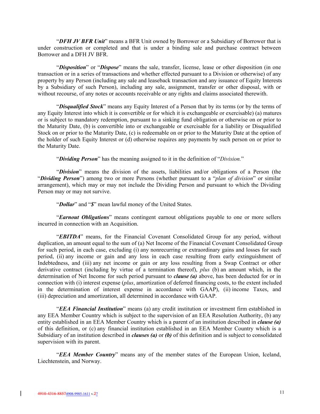 4910-4316-88574908-9985-1611 v.27 11 “DFH JV BFR Unit” means a BFR Unit owned by Borrower or a Subsidiary of Borrower that is under construction or completed and that is under a binding sale and purchase contract between Borrower and a DFH JV BFR. “Disposition” or “Dispose” means the sale, transfer, license, lease or other disposition (in one transaction or in a series of transactions and whether effected pursuant to a Division or otherwise) of any property by any Person (including any sale and leaseback transaction and any issuance of Equity Interests by a Subsidiary of such Person), including any sale, assignment, transfer or other disposal, with or without recourse, of any notes or accounts receivable or any rights and claims associated therewith. “Disqualified Stock” means any Equity Interest of a Person that by its terms (or by the terms of any Equity Interest into which it is convertible or for which it is exchangeable or exercisable) (a) matures or is subject to mandatory redemption, pursuant to a sinking fund obligation or otherwise on or prior to the Maturity Date, (b) is convertible into or exchangeable or exercisable for a liability or Disqualified Stock on or prior to the Maturity Date, (c) is redeemable on or prior to the Maturity Date at the option of the holder of such Equity Interest or (d) otherwise requires any payments by such person on or prior to the Maturity Date. “Dividing Person” has the meaning assigned to it in the definition of “Division.” “Division” means the division of the assets, liabilities and/or obligations of a Person (the “Dividing Person”) among two or more Persons (whether pursuant to a “plan of division” or similar arrangement), which may or may not include the Dividing Person and pursuant to which the Dividing Person may or may not survive. “Dollar” and “$” mean lawful money of the United States. “Earnout Obligations” means contingent earnout obligations payable to one or more sellers incurred in connection with an Acquisition. “EBITDA” means, for the Financial Covenant Consolidated Group for any period, without duplication, an amount equal to the sum of (a) Net Income of the Financial Covenant Consolidated Group for such period, in each case, excluding (i) any nonrecurring or extraordinary gains and losses for such period, (ii) any income or gain and any loss in each case resulting from early extinguishment of Indebtedness, and (iii) any net income or gain or any loss resulting from a Swap Contract or other derivative contract (including by virtue of a termination thereof), plus (b) an amount which, in the determination of Net Income for such period pursuant to clause (a) above, has been deducted for or in connection with (i) interest expense (plus, amortization of deferred financing costs, to the extent included in the determination of interest expense in accordance with GAAP), (ii) income Taxes, and (iii) depreciation and amortization, all determined in accordance with GAAP. “EEA Financial Institution” means (a) any credit institution or investment firm established in any EEA Member Country which is subject to the supervision of an EEA Resolution Authority, (b) any entity established in an EEA Member Country which is a parent of an institution described in clause (a) of this definition, or (c) any financial institution established in an EEA Member Country which is a Subsidiary of an institution described in clauses (a) or (b) of this definition and is subject to consolidated supervision with its parent. “EEA Member Country” means any of the member states of the European Union, Iceland, Liechtenstein, and Norway.