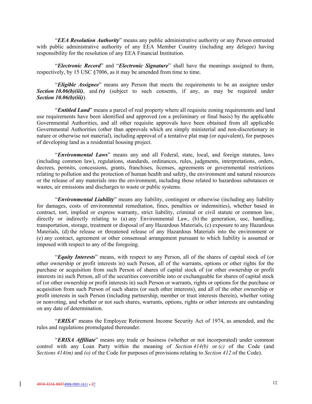 4910-4316-88574908-9985-1611 v.27 12 “EEA Resolution Authority” means any public administrative authority or any Person entrusted with public administrative authority of any EEA Member Country (including any delegee) having responsibility for the resolution of any EEA Financial Institution. “Electronic Record” and “Electronic Signature” shall have the meanings assigned to them, respectively, by 15 USC §7006, as it may be amended from time to time. “Eligible Assignee” means any Person that meets the requirements to be an assignee under Section 10.06(b)(iii), and (v) (subject to such consents, if any, as may be required under Section 10.06(b)(iii)). “Entitled Land” means a parcel of real property where all requisite zoning requirements and land use requirements have been identified and approved (on a preliminary or final basis) by the applicable Governmental Authorities, and all other requisite approvals have been obtained from all applicable Governmental Authorities (other than approvals which are simply ministerial and non-discretionary in nature or otherwise not material), including approval of a tentative plat map (or equivalent), for purposes of developing land as a residential housing project. “Environmental Laws” means any and all Federal, state, local, and foreign statutes, laws (including common law), regulations, standards, ordinances, rules, judgments, interpretations, orders, decrees, permits, concessions, grants, franchises, licenses, agreements or governmental restrictions relating to pollution and the protection of human health and safety, the environment and natural resources or the release of any materials into the environment, including those related to hazardous substances or wastes, air emissions and discharges to waste or public systems. “Environmental Liability” means any liability, contingent or otherwise (including any liability for damages, costs of environmental remediation, fines, penalties or indemnities), whether based in contract, tort, implied or express warranty, strict liability, criminal or civil statute or common law, directly or indirectly relating to (a) any Environmental Law, (b) the generation, use, handling, transportation, storage, treatment or disposal of any Hazardous Materials, (c) exposure to any Hazardous Materials, (d) the release or threatened release of any Hazardous Materials into the environment or (e) any contract, agreement or other consensual arrangement pursuant to which liability is assumed or imposed with respect to any of the foregoing. “Equity Interests” means, with respect to any Person, all of the shares of capital stock of (or other ownership or profit interests in) such Person, all of the warrants, options or other rights for the purchase or acquisition from such Person of shares of capital stock of (or other ownership or profit interests in) such Person, all of the securities convertible into or exchangeable for shares of capital stock of (or other ownership or profit interests in) such Person or warrants, rights or options for the purchase or acquisition from such Person of such shares (or such other interests), and all of the other ownership or profit interests in such Person (including partnership, member or trust interests therein), whether voting or nonvoting, and whether or not such shares, warrants, options, rights or other interests are outstanding on any date of determination. “ERISA” means the Employee Retirement Income Security Act of 1974, as amended, and the rules and regulations promulgated thereunder. “ERISA Affiliate” means any trade or business (whether or not incorporated) under common control with any Loan Party within the meaning of Section 414(b) or (c) of the Code (and Sections 414(m) and (o) of the Code for purposes of provisions relating to Section 412 of the Code).