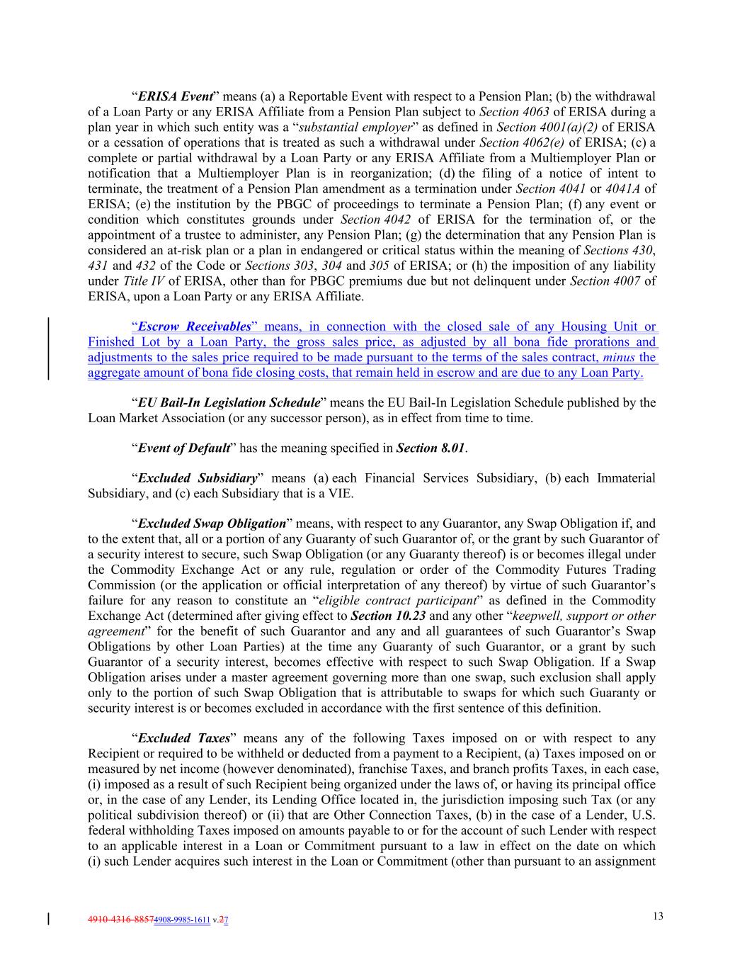 4910-4316-88574908-9985-1611 v.27 13 “ERISA Event” means (a) a Reportable Event with respect to a Pension Plan; (b) the withdrawal of a Loan Party or any ERISA Affiliate from a Pension Plan subject to Section 4063 of ERISA during a plan year in which such entity was a “substantial employer” as defined in Section 4001(a)(2) of ERISA or a cessation of operations that is treated as such a withdrawal under Section 4062(e) of ERISA; (c) a complete or partial withdrawal by a Loan Party or any ERISA Affiliate from a Multiemployer Plan or notification that a Multiemployer Plan is in reorganization; (d) the filing of a notice of intent to terminate, the treatment of a Pension Plan amendment as a termination under Section 4041 or 4041A of ERISA; (e) the institution by the PBGC of proceedings to terminate a Pension Plan; (f) any event or condition which constitutes grounds under Section 4042 of ERISA for the termination of, or the appointment of a trustee to administer, any Pension Plan; (g) the determination that any Pension Plan is considered an at-risk plan or a plan in endangered or critical status within the meaning of Sections 430, 431 and 432 of the Code or Sections 303, 304 and 305 of ERISA; or (h) the imposition of any liability under Title IV of ERISA, other than for PBGC premiums due but not delinquent under Section 4007 of ERISA, upon a Loan Party or any ERISA Affiliate. “Escrow Receivables” means, in connection with the closed sale of any Housing Unit or Finished Lot by a Loan Party, the gross sales price, as adjusted by all bona fide prorations and adjustments to the sales price required to be made pursuant to the terms of the sales contract, minus the aggregate amount of bona fide closing costs, that remain held in escrow and are due to any Loan Party. “EU Bail-In Legislation Schedule” means the EU Bail-In Legislation Schedule published by the Loan Market Association (or any successor person), as in effect from time to time. “Event of Default” has the meaning specified in Section 8.01. “Excluded Subsidiary” means (a) each Financial Services Subsidiary, (b) each Immaterial Subsidiary, and (c) each Subsidiary that is a VIE. “Excluded Swap Obligation” means, with respect to any Guarantor, any Swap Obligation if, and to the extent that, all or a portion of any Guaranty of such Guarantor of, or the grant by such Guarantor of a security interest to secure, such Swap Obligation (or any Guaranty thereof) is or becomes illegal under the Commodity Exchange Act or any rule, regulation or order of the Commodity Futures Trading Commission (or the application or official interpretation of any thereof) by virtue of such Guarantor’s failure for any reason to constitute an “eligible contract participant” as defined in the Commodity Exchange Act (determined after giving effect to Section 10.23 and any other “keepwell, support or other agreement” for the benefit of such Guarantor and any and all guarantees of such Guarantor’s Swap Obligations by other Loan Parties) at the time any Guaranty of such Guarantor, or a grant by such Guarantor of a security interest, becomes effective with respect to such Swap Obligation. If a Swap Obligation arises under a master agreement governing more than one swap, such exclusion shall apply only to the portion of such Swap Obligation that is attributable to swaps for which such Guaranty or security interest is or becomes excluded in accordance with the first sentence of this definition. “Excluded Taxes” means any of the following Taxes imposed on or with respect to any Recipient or required to be withheld or deducted from a payment to a Recipient, (a) Taxes imposed on or measured by net income (however denominated), franchise Taxes, and branch profits Taxes, in each case, (i) imposed as a result of such Recipient being organized under the laws of, or having its principal office or, in the case of any Lender, its Lending Office located in, the jurisdiction imposing such Tax (or any political subdivision thereof) or (ii) that are Other Connection Taxes, (b) in the case of a Lender, U.S. federal withholding Taxes imposed on amounts payable to or for the account of such Lender with respect to an applicable interest in a Loan or Commitment pursuant to a law in effect on the date on which (i) such Lender acquires such interest in the Loan or Commitment (other than pursuant to an assignment