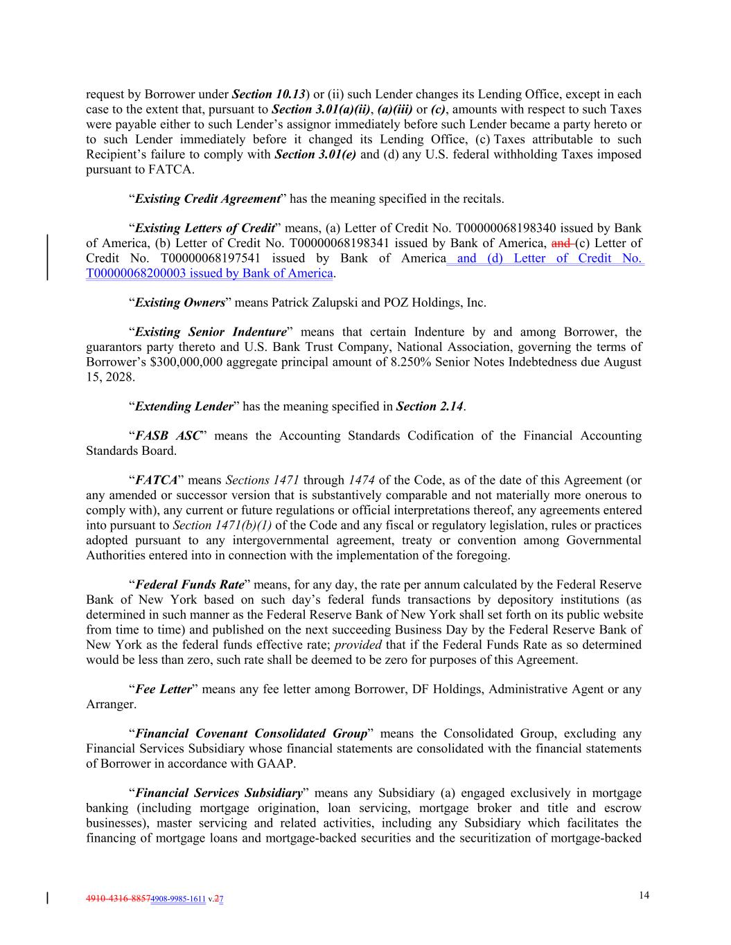 4910-4316-88574908-9985-1611 v.27 14 request by Borrower under Section 10.13) or (ii) such Lender changes its Lending Office, except in each case to the extent that, pursuant to Section 3.01(a)(ii), (a)(iii) or (c), amounts with respect to such Taxes were payable either to such Lender’s assignor immediately before such Lender became a party hereto or to such Lender immediately before it changed its Lending Office, (c) Taxes attributable to such Recipient’s failure to comply with Section 3.01(e) and (d) any U.S. federal withholding Taxes imposed pursuant to FATCA. “Existing Credit Agreement” has the meaning specified in the recitals. “Existing Letters of Credit” means, (a) Letter of Credit No. T00000068198340 issued by Bank of America, (b) Letter of Credit No. T00000068198341 issued by Bank of America, and (c) Letter of Credit No. T00000068197541 issued by Bank of America and (d) Letter of Credit No. T00000068200003 issued by Bank of America. “Existing Owners” means Patrick Zalupski and POZ Holdings, Inc. “Existing Senior Indenture” means that certain Indenture by and among Borrower, the guarantors party thereto and U.S. Bank Trust Company, National Association, governing the terms of Borrower’s $300,000,000 aggregate principal amount of 8.250% Senior Notes Indebtedness due August 15, 2028. “Extending Lender” has the meaning specified in Section 2.14. “FASB ASC” means the Accounting Standards Codification of the Financial Accounting Standards Board. “FATCA” means Sections 1471 through 1474 of the Code, as of the date of this Agreement (or any amended or successor version that is substantively comparable and not materially more onerous to comply with), any current or future regulations or official interpretations thereof, any agreements entered into pursuant to Section 1471(b)(1) of the Code and any fiscal or regulatory legislation, rules or practices adopted pursuant to any intergovernmental agreement, treaty or convention among Governmental Authorities entered into in connection with the implementation of the foregoing. “Federal Funds Rate” means, for any day, the rate per annum calculated by the Federal Reserve Bank of New York based on such day’s federal funds transactions by depository institutions (as determined in such manner as the Federal Reserve Bank of New York shall set forth on its public website from time to time) and published on the next succeeding Business Day by the Federal Reserve Bank of New York as the federal funds effective rate; provided that if the Federal Funds Rate as so determined would be less than zero, such rate shall be deemed to be zero for purposes of this Agreement. “Fee Letter” means any fee letter among Borrower, DF Holdings, Administrative Agent or any Arranger. “Financial Covenant Consolidated Group” means the Consolidated Group, excluding any Financial Services Subsidiary whose financial statements are consolidated with the financial statements of Borrower in accordance with GAAP. “Financial Services Subsidiary” means any Subsidiary (a) engaged exclusively in mortgage banking (including mortgage origination, loan servicing, mortgage broker and title and escrow businesses), master servicing and related activities, including any Subsidiary which facilitates the financing of mortgage loans and mortgage-backed securities and the securitization of mortgage-backed