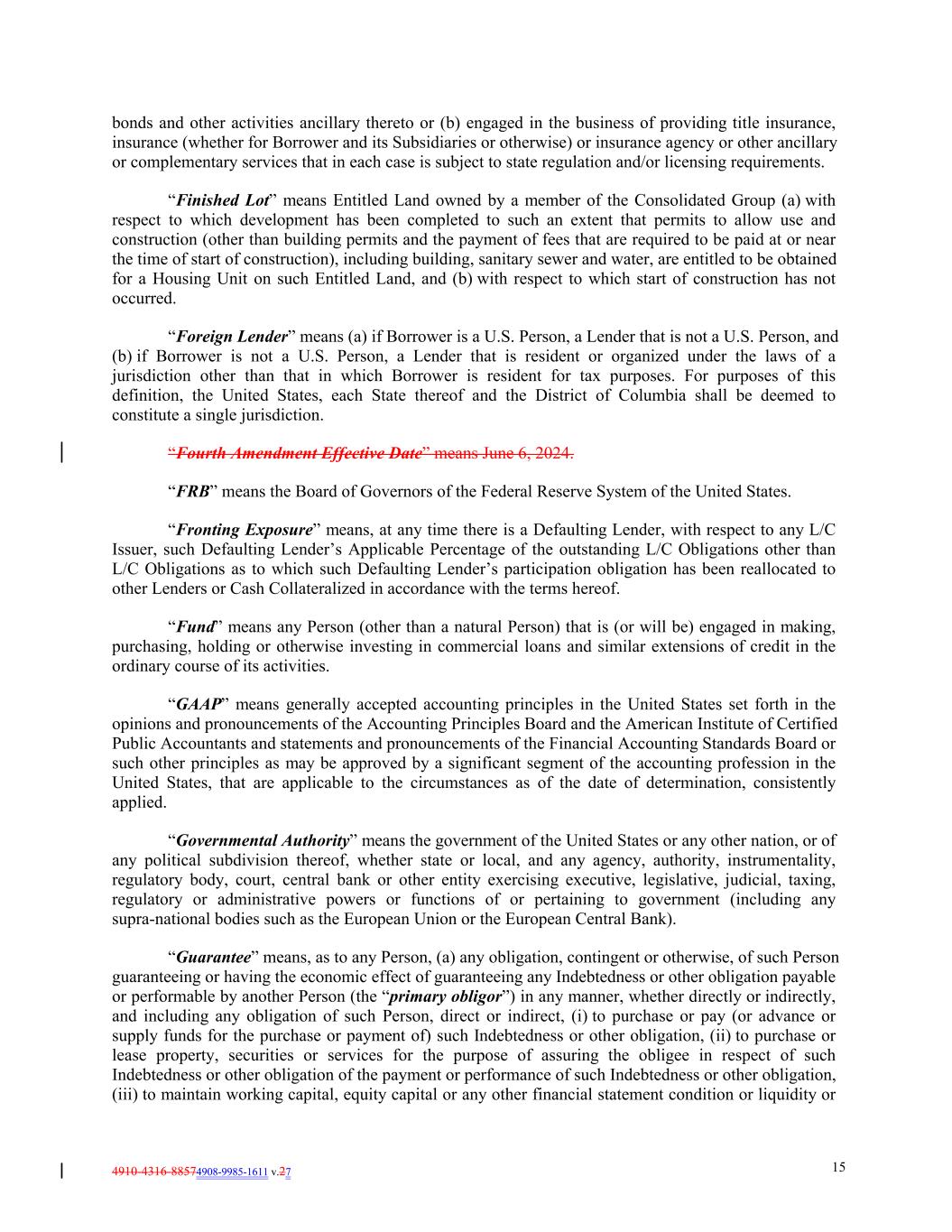 4910-4316-88574908-9985-1611 v.27 15 bonds and other activities ancillary thereto or (b) engaged in the business of providing title insurance, insurance (whether for Borrower and its Subsidiaries or otherwise) or insurance agency or other ancillary or complementary services that in each case is subject to state regulation and/or licensing requirements. “Finished Lot” means Entitled Land owned by a member of the Consolidated Group (a) with respect to which development has been completed to such an extent that permits to allow use and construction (other than building permits and the payment of fees that are required to be paid at or near the time of start of construction), including building, sanitary sewer and water, are entitled to be obtained for a Housing Unit on such Entitled Land, and (b) with respect to which start of construction has not occurred. “Foreign Lender” means (a) if Borrower is a U.S. Person, a Lender that is not a U.S. Person, and (b) if Borrower is not a U.S. Person, a Lender that is resident or organized under the laws of a jurisdiction other than that in which Borrower is resident for tax purposes. For purposes of this definition, the United States, each State thereof and the District of Columbia shall be deemed to constitute a single jurisdiction. “Fourth Amendment Effective Date” means June 6, 2024. “FRB” means the Board of Governors of the Federal Reserve System of the United States. “Fronting Exposure” means, at any time there is a Defaulting Lender, with respect to any L/C Issuer, such Defaulting Lender’s Applicable Percentage of the outstanding L/C Obligations other than L/C Obligations as to which such Defaulting Lender’s participation obligation has been reallocated to other Lenders or Cash Collateralized in accordance with the terms hereof. “Fund” means any Person (other than a natural Person) that is (or will be) engaged in making, purchasing, holding or otherwise investing in commercial loans and similar extensions of credit in the ordinary course of its activities. “GAAP” means generally accepted accounting principles in the United States set forth in the opinions and pronouncements of the Accounting Principles Board and the American Institute of Certified Public Accountants and statements and pronouncements of the Financial Accounting Standards Board or such other principles as may be approved by a significant segment of the accounting profession in the United States, that are applicable to the circumstances as of the date of determination, consistently applied. “Governmental Authority” means the government of the United States or any other nation, or of any political subdivision thereof, whether state or local, and any agency, authority, instrumentality, regulatory body, court, central bank or other entity exercising executive, legislative, judicial, taxing, regulatory or administrative powers or functions of or pertaining to government (including any supra-national bodies such as the European Union or the European Central Bank). “Guarantee” means, as to any Person, (a) any obligation, contingent or otherwise, of such Person guaranteeing or having the economic effect of guaranteeing any Indebtedness or other obligation payable or performable by another Person (the “primary obligor”) in any manner, whether directly or indirectly, and including any obligation of such Person, direct or indirect, (i) to purchase or pay (or advance or supply funds for the purchase or payment of) such Indebtedness or other obligation, (ii) to purchase or lease property, securities or services for the purpose of assuring the obligee in respect of such Indebtedness or other obligation of the payment or performance of such Indebtedness or other obligation, (iii) to maintain working capital, equity capital or any other financial statement condition or liquidity or