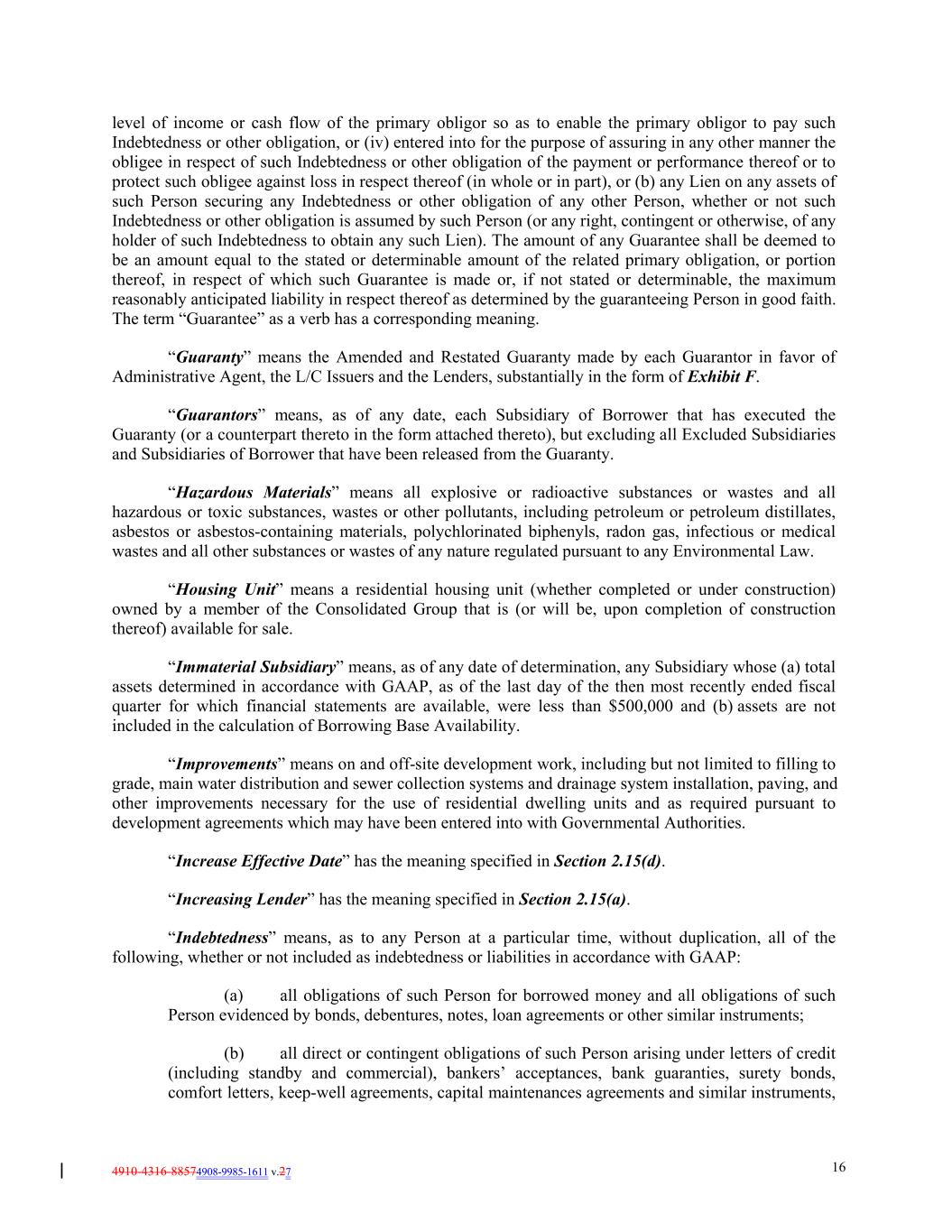 4910-4316-88574908-9985-1611 v.27 16 level of income or cash flow of the primary obligor so as to enable the primary obligor to pay such Indebtedness or other obligation, or (iv) entered into for the purpose of assuring in any other manner the obligee in respect of such Indebtedness or other obligation of the payment or performance thereof or to protect such obligee against loss in respect thereof (in whole or in part), or (b) any Lien on any assets of such Person securing any Indebtedness or other obligation of any other Person, whether or not such Indebtedness or other obligation is assumed by such Person (or any right, contingent or otherwise, of any holder of such Indebtedness to obtain any such Lien). The amount of any Guarantee shall be deemed to be an amount equal to the stated or determinable amount of the related primary obligation, or portion thereof, in respect of which such Guarantee is made or, if not stated or determinable, the maximum reasonably anticipated liability in respect thereof as determined by the guaranteeing Person in good faith. The term “Guarantee” as a verb has a corresponding meaning. “Guaranty” means the Amended and Restated Guaranty made by each Guarantor in favor of Administrative Agent, the L/C Issuers and the Lenders, substantially in the form of Exhibit F. “Guarantors” means, as of any date, each Subsidiary of Borrower that has executed the Guaranty (or a counterpart thereto in the form attached thereto), but excluding all Excluded Subsidiaries and Subsidiaries of Borrower that have been released from the Guaranty. “Hazardous Materials” means all explosive or radioactive substances or wastes and all hazardous or toxic substances, wastes or other pollutants, including petroleum or petroleum distillates, asbestos or asbestos-containing materials, polychlorinated biphenyls, radon gas, infectious or medical wastes and all other substances or wastes of any nature regulated pursuant to any Environmental Law. “Housing Unit” means a residential housing unit (whether completed or under construction) owned by a member of the Consolidated Group that is (or will be, upon completion of construction thereof) available for sale. “Immaterial Subsidiary” means, as of any date of determination, any Subsidiary whose (a) total assets determined in accordance with GAAP, as of the last day of the then most recently ended fiscal quarter for which financial statements are available, were less than $500,000 and (b) assets are not included in the calculation of Borrowing Base Availability. “Improvements” means on and off-site development work, including but not limited to filling to grade, main water distribution and sewer collection systems and drainage system installation, paving, and other improvements necessary for the use of residential dwelling units and as required pursuant to development agreements which may have been entered into with Governmental Authorities. “Increase Effective Date” has the meaning specified in Section 2.15(d). “Increasing Lender” has the meaning specified in Section 2.15(a). “Indebtedness” means, as to any Person at a particular time, without duplication, all of the following, whether or not included as indebtedness or liabilities in accordance with GAAP: (a) all obligations of such Person for borrowed money and all obligations of such Person evidenced by bonds, debentures, notes, loan agreements or other similar instruments; (b) all direct or contingent obligations of such Person arising under letters of credit (including standby and commercial), bankers’ acceptances, bank guaranties, surety bonds, comfort letters, keep-well agreements, capital maintenances agreements and similar instruments,