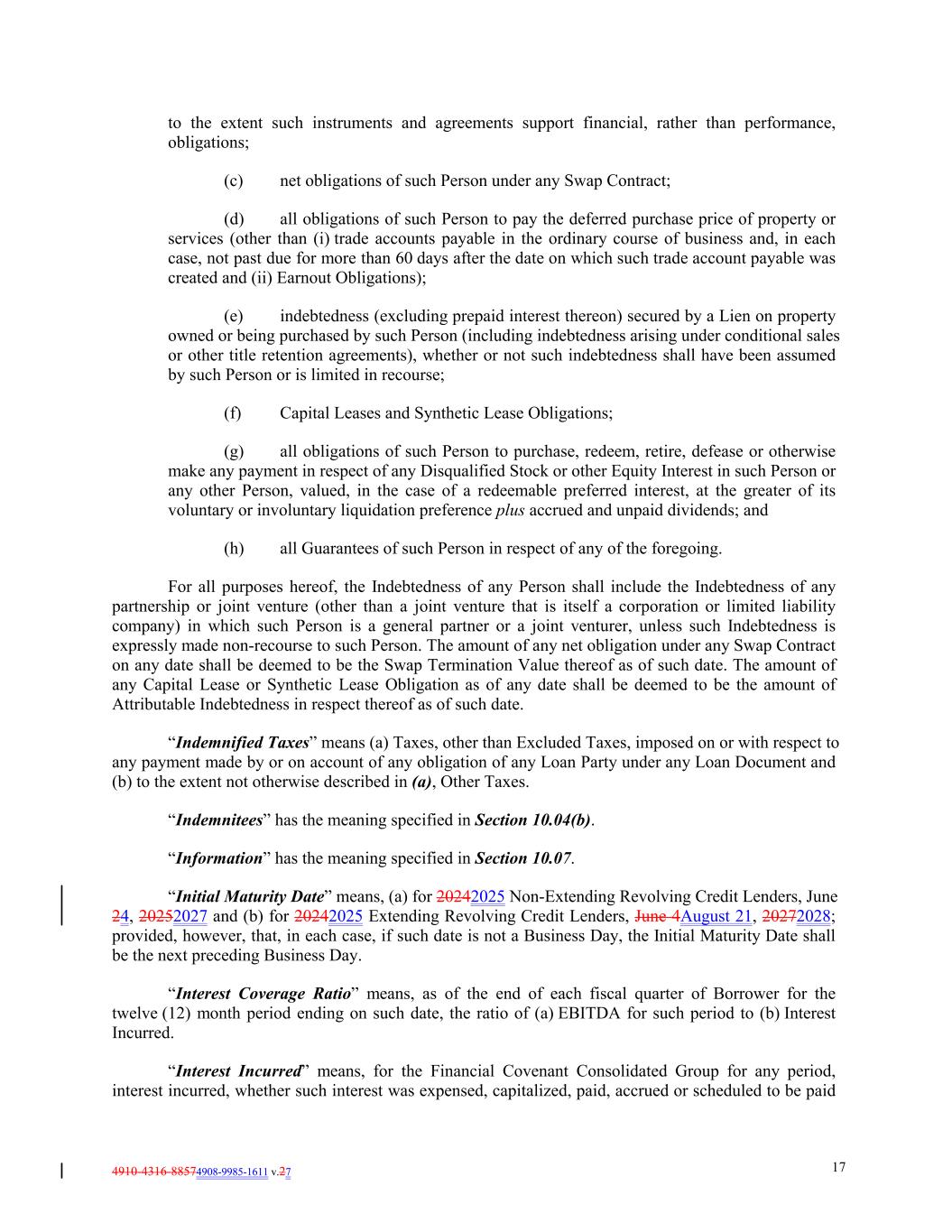 4910-4316-88574908-9985-1611 v.27 17 to the extent such instruments and agreements support financial, rather than performance, obligations; (c) net obligations of such Person under any Swap Contract; (d) all obligations of such Person to pay the deferred purchase price of property or services (other than (i) trade accounts payable in the ordinary course of business and, in each case, not past due for more than 60 days after the date on which such trade account payable was created and (ii) Earnout Obligations); (e) indebtedness (excluding prepaid interest thereon) secured by a Lien on property owned or being purchased by such Person (including indebtedness arising under conditional sales or other title retention agreements), whether or not such indebtedness shall have been assumed by such Person or is limited in recourse; (f) Capital Leases and Synthetic Lease Obligations; (g) all obligations of such Person to purchase, redeem, retire, defease or otherwise make any payment in respect of any Disqualified Stock or other Equity Interest in such Person or any other Person, valued, in the case of a redeemable preferred interest, at the greater of its voluntary or involuntary liquidation preference plus accrued and unpaid dividends; and (h) all Guarantees of such Person in respect of any of the foregoing. For all purposes hereof, the Indebtedness of any Person shall include the Indebtedness of any partnership or joint venture (other than a joint venture that is itself a corporation or limited liability company) in which such Person is a general partner or a joint venturer, unless such Indebtedness is expressly made non-recourse to such Person. The amount of any net obligation under any Swap Contract on any date shall be deemed to be the Swap Termination Value thereof as of such date. The amount of any Capital Lease or Synthetic Lease Obligation as of any date shall be deemed to be the amount of Attributable Indebtedness in respect thereof as of such date. “Indemnified Taxes” means (a) Taxes, other than Excluded Taxes, imposed on or with respect to any payment made by or on account of any obligation of any Loan Party under any Loan Document and (b) to the extent not otherwise described in (a), Other Taxes. “Indemnitees” has the meaning specified in Section 10.04(b). “Information” has the meaning specified in Section 10.07. “Initial Maturity Date” means, (a) for 20242025 Non-Extending Revolving Credit Lenders, June 24, 20252027 and (b) for 20242025 Extending Revolving Credit Lenders, June 4August 21, 20272028; provided, however, that, in each case, if such date is not a Business Day, the Initial Maturity Date shall be the next preceding Business Day. “Interest Coverage Ratio” means, as of the end of each fiscal quarter of Borrower for the twelve (12) month period ending on such date, the ratio of (a) EBITDA for such period to (b) Interest Incurred. “Interest Incurred” means, for the Financial Covenant Consolidated Group for any period, interest incurred, whether such interest was expensed, capitalized, paid, accrued or scheduled to be paid