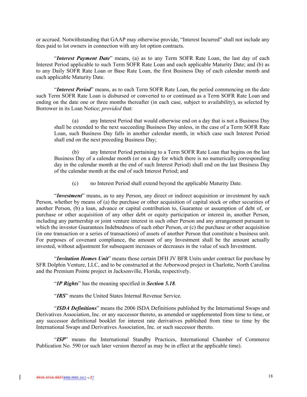 4910-4316-88574908-9985-1611 v.27 18 or accrued. Notwithstanding that GAAP may otherwise provide, “Interest Incurred” shall not include any fees paid to lot owners in connection with any lot option contracts. “Interest Payment Date” means, (a) as to any Term SOFR Rate Loan, the last day of each Interest Period applicable to such Term SOFR Rate Loan and each applicable Maturity Date; and (b) as to any Daily SOFR Rate Loan or Base Rate Loan, the first Business Day of each calendar month and each applicable Maturity Date. “Interest Period” means, as to each Term SOFR Rate Loan, the period commencing on the date such Term SOFR Rate Loan is disbursed or converted to or continued as a Term SOFR Rate Loan and ending on the date one or three months thereafter (in each case, subject to availability), as selected by Borrower in its Loan Notice; provided that: (a) any Interest Period that would otherwise end on a day that is not a Business Day shall be extended to the next succeeding Business Day unless, in the case of a Term SOFR Rate Loan, such Business Day falls in another calendar month, in which case such Interest Period shall end on the next preceding Business Day; (b) any Interest Period pertaining to a Term SOFR Rate Loan that begins on the last Business Day of a calendar month (or on a day for which there is no numerically corresponding day in the calendar month at the end of such Interest Period) shall end on the last Business Day of the calendar month at the end of such Interest Period; and (c) no Interest Period shall extend beyond the applicable Maturity Date. “Investment” means, as to any Person, any direct or indirect acquisition or investment by such Person, whether by means of (a) the purchase or other acquisition of capital stock or other securities of another Person, (b) a loan, advance or capital contribution to, Guarantee or assumption of debt of, or purchase or other acquisition of any other debt or equity participation or interest in, another Person, including any partnership or joint venture interest in such other Person and any arrangement pursuant to which the investor Guarantees Indebtedness of such other Person, or (c) the purchase or other acquisition (in one transaction or a series of transactions) of assets of another Person that constitute a business unit. For purposes of covenant compliance, the amount of any Investment shall be the amount actually invested, without adjustment for subsequent increases or decreases in the value of such Investment. “Invitation Homes Unit” means those certain DFH JV BFR Units under contract for purchase by SFR Dolphin Venture, LLC, and to be constructed at the Arborwood project in Charlotte, North Carolina and the Premium Pointe project in Jacksonville, Florida, respectively. “IP Rights” has the meaning specified in Section 5.18. “IRS” means the United States Internal Revenue Service. “ISDA Definitions” means the 2006 ISDA Definitions published by the International Swaps and Derivatives Association, Inc. or any successor thereto, as amended or supplemented from time to time, or any successor definitional booklet for interest rate derivatives published from time to time by the International Swaps and Derivatives Association, Inc. or such successor thereto. “ISP” means the International Standby Practices, International Chamber of Commerce Publication No. 590 (or such later version thereof as may be in effect at the applicable time).