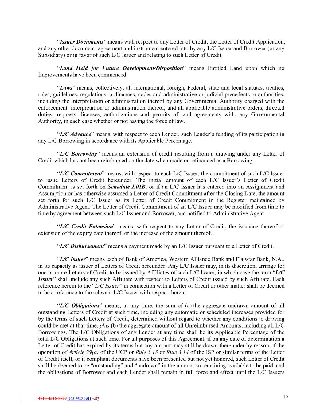 4910-4316-88574908-9985-1611 v.27 19 “Issuer Documents” means with respect to any Letter of Credit, the Letter of Credit Application, and any other document, agreement and instrument entered into by any L/C Issuer and Borrower (or any Subsidiary) or in favor of such L/C Issuer and relating to such Letter of Credit. “Land Held for Future Development/Disposition” means Entitled Land upon which no Improvements have been commenced. “Laws” means, collectively, all international, foreign, Federal, state and local statutes, treaties, rules, guidelines, regulations, ordinances, codes and administrative or judicial precedents or authorities, including the interpretation or administration thereof by any Governmental Authority charged with the enforcement, interpretation or administration thereof, and all applicable administrative orders, directed duties, requests, licenses, authorizations and permits of, and agreements with, any Governmental Authority, in each case whether or not having the force of law. “L/C Advance” means, with respect to each Lender, such Lender’s funding of its participation in any L/C Borrowing in accordance with its Applicable Percentage. “L/C Borrowing” means an extension of credit resulting from a drawing under any Letter of Credit which has not been reimbursed on the date when made or refinanced as a Borrowing. “L/C Commitment” means, with respect to each L/C Issuer, the commitment of such L/C Issuer to issue Letters of Credit hereunder. The initial amount of each L/C Issuer’s Letter of Credit Commitment is set forth on Schedule 2.01B, or if an L/C Issuer has entered into an Assignment and Assumption or has otherwise assumed a Letter of Credit Commitment after the Closing Date, the amount set forth for such L/C Issuer as its Letter of Credit Commitment in the Register maintained by Administrative Agent. The Letter of Credit Commitment of an L/C Issuer may be modified from time to time by agreement between such L/C Issuer and Borrower, and notified to Administrative Agent. “L/C Credit Extension” means, with respect to any Letter of Credit, the issuance thereof or extension of the expiry date thereof, or the increase of the amount thereof. “L/C Disbursement” means a payment made by an L/C Issuer pursuant to a Letter of Credit. “L/C Issuer” means each of Bank of America, Western Alliance Bank and Flagstar Bank, N.A., in its capacity as issuer of Letters of Credit hereunder. Any L/C Issuer may, in its discretion, arrange for one or more Letters of Credit to be issued by Affiliates of such L/C Issuer, in which case the term “L/C Issuer” shall include any such Affiliate with respect to Letters of Credit issued by such Affiliate. Each reference herein to the “L/C Issuer” in connection with a Letter of Credit or other matter shall be deemed to be a reference to the relevant L/C Issuer with respect thereto. “L/C Obligations” means, at any time, the sum of (a) the aggregate undrawn amount of all outstanding Letters of Credit at such time, including any automatic or scheduled increases provided for by the terms of such Letters of Credit, determined without regard to whether any conditions to drawing could be met at that time, plus (b) the aggregate amount of all Unreimbursed Amounts, including all L/C Borrowings. The L/C Obligations of any Lender at any time shall be its Applicable Percentage of the total L/C Obligations at such time. For all purposes of this Agreement, if on any date of determination a Letter of Credit has expired by its terms but any amount may still be drawn thereunder by reason of the operation of Article 29(a) of the UCP or Rule 3.13 or Rule 3.14 of the ISP or similar terms of the Letter of Credit itself, or if compliant documents have been presented but not yet honored, such Letter of Credit shall be deemed to be “outstanding” and “undrawn” in the amount so remaining available to be paid, and the obligations of Borrower and each Lender shall remain in full force and effect until the L/C Issuers