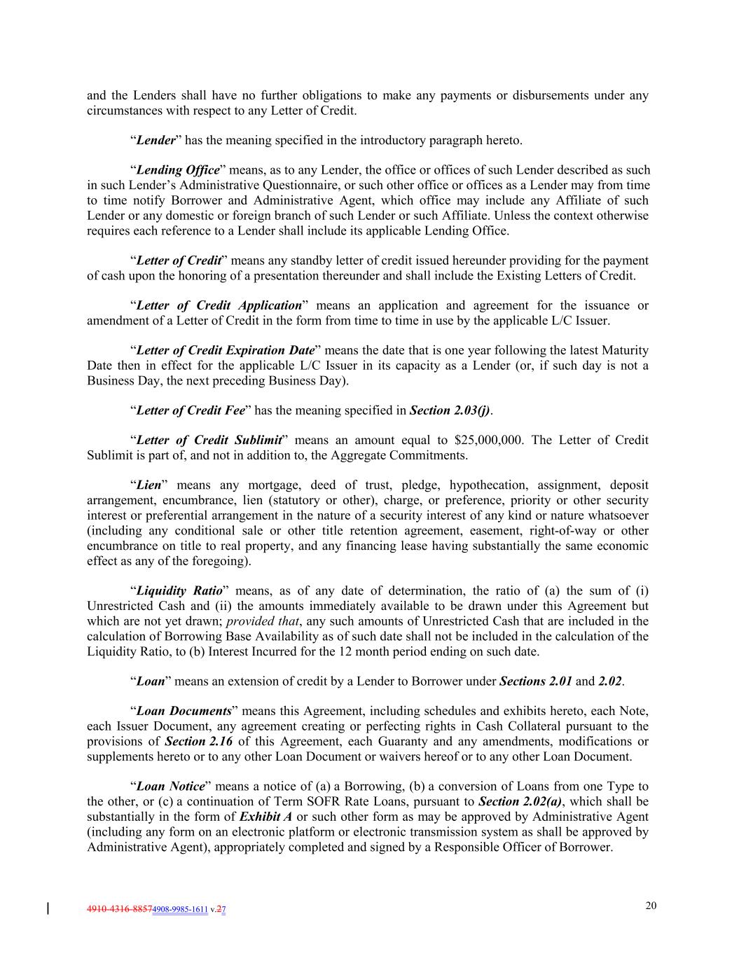 4910-4316-88574908-9985-1611 v.27 20 and the Lenders shall have no further obligations to make any payments or disbursements under any circumstances with respect to any Letter of Credit. “Lender” has the meaning specified in the introductory paragraph hereto. “Lending Office” means, as to any Lender, the office or offices of such Lender described as such in such Lender’s Administrative Questionnaire, or such other office or offices as a Lender may from time to time notify Borrower and Administrative Agent, which office may include any Affiliate of such Lender or any domestic or foreign branch of such Lender or such Affiliate. Unless the context otherwise requires each reference to a Lender shall include its applicable Lending Office. “Letter of Credit” means any standby letter of credit issued hereunder providing for the payment of cash upon the honoring of a presentation thereunder and shall include the Existing Letters of Credit. “Letter of Credit Application” means an application and agreement for the issuance or amendment of a Letter of Credit in the form from time to time in use by the applicable L/C Issuer. “Letter of Credit Expiration Date” means the date that is one year following the latest Maturity Date then in effect for the applicable L/C Issuer in its capacity as a Lender (or, if such day is not a Business Day, the next preceding Business Day). “Letter of Credit Fee” has the meaning specified in Section 2.03(j). “Letter of Credit Sublimit” means an amount equal to $25,000,000. The Letter of Credit Sublimit is part of, and not in addition to, the Aggregate Commitments. “Lien” means any mortgage, deed of trust, pledge, hypothecation, assignment, deposit arrangement, encumbrance, lien (statutory or other), charge, or preference, priority or other security interest or preferential arrangement in the nature of a security interest of any kind or nature whatsoever (including any conditional sale or other title retention agreement, easement, right-of-way or other encumbrance on title to real property, and any financing lease having substantially the same economic effect as any of the foregoing). “Liquidity Ratio” means, as of any date of determination, the ratio of (a) the sum of (i) Unrestricted Cash and (ii) the amounts immediately available to be drawn under this Agreement but which are not yet drawn; provided that, any such amounts of Unrestricted Cash that are included in the calculation of Borrowing Base Availability as of such date shall not be included in the calculation of the Liquidity Ratio, to (b) Interest Incurred for the 12 month period ending on such date. “Loan” means an extension of credit by a Lender to Borrower under Sections 2.01 and 2.02. “Loan Documents” means this Agreement, including schedules and exhibits hereto, each Note, each Issuer Document, any agreement creating or perfecting rights in Cash Collateral pursuant to the provisions of Section 2.16 of this Agreement, each Guaranty and any amendments, modifications or supplements hereto or to any other Loan Document or waivers hereof or to any other Loan Document. “Loan Notice” means a notice of (a) a Borrowing, (b) a conversion of Loans from one Type to the other, or (c) a continuation of Term SOFR Rate Loans, pursuant to Section 2.02(a), which shall be substantially in the form of Exhibit A or such other form as may be approved by Administrative Agent (including any form on an electronic platform or electronic transmission system as shall be approved by Administrative Agent), appropriately completed and signed by a Responsible Officer of Borrower.