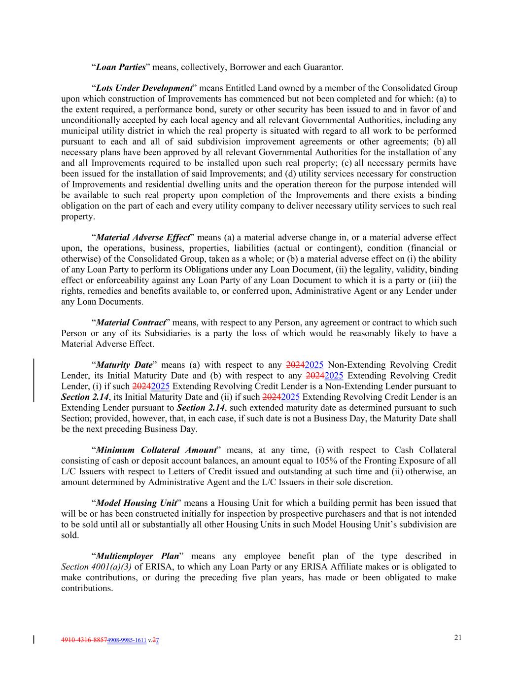 4910-4316-88574908-9985-1611 v.27 21 “Loan Parties” means, collectively, Borrower and each Guarantor. “Lots Under Development” means Entitled Land owned by a member of the Consolidated Group upon which construction of Improvements has commenced but not been completed and for which: (a) to the extent required, a performance bond, surety or other security has been issued to and in favor of and unconditionally accepted by each local agency and all relevant Governmental Authorities, including any municipal utility district in which the real property is situated with regard to all work to be performed pursuant to each and all of said subdivision improvement agreements or other agreements; (b) all necessary plans have been approved by all relevant Governmental Authorities for the installation of any and all Improvements required to be installed upon such real property; (c) all necessary permits have been issued for the installation of said Improvements; and (d) utility services necessary for construction of Improvements and residential dwelling units and the operation thereon for the purpose intended will be available to such real property upon completion of the Improvements and there exists a binding obligation on the part of each and every utility company to deliver necessary utility services to such real property. “Material Adverse Effect” means (a) a material adverse change in, or a material adverse effect upon, the operations, business, properties, liabilities (actual or contingent), condition (financial or otherwise) of the Consolidated Group, taken as a whole; or (b) a material adverse effect on (i) the ability of any Loan Party to perform its Obligations under any Loan Document, (ii) the legality, validity, binding effect or enforceability against any Loan Party of any Loan Document to which it is a party or (iii) the rights, remedies and benefits available to, or conferred upon, Administrative Agent or any Lender under any Loan Documents. “Material Contract” means, with respect to any Person, any agreement or contract to which such Person or any of its Subsidiaries is a party the loss of which would be reasonably likely to have a Material Adverse Effect. “Maturity Date” means (a) with respect to any 20242025 Non-Extending Revolving Credit Lender, its Initial Maturity Date and (b) with respect to any 20242025 Extending Revolving Credit Lender, (i) if such 20242025 Extending Revolving Credit Lender is a Non-Extending Lender pursuant to Section 2.14, its Initial Maturity Date and (ii) if such 20242025 Extending Revolving Credit Lender is an Extending Lender pursuant to Section 2.14, such extended maturity date as determined pursuant to such Section; provided, however, that, in each case, if such date is not a Business Day, the Maturity Date shall be the next preceding Business Day. “Minimum Collateral Amount” means, at any time, (i) with respect to Cash Collateral consisting of cash or deposit account balances, an amount equal to 105% of the Fronting Exposure of all L/C Issuers with respect to Letters of Credit issued and outstanding at such time and (ii) otherwise, an amount determined by Administrative Agent and the L/C Issuers in their sole discretion. “Model Housing Unit” means a Housing Unit for which a building permit has been issued that will be or has been constructed initially for inspection by prospective purchasers and that is not intended to be sold until all or substantially all other Housing Units in such Model Housing Unit’s subdivision are sold. “Multiemployer Plan” means any employee benefit plan of the type described in Section 4001(a)(3) of ERISA, to which any Loan Party or any ERISA Affiliate makes or is obligated to make contributions, or during the preceding five plan years, has made or been obligated to make contributions.
