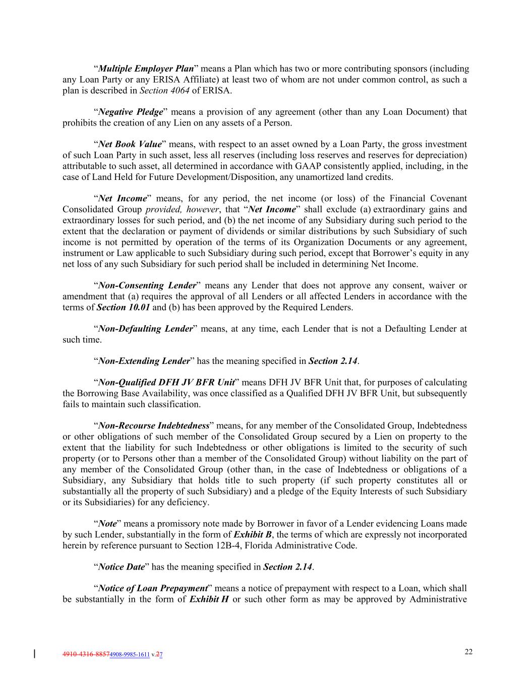 4910-4316-88574908-9985-1611 v.27 22 “Multiple Employer Plan” means a Plan which has two or more contributing sponsors (including any Loan Party or any ERISA Affiliate) at least two of whom are not under common control, as such a plan is described in Section 4064 of ERISA. “Negative Pledge” means a provision of any agreement (other than any Loan Document) that prohibits the creation of any Lien on any assets of a Person. “Net Book Value” means, with respect to an asset owned by a Loan Party, the gross investment of such Loan Party in such asset, less all reserves (including loss reserves and reserves for depreciation) attributable to such asset, all determined in accordance with GAAP consistently applied, including, in the case of Land Held for Future Development/Disposition, any unamortized land credits. “Net Income” means, for any period, the net income (or loss) of the Financial Covenant Consolidated Group provided, however, that “Net Income” shall exclude (a) extraordinary gains and extraordinary losses for such period, and (b) the net income of any Subsidiary during such period to the extent that the declaration or payment of dividends or similar distributions by such Subsidiary of such income is not permitted by operation of the terms of its Organization Documents or any agreement, instrument or Law applicable to such Subsidiary during such period, except that Borrower’s equity in any net loss of any such Subsidiary for such period shall be included in determining Net Income. “Non-Consenting Lender” means any Lender that does not approve any consent, waiver or amendment that (a) requires the approval of all Lenders or all affected Lenders in accordance with the terms of Section 10.01 and (b) has been approved by the Required Lenders. “Non-Defaulting Lender” means, at any time, each Lender that is not a Defaulting Lender at such time. “Non-Extending Lender” has the meaning specified in Section 2.14. “Non-Qualified DFH JV BFR Unit” means DFH JV BFR Unit that, for purposes of calculating the Borrowing Base Availability, was once classified as a Qualified DFH JV BFR Unit, but subsequently fails to maintain such classification. “Non-Recourse Indebtedness” means, for any member of the Consolidated Group, Indebtedness or other obligations of such member of the Consolidated Group secured by a Lien on property to the extent that the liability for such Indebtedness or other obligations is limited to the security of such property (or to Persons other than a member of the Consolidated Group) without liability on the part of any member of the Consolidated Group (other than, in the case of Indebtedness or obligations of a Subsidiary, any Subsidiary that holds title to such property (if such property constitutes all or substantially all the property of such Subsidiary) and a pledge of the Equity Interests of such Subsidiary or its Subsidiaries) for any deficiency. “Note” means a promissory note made by Borrower in favor of a Lender evidencing Loans made by such Lender, substantially in the form of Exhibit B, the terms of which are expressly not incorporated herein by reference pursuant to Section 12B-4, Florida Administrative Code. “Notice Date” has the meaning specified in Section 2.14. “Notice of Loan Prepayment” means a notice of prepayment with respect to a Loan, which shall be substantially in the form of Exhibit H or such other form as may be approved by Administrative