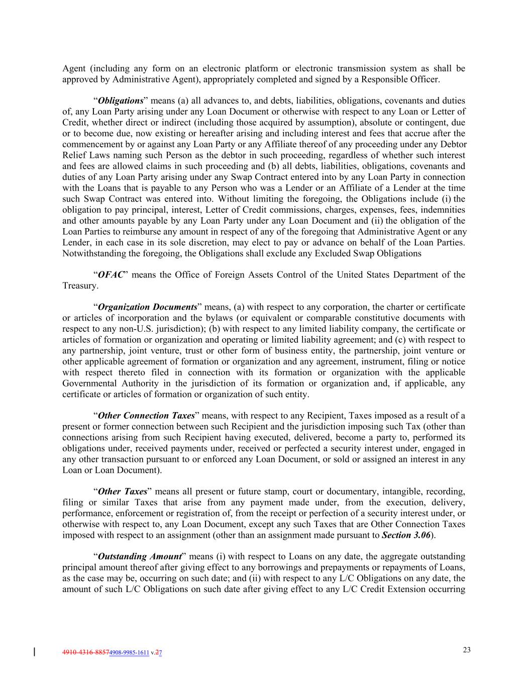 4910-4316-88574908-9985-1611 v.27 23 Agent (including any form on an electronic platform or electronic transmission system as shall be approved by Administrative Agent), appropriately completed and signed by a Responsible Officer. “Obligations” means (a) all advances to, and debts, liabilities, obligations, covenants and duties of, any Loan Party arising under any Loan Document or otherwise with respect to any Loan or Letter of Credit, whether direct or indirect (including those acquired by assumption), absolute or contingent, due or to become due, now existing or hereafter arising and including interest and fees that accrue after the commencement by or against any Loan Party or any Affiliate thereof of any proceeding under any Debtor Relief Laws naming such Person as the debtor in such proceeding, regardless of whether such interest and fees are allowed claims in such proceeding and (b) all debts, liabilities, obligations, covenants and duties of any Loan Party arising under any Swap Contract entered into by any Loan Party in connection with the Loans that is payable to any Person who was a Lender or an Affiliate of a Lender at the time such Swap Contract was entered into. Without limiting the foregoing, the Obligations include (i) the obligation to pay principal, interest, Letter of Credit commissions, charges, expenses, fees, indemnities and other amounts payable by any Loan Party under any Loan Document and (ii) the obligation of the Loan Parties to reimburse any amount in respect of any of the foregoing that Administrative Agent or any Lender, in each case in its sole discretion, may elect to pay or advance on behalf of the Loan Parties. Notwithstanding the foregoing, the Obligations shall exclude any Excluded Swap Obligations “OFAC” means the Office of Foreign Assets Control of the United States Department of the Treasury. “Organization Documents” means, (a) with respect to any corporation, the charter or certificate or articles of incorporation and the bylaws (or equivalent or comparable constitutive documents with respect to any non-U.S. jurisdiction); (b) with respect to any limited liability company, the certificate or articles of formation or organization and operating or limited liability agreement; and (c) with respect to any partnership, joint venture, trust or other form of business entity, the partnership, joint venture or other applicable agreement of formation or organization and any agreement, instrument, filing or notice with respect thereto filed in connection with its formation or organization with the applicable Governmental Authority in the jurisdiction of its formation or organization and, if applicable, any certificate or articles of formation or organization of such entity. “Other Connection Taxes” means, with respect to any Recipient, Taxes imposed as a result of a present or former connection between such Recipient and the jurisdiction imposing such Tax (other than connections arising from such Recipient having executed, delivered, become a party to, performed its obligations under, received payments under, received or perfected a security interest under, engaged in any other transaction pursuant to or enforced any Loan Document, or sold or assigned an interest in any Loan or Loan Document). “Other Taxes” means all present or future stamp, court or documentary, intangible, recording, filing or similar Taxes that arise from any payment made under, from the execution, delivery, performance, enforcement or registration of, from the receipt or perfection of a security interest under, or otherwise with respect to, any Loan Document, except any such Taxes that are Other Connection Taxes imposed with respect to an assignment (other than an assignment made pursuant to Section 3.06). “Outstanding Amount” means (i) with respect to Loans on any date, the aggregate outstanding principal amount thereof after giving effect to any borrowings and prepayments or repayments of Loans, as the case may be, occurring on such date; and (ii) with respect to any L/C Obligations on any date, the amount of such L/C Obligations on such date after giving effect to any L/C Credit Extension occurring