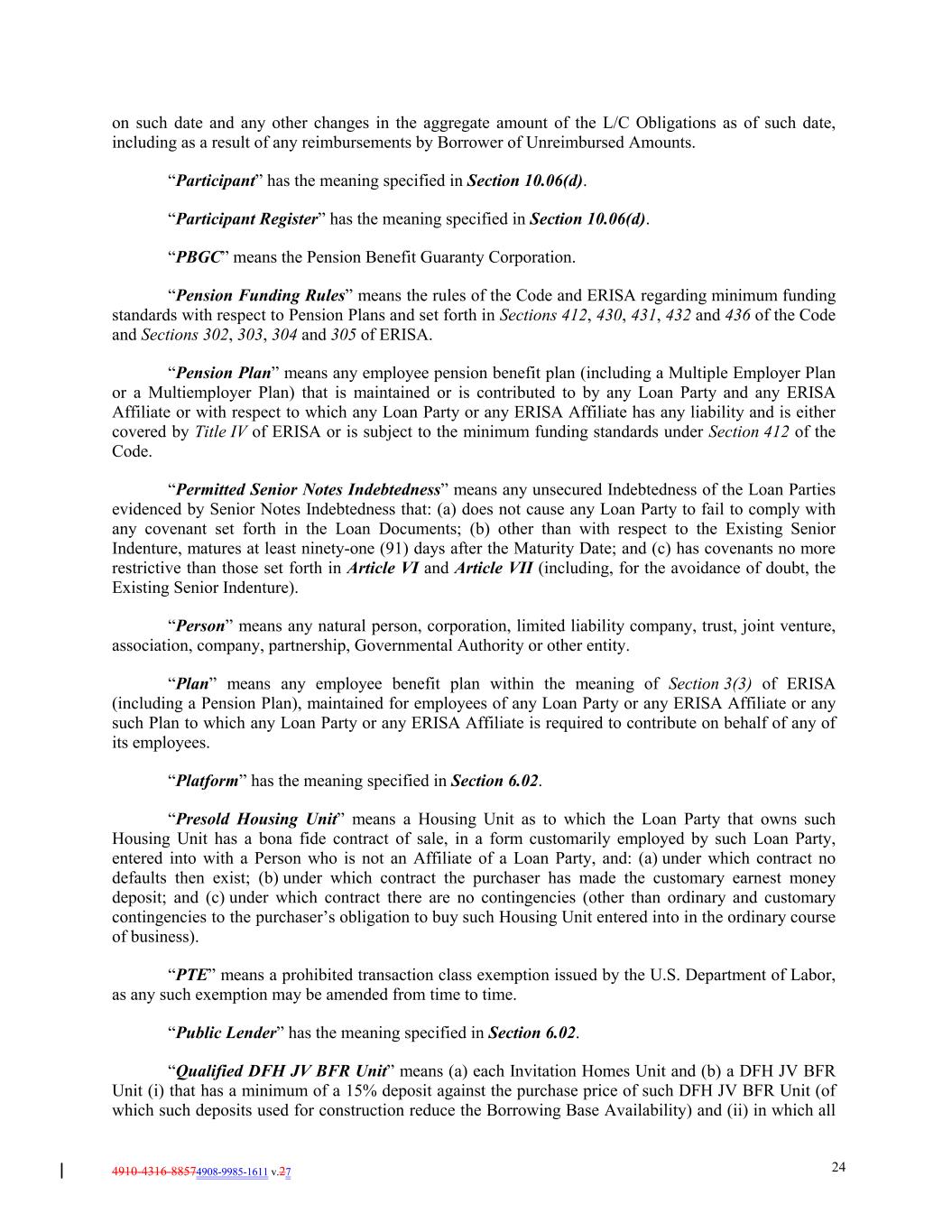 4910-4316-88574908-9985-1611 v.27 24 on such date and any other changes in the aggregate amount of the L/C Obligations as of such date, including as a result of any reimbursements by Borrower of Unreimbursed Amounts. “Participant” has the meaning specified in Section 10.06(d). “Participant Register” has the meaning specified in Section 10.06(d). “PBGC” means the Pension Benefit Guaranty Corporation. “Pension Funding Rules” means the rules of the Code and ERISA regarding minimum funding standards with respect to Pension Plans and set forth in Sections 412, 430, 431, 432 and 436 of the Code and Sections 302, 303, 304 and 305 of ERISA. “Pension Plan” means any employee pension benefit plan (including a Multiple Employer Plan or a Multiemployer Plan) that is maintained or is contributed to by any Loan Party and any ERISA Affiliate or with respect to which any Loan Party or any ERISA Affiliate has any liability and is either covered by Title IV of ERISA or is subject to the minimum funding standards under Section 412 of the Code. “Permitted Senior Notes Indebtedness” means any unsecured Indebtedness of the Loan Parties evidenced by Senior Notes Indebtedness that: (a) does not cause any Loan Party to fail to comply with any covenant set forth in the Loan Documents; (b) other than with respect to the Existing Senior Indenture, matures at least ninety-one (91) days after the Maturity Date; and (c) has covenants no more restrictive than those set forth in Article VI and Article VII (including, for the avoidance of doubt, the Existing Senior Indenture). “Person” means any natural person, corporation, limited liability company, trust, joint venture, association, company, partnership, Governmental Authority or other entity. “Plan” means any employee benefit plan within the meaning of Section 3(3) of ERISA (including a Pension Plan), maintained for employees of any Loan Party or any ERISA Affiliate or any such Plan to which any Loan Party or any ERISA Affiliate is required to contribute on behalf of any of its employees. “Platform” has the meaning specified in Section 6.02. “Presold Housing Unit” means a Housing Unit as to which the Loan Party that owns such Housing Unit has a bona fide contract of sale, in a form customarily employed by such Loan Party, entered into with a Person who is not an Affiliate of a Loan Party, and: (a) under which contract no defaults then exist; (b) under which contract the purchaser has made the customary earnest money deposit; and (c) under which contract there are no contingencies (other than ordinary and customary contingencies to the purchaser’s obligation to buy such Housing Unit entered into in the ordinary course of business). “PTE” means a prohibited transaction class exemption issued by the U.S. Department of Labor, as any such exemption may be amended from time to time. “Public Lender” has the meaning specified in Section 6.02. “Qualified DFH JV BFR Unit” means (a) each Invitation Homes Unit and (b) a DFH JV BFR Unit (i) that has a minimum of a 15% deposit against the purchase price of such DFH JV BFR Unit (of which such deposits used for construction reduce the Borrowing Base Availability) and (ii) in which all