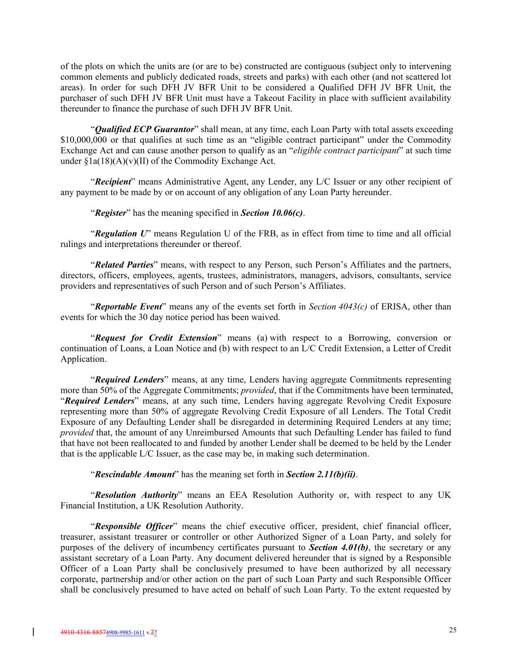 4910-4316-88574908-9985-1611 v.27 25 of the plots on which the units are (or are to be) constructed are contiguous (subject only to intervening common elements and publicly dedicated roads, streets and parks) with each other (and not scattered lot areas). In order for such DFH JV BFR Unit to be considered a Qualified DFH JV BFR Unit, the purchaser of such DFH JV BFR Unit must have a Takeout Facility in place with sufficient availability thereunder to finance the purchase of such DFH JV BFR Unit. “Qualified ECP Guarantor” shall mean, at any time, each Loan Party with total assets exceeding $10,000,000 or that qualifies at such time as an “eligible contract participant” under the Commodity Exchange Act and can cause another person to qualify as an “eligible contract participant” at such time under §1a(18)(A)(v)(II) of the Commodity Exchange Act. “Recipient” means Administrative Agent, any Lender, any L/C Issuer or any other recipient of any payment to be made by or on account of any obligation of any Loan Party hereunder. “Register” has the meaning specified in Section 10.06(c). “Regulation U” means Regulation U of the FRB, as in effect from time to time and all official rulings and interpretations thereunder or thereof. “Related Parties” means, with respect to any Person, such Person’s Affiliates and the partners, directors, officers, employees, agents, trustees, administrators, managers, advisors, consultants, service providers and representatives of such Person and of such Person’s Affiliates. “Reportable Event” means any of the events set forth in Section 4043(c) of ERISA, other than events for which the 30 day notice period has been waived. “Request for Credit Extension” means (a) with respect to a Borrowing, conversion or continuation of Loans, a Loan Notice and (b) with respect to an L/C Credit Extension, a Letter of Credit Application. “Required Lenders” means, at any time, Lenders having aggregate Commitments representing more than 50% of the Aggregate Commitments; provided, that if the Commitments have been terminated, “Required Lenders” means, at any such time, Lenders having aggregate Revolving Credit Exposure representing more than 50% of aggregate Revolving Credit Exposure of all Lenders. The Total Credit Exposure of any Defaulting Lender shall be disregarded in determining Required Lenders at any time; provided that, the amount of any Unreimbursed Amounts that such Defaulting Lender has failed to fund that have not been reallocated to and funded by another Lender shall be deemed to be held by the Lender that is the applicable L/C Issuer, as the case may be, in making such determination. “Rescindable Amount” has the meaning set forth in Section 2.11(b)(ii). “Resolution Authority” means an EEA Resolution Authority or, with respect to any UK Financial Institution, a UK Resolution Authority. “Responsible Officer” means the chief executive officer, president, chief financial officer, treasurer, assistant treasurer or controller or other Authorized Signer of a Loan Party, and solely for purposes of the delivery of incumbency certificates pursuant to Section 4.01(b), the secretary or any assistant secretary of a Loan Party. Any document delivered hereunder that is signed by a Responsible Officer of a Loan Party shall be conclusively presumed to have been authorized by all necessary corporate, partnership and/or other action on the part of such Loan Party and such Responsible Officer shall be conclusively presumed to have acted on behalf of such Loan Party. To the extent requested by