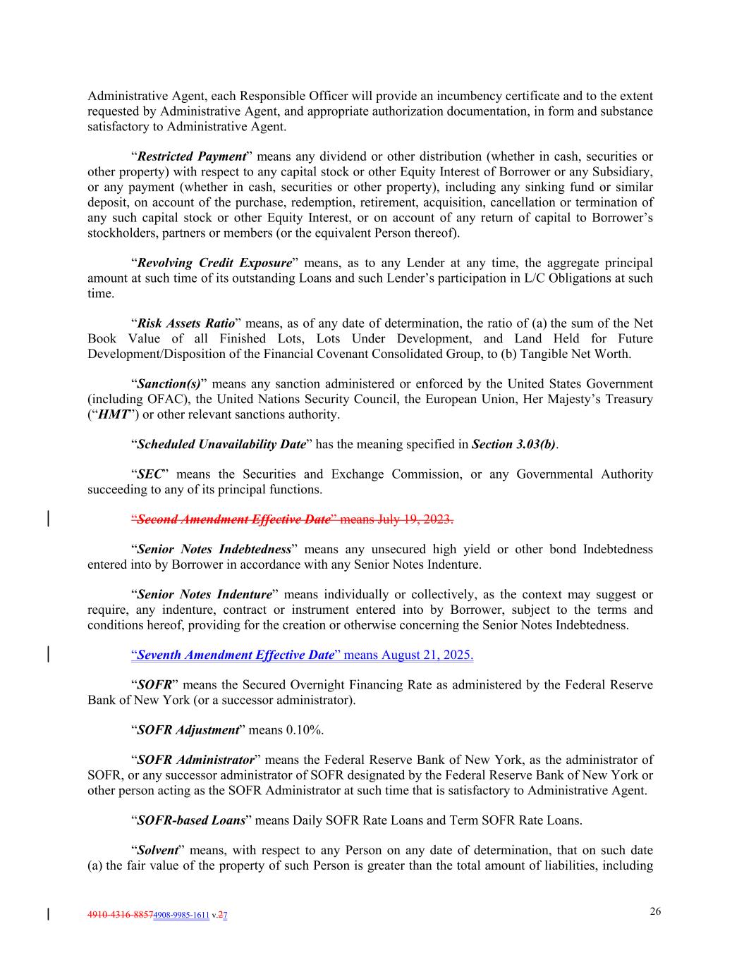 4910-4316-88574908-9985-1611 v.27 26 Administrative Agent, each Responsible Officer will provide an incumbency certificate and to the extent requested by Administrative Agent, and appropriate authorization documentation, in form and substance satisfactory to Administrative Agent. “Restricted Payment” means any dividend or other distribution (whether in cash, securities or other property) with respect to any capital stock or other Equity Interest of Borrower or any Subsidiary, or any payment (whether in cash, securities or other property), including any sinking fund or similar deposit, on account of the purchase, redemption, retirement, acquisition, cancellation or termination of any such capital stock or other Equity Interest, or on account of any return of capital to Borrower’s stockholders, partners or members (or the equivalent Person thereof). “Revolving Credit Exposure” means, as to any Lender at any time, the aggregate principal amount at such time of its outstanding Loans and such Lender’s participation in L/C Obligations at such time. “Risk Assets Ratio” means, as of any date of determination, the ratio of (a) the sum of the Net Book Value of all Finished Lots, Lots Under Development, and Land Held for Future Development/Disposition of the Financial Covenant Consolidated Group, to (b) Tangible Net Worth. “Sanction(s)” means any sanction administered or enforced by the United States Government (including OFAC), the United Nations Security Council, the European Union, Her Majesty’s Treasury (“HMT”) or other relevant sanctions authority. “Scheduled Unavailability Date” has the meaning specified in Section 3.03(b). “SEC” means the Securities and Exchange Commission, or any Governmental Authority succeeding to any of its principal functions. “Second Amendment Effective Date” means July 19, 2023. “Senior Notes Indebtedness” means any unsecured high yield or other bond Indebtedness entered into by Borrower in accordance with any Senior Notes Indenture. “Senior Notes Indenture” means individually or collectively, as the context may suggest or require, any indenture, contract or instrument entered into by Borrower, subject to the terms and conditions hereof, providing for the creation or otherwise concerning the Senior Notes Indebtedness. “Seventh Amendment Effective Date” means August 21, 2025. “SOFR” means the Secured Overnight Financing Rate as administered by the Federal Reserve Bank of New York (or a successor administrator). “SOFR Adjustment” means 0.10%. “SOFR Administrator” means the Federal Reserve Bank of New York, as the administrator of SOFR, or any successor administrator of SOFR designated by the Federal Reserve Bank of New York or other person acting as the SOFR Administrator at such time that is satisfactory to Administrative Agent. “SOFR-based Loans” means Daily SOFR Rate Loans and Term SOFR Rate Loans. “Solvent” means, with respect to any Person on any date of determination, that on such date (a) the fair value of the property of such Person is greater than the total amount of liabilities, including