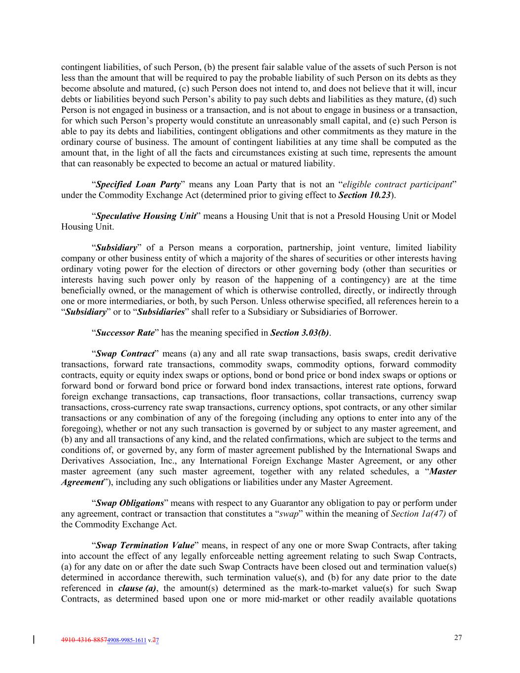 4910-4316-88574908-9985-1611 v.27 27 contingent liabilities, of such Person, (b) the present fair salable value of the assets of such Person is not less than the amount that will be required to pay the probable liability of such Person on its debts as they become absolute and matured, (c) such Person does not intend to, and does not believe that it will, incur debts or liabilities beyond such Person’s ability to pay such debts and liabilities as they mature, (d) such Person is not engaged in business or a transaction, and is not about to engage in business or a transaction, for which such Person’s property would constitute an unreasonably small capital, and (e) such Person is able to pay its debts and liabilities, contingent obligations and other commitments as they mature in the ordinary course of business. The amount of contingent liabilities at any time shall be computed as the amount that, in the light of all the facts and circumstances existing at such time, represents the amount that can reasonably be expected to become an actual or matured liability. “Specified Loan Party” means any Loan Party that is not an “eligible contract participant” under the Commodity Exchange Act (determined prior to giving effect to Section 10.23). “Speculative Housing Unit” means a Housing Unit that is not a Presold Housing Unit or Model Housing Unit. “Subsidiary” of a Person means a corporation, partnership, joint venture, limited liability company or other business entity of which a majority of the shares of securities or other interests having ordinary voting power for the election of directors or other governing body (other than securities or interests having such power only by reason of the happening of a contingency) are at the time beneficially owned, or the management of which is otherwise controlled, directly, or indirectly through one or more intermediaries, or both, by such Person. Unless otherwise specified, all references herein to a “Subsidiary” or to “Subsidiaries” shall refer to a Subsidiary or Subsidiaries of Borrower. “Successor Rate” has the meaning specified in Section 3.03(b). “Swap Contract” means (a) any and all rate swap transactions, basis swaps, credit derivative transactions, forward rate transactions, commodity swaps, commodity options, forward commodity contracts, equity or equity index swaps or options, bond or bond price or bond index swaps or options or forward bond or forward bond price or forward bond index transactions, interest rate options, forward foreign exchange transactions, cap transactions, floor transactions, collar transactions, currency swap transactions, cross-currency rate swap transactions, currency options, spot contracts, or any other similar transactions or any combination of any of the foregoing (including any options to enter into any of the foregoing), whether or not any such transaction is governed by or subject to any master agreement, and (b) any and all transactions of any kind, and the related confirmations, which are subject to the terms and conditions of, or governed by, any form of master agreement published by the International Swaps and Derivatives Association, Inc., any International Foreign Exchange Master Agreement, or any other master agreement (any such master agreement, together with any related schedules, a “Master Agreement”), including any such obligations or liabilities under any Master Agreement. “Swap Obligations” means with respect to any Guarantor any obligation to pay or perform under any agreement, contract or transaction that constitutes a “swap” within the meaning of Section 1a(47) of the Commodity Exchange Act. “Swap Termination Value” means, in respect of any one or more Swap Contracts, after taking into account the effect of any legally enforceable netting agreement relating to such Swap Contracts, (a) for any date on or after the date such Swap Contracts have been closed out and termination value(s) determined in accordance therewith, such termination value(s), and (b) for any date prior to the date referenced in clause (a), the amount(s) determined as the mark-to-market value(s) for such Swap Contracts, as determined based upon one or more mid-market or other readily available quotations