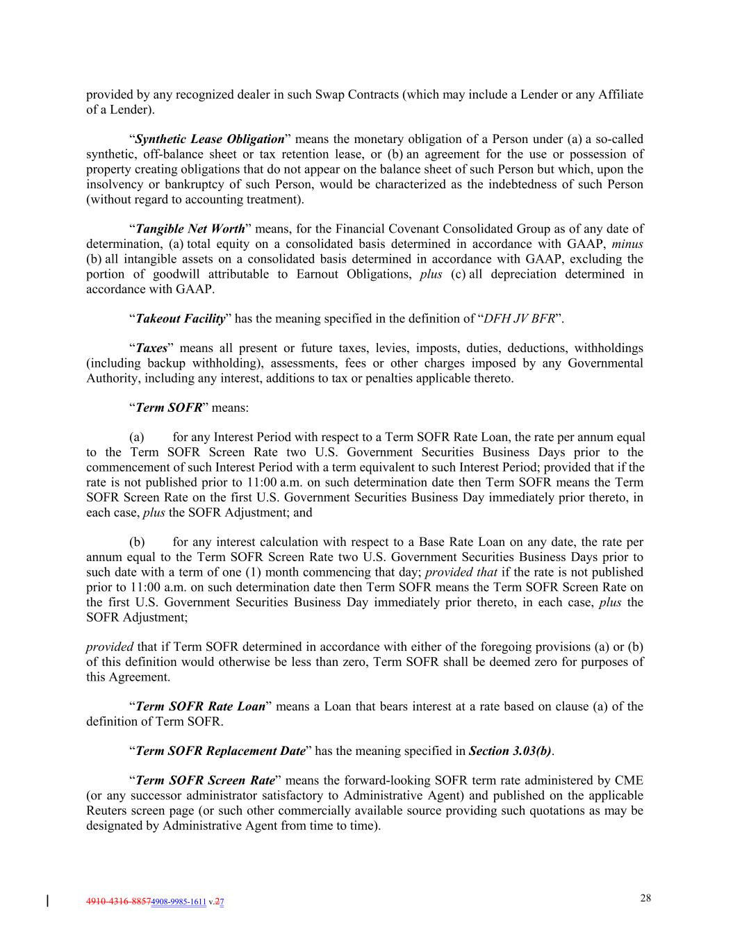 4910-4316-88574908-9985-1611 v.27 28 provided by any recognized dealer in such Swap Contracts (which may include a Lender or any Affiliate of a Lender). “Synthetic Lease Obligation” means the monetary obligation of a Person under (a) a so-called synthetic, off-balance sheet or tax retention lease, or (b) an agreement for the use or possession of property creating obligations that do not appear on the balance sheet of such Person but which, upon the insolvency or bankruptcy of such Person, would be characterized as the indebtedness of such Person (without regard to accounting treatment). “Tangible Net Worth” means, for the Financial Covenant Consolidated Group as of any date of determination, (a) total equity on a consolidated basis determined in accordance with GAAP, minus (b) all intangible assets on a consolidated basis determined in accordance with GAAP, excluding the portion of goodwill attributable to Earnout Obligations, plus (c) all depreciation determined in accordance with GAAP. “Takeout Facility” has the meaning specified in the definition of “DFH JV BFR”. “Taxes” means all present or future taxes, levies, imposts, duties, deductions, withholdings (including backup withholding), assessments, fees or other charges imposed by any Governmental Authority, including any interest, additions to tax or penalties applicable thereto. “Term SOFR” means: (a) for any Interest Period with respect to a Term SOFR Rate Loan, the rate per annum equal to the Term SOFR Screen Rate two U.S. Government Securities Business Days prior to the commencement of such Interest Period with a term equivalent to such Interest Period; provided that if the rate is not published prior to 11:00 a.m. on such determination date then Term SOFR means the Term SOFR Screen Rate on the first U.S. Government Securities Business Day immediately prior thereto, in each case, plus the SOFR Adjustment; and (b) for any interest calculation with respect to a Base Rate Loan on any date, the rate per annum equal to the Term SOFR Screen Rate two U.S. Government Securities Business Days prior to such date with a term of one (1) month commencing that day; provided that if the rate is not published prior to 11:00 a.m. on such determination date then Term SOFR means the Term SOFR Screen Rate on the first U.S. Government Securities Business Day immediately prior thereto, in each case, plus the SOFR Adjustment; provided that if Term SOFR determined in accordance with either of the foregoing provisions (a) or (b) of this definition would otherwise be less than zero, Term SOFR shall be deemed zero for purposes of this Agreement. “Term SOFR Rate Loan” means a Loan that bears interest at a rate based on clause (a) of the definition of Term SOFR. “Term SOFR Replacement Date” has the meaning specified in Section 3.03(b). “Term SOFR Screen Rate” means the forward-looking SOFR term rate administered by CME (or any successor administrator satisfactory to Administrative Agent) and published on the applicable Reuters screen page (or such other commercially available source providing such quotations as may be designated by Administrative Agent from time to time).