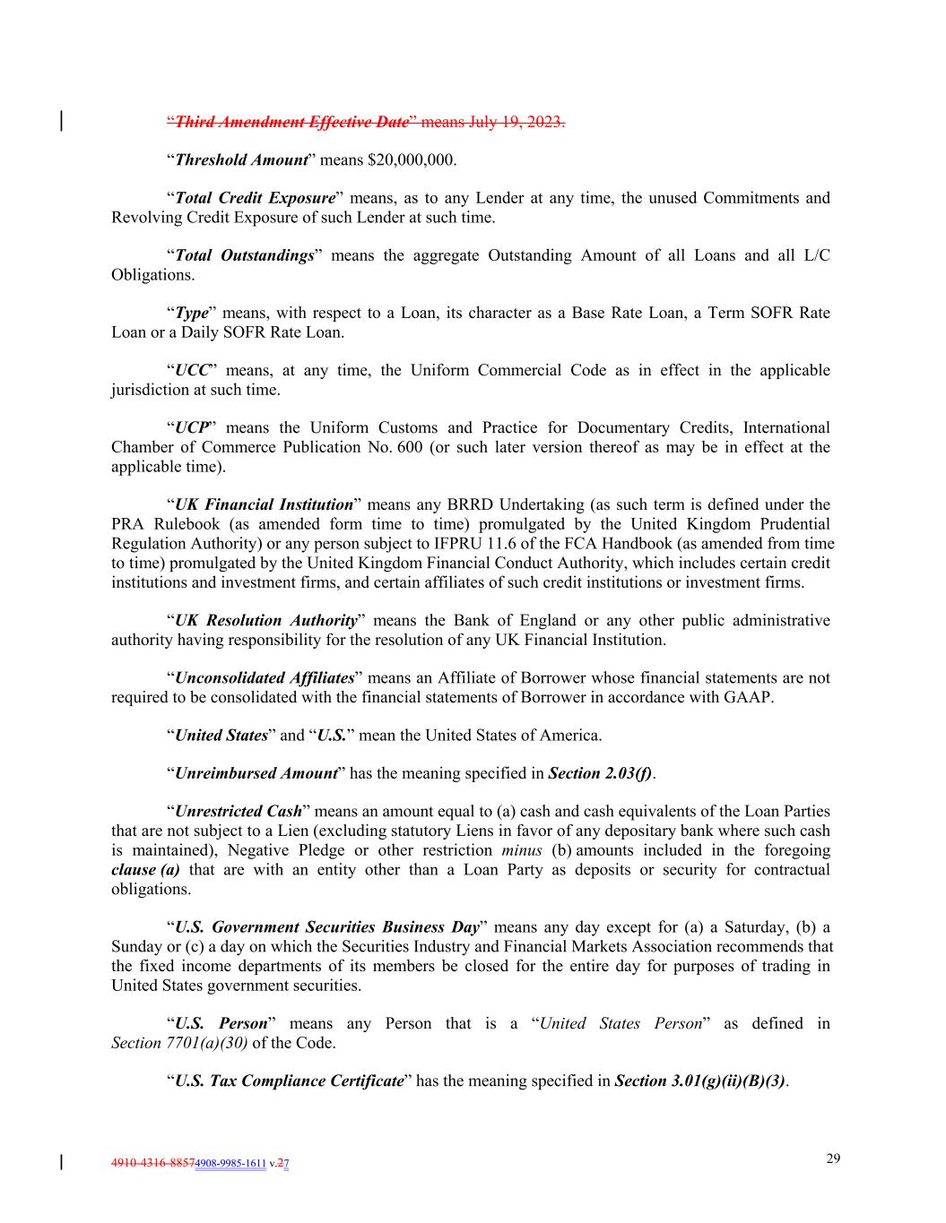 4910-4316-88574908-9985-1611 v.27 29 “Third Amendment Effective Date” means July 19, 2023. “Threshold Amount” means $20,000,000. “Total Credit Exposure” means, as to any Lender at any time, the unused Commitments and Revolving Credit Exposure of such Lender at such time. “Total Outstandings” means the aggregate Outstanding Amount of all Loans and all L/C Obligations. “Type” means, with respect to a Loan, its character as a Base Rate Loan, a Term SOFR Rate Loan or a Daily SOFR Rate Loan. “UCC” means, at any time, the Uniform Commercial Code as in effect in the applicable jurisdiction at such time. “UCP” means the Uniform Customs and Practice for Documentary Credits, International Chamber of Commerce Publication No. 600 (or such later version thereof as may be in effect at the applicable time). “UK Financial Institution” means any BRRD Undertaking (as such term is defined under the PRA Rulebook (as amended form time to time) promulgated by the United Kingdom Prudential Regulation Authority) or any person subject to IFPRU 11.6 of the FCA Handbook (as amended from time to time) promulgated by the United Kingdom Financial Conduct Authority, which includes certain credit institutions and investment firms, and certain affiliates of such credit institutions or investment firms. “UK Resolution Authority” means the Bank of England or any other public administrative authority having responsibility for the resolution of any UK Financial Institution. “Unconsolidated Affiliates” means an Affiliate of Borrower whose financial statements are not required to be consolidated with the financial statements of Borrower in accordance with GAAP. “United States” and “U.S.” mean the United States of America. “Unreimbursed Amount” has the meaning specified in Section 2.03(f). “Unrestricted Cash” means an amount equal to (a) cash and cash equivalents of the Loan Parties that are not subject to a Lien (excluding statutory Liens in favor of any depositary bank where such cash is maintained), Negative Pledge or other restriction minus (b) amounts included in the foregoing clause (a) that are with an entity other than a Loan Party as deposits or security for contractual obligations. “U.S. Government Securities Business Day” means any day except for (a) a Saturday, (b) a Sunday or (c) a day on which the Securities Industry and Financial Markets Association recommends that the fixed income departments of its members be closed for the entire day for purposes of trading in United States government securities. “U.S. Person” means any Person that is a “United States Person” as defined in Section 7701(a)(30) of the Code. “U.S. Tax Compliance Certificate” has the meaning specified in Section 3.01(g)(ii)(B)(3).