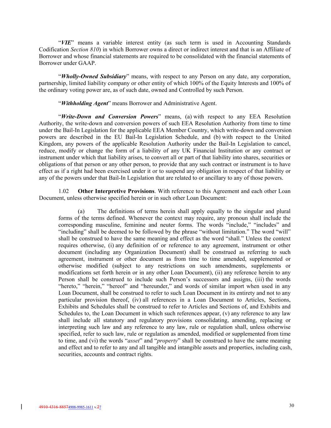 4910-4316-88574908-9985-1611 v.27 30 “VIE” means a variable interest entity (as such term is used in Accounting Standards Codification Section 810) in which Borrower owns a direct or indirect interest and that is an Affiliate of Borrower and whose financial statements are required to be consolidated with the financial statements of Borrower under GAAP. “Wholly-Owned Subsidiary” means, with respect to any Person on any date, any corporation, partnership, limited liability company or other entity of which 100% of the Equity Interests and 100% of the ordinary voting power are, as of such date, owned and Controlled by such Person. “Withholding Agent” means Borrower and Administrative Agent. “Write-Down and Conversion Powers” means, (a) with respect to any EEA Resolution Authority, the write-down and conversion powers of such EEA Resolution Authority from time to time under the Bail-In Legislation for the applicable EEA Member Country, which write-down and conversion powers are described in the EU Bail-In Legislation Schedule, and (b) with respect to the United Kingdom, any powers of the applicable Resolution Authority under the Bail-In Legislation to cancel, reduce, modify or change the form of a liability of any UK Financial Institution or any contract or instrument under which that liability arises, to convert all or part of that liability into shares, securities or obligations of that person or any other person, to provide that any such contract or instrument is to have effect as if a right had been exercised under it or to suspend any obligation in respect of that liability or any of the powers under that Bail-In Legislation that are related to or ancillary to any of those powers. 1.02 Other Interpretive Provisions. With reference to this Agreement and each other Loan Document, unless otherwise specified herein or in such other Loan Document: (a) The definitions of terms herein shall apply equally to the singular and plural forms of the terms defined. Whenever the context may require, any pronoun shall include the corresponding masculine, feminine and neuter forms. The words “include,” “includes” and “including” shall be deemed to be followed by the phrase “without limitation.” The word “will” shall be construed to have the same meaning and effect as the word “shall.” Unless the context requires otherwise, (i) any definition of or reference to any agreement, instrument or other document (including any Organization Document) shall be construed as referring to such agreement, instrument or other document as from time to time amended, supplemented or otherwise modified (subject to any restrictions on such amendments, supplements or modifications set forth herein or in any other Loan Document), (ii) any reference herein to any Person shall be construed to include such Person’s successors and assigns, (iii) the words “hereto,” “herein,” “hereof” and “hereunder,” and words of similar import when used in any Loan Document, shall be construed to refer to such Loan Document in its entirety and not to any particular provision thereof, (iv) all references in a Loan Document to Articles, Sections, Exhibits and Schedules shall be construed to refer to Articles and Sections of, and Exhibits and Schedules to, the Loan Document in which such references appear, (v) any reference to any law shall include all statutory and regulatory provisions consolidating, amending, replacing or interpreting such law and any reference to any law, rule or regulation shall, unless otherwise specified, refer to such law, rule or regulation as amended, modified or supplemented from time to time, and (vi) the words “asset” and “property” shall be construed to have the same meaning and effect and to refer to any and all tangible and intangible assets and properties, including cash, securities, accounts and contract rights.