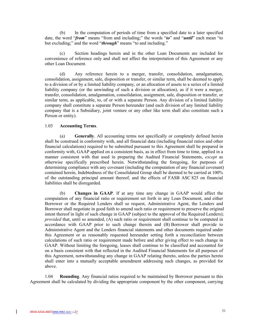 4910-4316-88574908-9985-1611 v.27 31 (b) In the computation of periods of time from a specified date to a later specified date, the word “from” means “from and including;” the words “to” and “until” each mean “to but excluding;” and the word “through” means “to and including.” (c) Section headings herein and in the other Loan Documents are included for convenience of reference only and shall not affect the interpretation of this Agreement or any other Loan Document. (d) Any reference herein to a merger, transfer, consolidation, amalgamation, consolidation, assignment, sale, disposition or transfer, or similar term, shall be deemed to apply to a division of or by a limited liability company, or an allocation of assets to a series of a limited liability company (or the unwinding of such a division or allocation), as if it were a merger, transfer, consolidation, amalgamation, consolidation, assignment, sale, disposition or transfer, or similar term, as applicable, to, of or with a separate Person. Any division of a limited liability company shall constitute a separate Person hereunder (and each division of any limited liability company that is a Subsidiary, joint venture or any other like term shall also constitute such a Person or entity). 1.03 Accounting Terms. (a) Generally. All accounting terms not specifically or completely defined herein shall be construed in conformity with, and all financial data (including financial ratios and other financial calculations) required to be submitted pursuant to this Agreement shall be prepared in conformity with, GAAP applied on a consistent basis, as in effect from time to time, applied in a manner consistent with that used in preparing the Audited Financial Statements, except as otherwise specifically prescribed herein. Notwithstanding the foregoing, for purposes of determining compliance with any covenant (including the computation of any financial covenant) contained herein, Indebtedness of the Consolidated Group shall be deemed to be carried at 100% of the outstanding principal amount thereof, and the effects of FASB ASC 825 on financial liabilities shall be disregarded. (b) Changes in GAAP. If at any time any change in GAAP would affect the computation of any financial ratio or requirement set forth in any Loan Document, and either Borrower or the Required Lenders shall so request, Administrative Agent, the Lenders and Borrower shall negotiate in good faith to amend such ratio or requirement to preserve the original intent thereof in light of such change in GAAP (subject to the approval of the Required Lenders); provided that, until so amended, (A) such ratio or requirement shall continue to be computed in accordance with GAAP prior to such change therein and (B) Borrower shall provide to Administrative Agent and the Lenders financial statements and other documents required under this Agreement or as reasonably requested hereunder setting forth a reconciliation between calculations of such ratio or requirement made before and after giving effect to such change in GAAP. Without limiting the foregoing, leases shall continue to be classified and accounted for on a basis consistent with that reflected in the Audited Financial Statements for all purposes of this Agreement, notwithstanding any change in GAAP relating thereto, unless the parties hereto shall enter into a mutually acceptable amendment addressing such changes, as provided for above. 1.04 Rounding. Any financial ratios required to be maintained by Borrower pursuant to this Agreement shall be calculated by dividing the appropriate component by the other component, carrying
