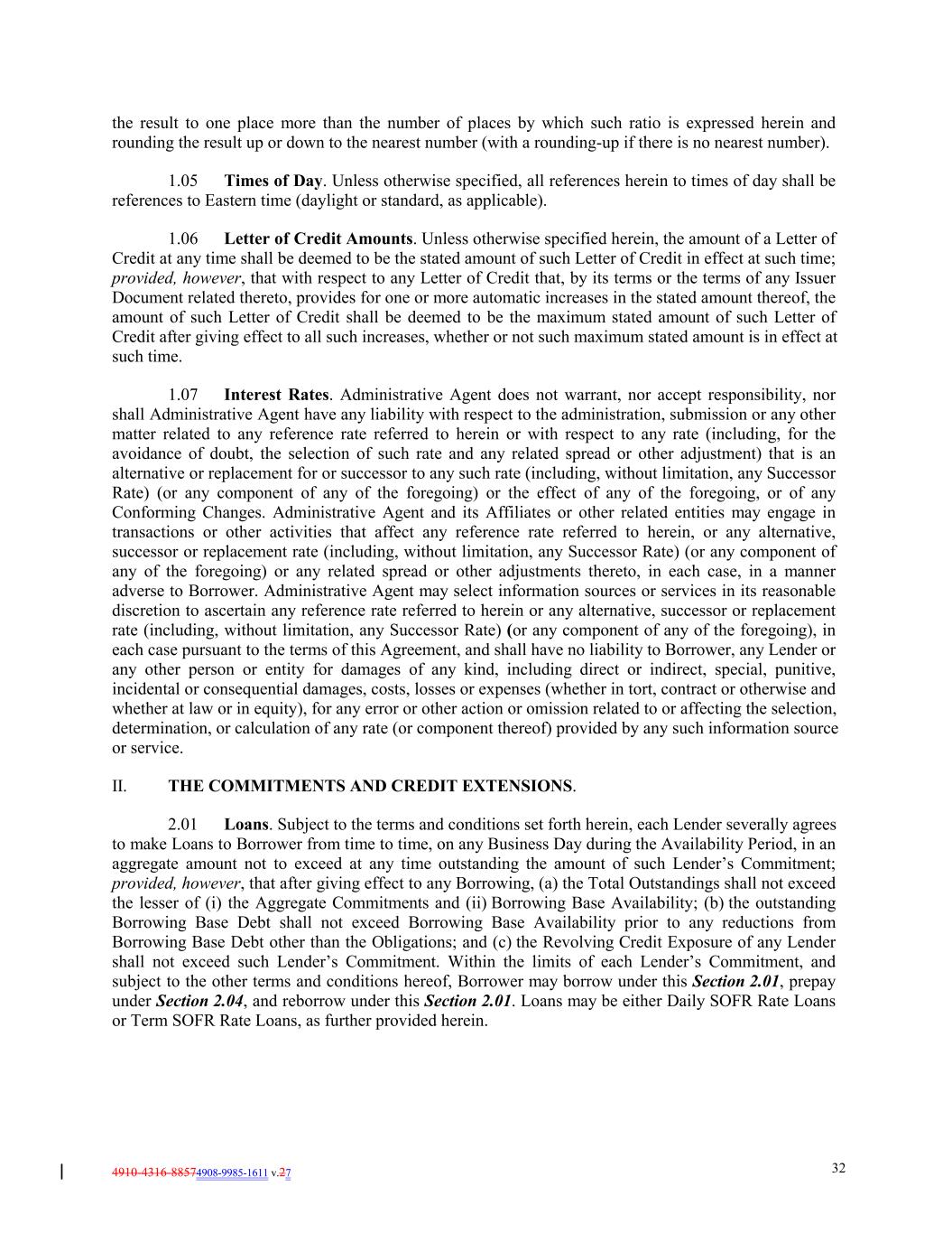 4910-4316-88574908-9985-1611 v.27 32 the result to one place more than the number of places by which such ratio is expressed herein and rounding the result up or down to the nearest number (with a rounding-up if there is no nearest number). 1.05 Times of Day. Unless otherwise specified, all references herein to times of day shall be references to Eastern time (daylight or standard, as applicable). 1.06 Letter of Credit Amounts. Unless otherwise specified herein, the amount of a Letter of Credit at any time shall be deemed to be the stated amount of such Letter of Credit in effect at such time; provided, however, that with respect to any Letter of Credit that, by its terms or the terms of any Issuer Document related thereto, provides for one or more automatic increases in the stated amount thereof, the amount of such Letter of Credit shall be deemed to be the maximum stated amount of such Letter of Credit after giving effect to all such increases, whether or not such maximum stated amount is in effect at such time. 1.07 Interest Rates. Administrative Agent does not warrant, nor accept responsibility, nor shall Administrative Agent have any liability with respect to the administration, submission or any other matter related to any reference rate referred to herein or with respect to any rate (including, for the avoidance of doubt, the selection of such rate and any related spread or other adjustment) that is an alternative or replacement for or successor to any such rate (including, without limitation, any Successor Rate) (or any component of any of the foregoing) or the effect of any of the foregoing, or of any Conforming Changes. Administrative Agent and its Affiliates or other related entities may engage in transactions or other activities that affect any reference rate referred to herein, or any alternative, successor or replacement rate (including, without limitation, any Successor Rate) (or any component of any of the foregoing) or any related spread or other adjustments thereto, in each case, in a manner adverse to Borrower. Administrative Agent may select information sources or services in its reasonable discretion to ascertain any reference rate referred to herein or any alternative, successor or replacement rate (including, without limitation, any Successor Rate) (or any component of any of the foregoing), in each case pursuant to the terms of this Agreement, and shall have no liability to Borrower, any Lender or any other person or entity for damages of any kind, including direct or indirect, special, punitive, incidental or consequential damages, costs, losses or expenses (whether in tort, contract or otherwise and whether at law or in equity), for any error or other action or omission related to or affecting the selection, determination, or calculation of any rate (or component thereof) provided by any such information source or service. II. THE COMMITMENTS AND CREDIT EXTENSIONS. 2.01 Loans. Subject to the terms and conditions set forth herein, each Lender severally agrees to make Loans to Borrower from time to time, on any Business Day during the Availability Period, in an aggregate amount not to exceed at any time outstanding the amount of such Lender’s Commitment; provided, however, that after giving effect to any Borrowing, (a) the Total Outstandings shall not exceed the lesser of (i) the Aggregate Commitments and (ii) Borrowing Base Availability; (b) the outstanding Borrowing Base Debt shall not exceed Borrowing Base Availability prior to any reductions from Borrowing Base Debt other than the Obligations; and (c) the Revolving Credit Exposure of any Lender shall not exceed such Lender’s Commitment. Within the limits of each Lender’s Commitment, and subject to the other terms and conditions hereof, Borrower may borrow under this Section 2.01, prepay under Section 2.04, and reborrow under this Section 2.01. Loans may be either Daily SOFR Rate Loans or Term SOFR Rate Loans, as further provided herein.