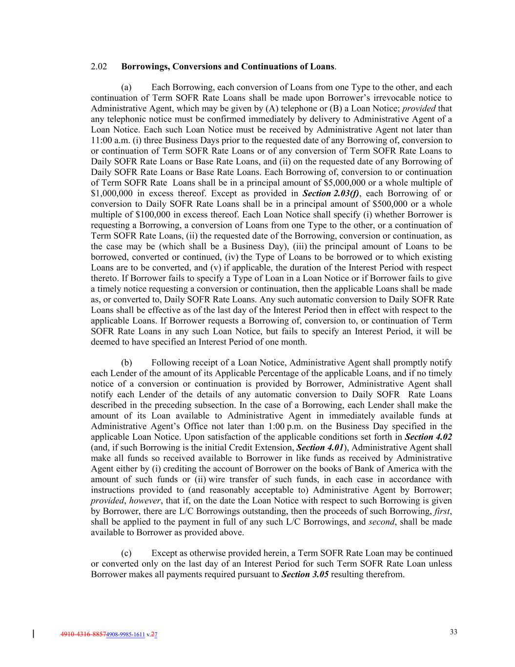 4910-4316-88574908-9985-1611 v.27 33 2.02 Borrowings, Conversions and Continuations of Loans. (a) Each Borrowing, each conversion of Loans from one Type to the other, and each continuation of Term SOFR Rate Loans shall be made upon Borrower’s irrevocable notice to Administrative Agent, which may be given by (A) telephone or (B) a Loan Notice; provided that any telephonic notice must be confirmed immediately by delivery to Administrative Agent of a Loan Notice. Each such Loan Notice must be received by Administrative Agent not later than 11:00 a.m. (i) three Business Days prior to the requested date of any Borrowing of, conversion to or continuation of Term SOFR Rate Loans or of any conversion of Term SOFR Rate Loans to Daily SOFR Rate Loans or Base Rate Loans, and (ii) on the requested date of any Borrowing of Daily SOFR Rate Loans or Base Rate Loans. Each Borrowing of, conversion to or continuation of Term SOFR Rate Loans shall be in a principal amount of $5,000,000 or a whole multiple of $1,000,000 in excess thereof. Except as provided in Section 2.03(f), each Borrowing of or conversion to Daily SOFR Rate Loans shall be in a principal amount of $500,000 or a whole multiple of $100,000 in excess thereof. Each Loan Notice shall specify (i) whether Borrower is requesting a Borrowing, a conversion of Loans from one Type to the other, or a continuation of Term SOFR Rate Loans, (ii) the requested date of the Borrowing, conversion or continuation, as the case may be (which shall be a Business Day), (iii) the principal amount of Loans to be borrowed, converted or continued, (iv) the Type of Loans to be borrowed or to which existing Loans are to be converted, and (v) if applicable, the duration of the Interest Period with respect thereto. If Borrower fails to specify a Type of Loan in a Loan Notice or if Borrower fails to give a timely notice requesting a conversion or continuation, then the applicable Loans shall be made as, or converted to, Daily SOFR Rate Loans. Any such automatic conversion to Daily SOFR Rate Loans shall be effective as of the last day of the Interest Period then in effect with respect to the applicable Loans. If Borrower requests a Borrowing of, conversion to, or continuation of Term SOFR Rate Loans in any such Loan Notice, but fails to specify an Interest Period, it will be deemed to have specified an Interest Period of one month. (b) Following receipt of a Loan Notice, Administrative Agent shall promptly notify each Lender of the amount of its Applicable Percentage of the applicable Loans, and if no timely notice of a conversion or continuation is provided by Borrower, Administrative Agent shall notify each Lender of the details of any automatic conversion to Daily SOFR Rate Loans described in the preceding subsection. In the case of a Borrowing, each Lender shall make the amount of its Loan available to Administrative Agent in immediately available funds at Administrative Agent’s Office not later than 1:00 p.m. on the Business Day specified in the applicable Loan Notice. Upon satisfaction of the applicable conditions set forth in Section 4.02 (and, if such Borrowing is the initial Credit Extension, Section 4.01), Administrative Agent shall make all funds so received available to Borrower in like funds as received by Administrative Agent either by (i) crediting the account of Borrower on the books of Bank of America with the amount of such funds or (ii) wire transfer of such funds, in each case in accordance with instructions provided to (and reasonably acceptable to) Administrative Agent by Borrower; provided, however, that if, on the date the Loan Notice with respect to such Borrowing is given by Borrower, there are L/C Borrowings outstanding, then the proceeds of such Borrowing, first, shall be applied to the payment in full of any such L/C Borrowings, and second, shall be made available to Borrower as provided above. (c) Except as otherwise provided herein, a Term SOFR Rate Loan may be continued or converted only on the last day of an Interest Period for such Term SOFR Rate Loan unless Borrower makes all payments required pursuant to Section 3.05 resulting therefrom.