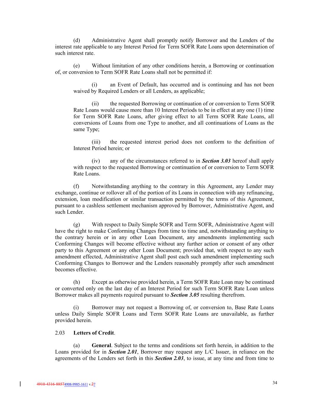 4910-4316-88574908-9985-1611 v.27 34 (d) Administrative Agent shall promptly notify Borrower and the Lenders of the interest rate applicable to any Interest Period for Term SOFR Rate Loans upon determination of such interest rate. (e) Without limitation of any other conditions herein, a Borrowing or continuation of, or conversion to Term SOFR Rate Loans shall not be permitted if: (i) an Event of Default, has occurred and is continuing and has not been waived by Required Lenders or all Lenders, as applicable; (ii) the requested Borrowing or continuation of or conversion to Term SOFR Rate Loans would cause more than 10 Interest Periods to be in effect at any one (1) time for Term SOFR Rate Loans, after giving effect to all Term SOFR Rate Loans, all conversions of Loans from one Type to another, and all continuations of Loans as the same Type; (iii) the requested interest period does not conform to the definition of Interest Period herein; or (iv) any of the circumstances referred to in Section 3.03 hereof shall apply with respect to the requested Borrowing or continuation of or conversion to Term SOFR Rate Loans. (f) Notwithstanding anything to the contrary in this Agreement, any Lender may exchange, continue or rollover all of the portion of its Loans in connection with any refinancing, extension, loan modification or similar transaction permitted by the terms of this Agreement, pursuant to a cashless settlement mechanism approved by Borrower, Administrative Agent, and such Lender. (g) With respect to Daily Simple SOFR and Term SOFR, Administrative Agent will have the right to make Conforming Changes from time to time and, notwithstanding anything to the contrary herein or in any other Loan Document, any amendments implementing such Conforming Changes will become effective without any further action or consent of any other party to this Agreement or any other Loan Document; provided that, with respect to any such amendment effected, Administrative Agent shall post each such amendment implementing such Conforming Changes to Borrower and the Lenders reasonably promptly after such amendment becomes effective. (h) Except as otherwise provided herein, a Term SOFR Rate Loan may be continued or converted only on the last day of an Interest Period for such Term SOFR Rate Loan unless Borrower makes all payments required pursuant to Section 3.05 resulting therefrom. (i) Borrower may not request a Borrowing of, or conversion to, Base Rate Loans unless Daily Simple SOFR Loans and Term SOFR Rate Loans are unavailable, as further provided herein. 2.03 Letters of Credit. (a) General. Subject to the terms and conditions set forth herein, in addition to the Loans provided for in Section 2.01, Borrower may request any L/C Issuer, in reliance on the agreements of the Lenders set forth in this Section 2.03, to issue, at any time and from time to