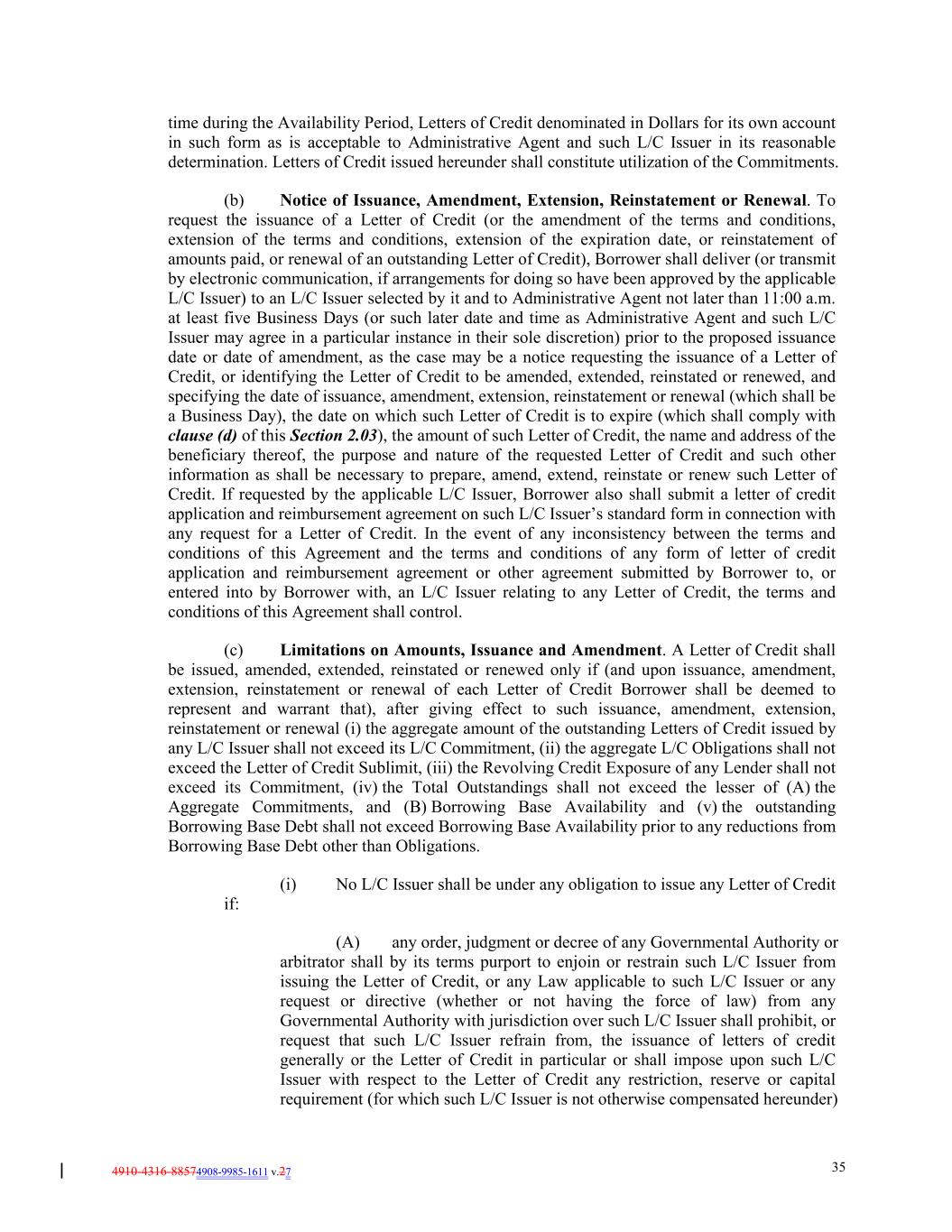 4910-4316-88574908-9985-1611 v.27 35 time during the Availability Period, Letters of Credit denominated in Dollars for its own account in such form as is acceptable to Administrative Agent and such L/C Issuer in its reasonable determination. Letters of Credit issued hereunder shall constitute utilization of the Commitments. (b) Notice of Issuance, Amendment, Extension, Reinstatement or Renewal. To request the issuance of a Letter of Credit (or the amendment of the terms and conditions, extension of the terms and conditions, extension of the expiration date, or reinstatement of amounts paid, or renewal of an outstanding Letter of Credit), Borrower shall deliver (or transmit by electronic communication, if arrangements for doing so have been approved by the applicable L/C Issuer) to an L/C Issuer selected by it and to Administrative Agent not later than 11:00 a.m. at least five Business Days (or such later date and time as Administrative Agent and such L/C Issuer may agree in a particular instance in their sole discretion) prior to the proposed issuance date or date of amendment, as the case may be a notice requesting the issuance of a Letter of Credit, or identifying the Letter of Credit to be amended, extended, reinstated or renewed, and specifying the date of issuance, amendment, extension, reinstatement or renewal (which shall be a Business Day), the date on which such Letter of Credit is to expire (which shall comply with clause (d) of this Section 2.03), the amount of such Letter of Credit, the name and address of the beneficiary thereof, the purpose and nature of the requested Letter of Credit and such other information as shall be necessary to prepare, amend, extend, reinstate or renew such Letter of Credit. If requested by the applicable L/C Issuer, Borrower also shall submit a letter of credit application and reimbursement agreement on such L/C Issuer’s standard form in connection with any request for a Letter of Credit. In the event of any inconsistency between the terms and conditions of this Agreement and the terms and conditions of any form of letter of credit application and reimbursement agreement or other agreement submitted by Borrower to, or entered into by Borrower with, an L/C Issuer relating to any Letter of Credit, the terms and conditions of this Agreement shall control. (c) Limitations on Amounts, Issuance and Amendment. A Letter of Credit shall be issued, amended, extended, reinstated or renewed only if (and upon issuance, amendment, extension, reinstatement or renewal of each Letter of Credit Borrower shall be deemed to represent and warrant that), after giving effect to such issuance, amendment, extension, reinstatement or renewal (i) the aggregate amount of the outstanding Letters of Credit issued by any L/C Issuer shall not exceed its L/C Commitment, (ii) the aggregate L/C Obligations shall not exceed the Letter of Credit Sublimit, (iii) the Revolving Credit Exposure of any Lender shall not exceed its Commitment, (iv) the Total Outstandings shall not exceed the lesser of (A) the Aggregate Commitments, and (B) Borrowing Base Availability and (v) the outstanding Borrowing Base Debt shall not exceed Borrowing Base Availability prior to any reductions from Borrowing Base Debt other than Obligations. (i) No L/C Issuer shall be under any obligation to issue any Letter of Credit if: (A) any order, judgment or decree of any Governmental Authority or arbitrator shall by its terms purport to enjoin or restrain such L/C Issuer from issuing the Letter of Credit, or any Law applicable to such L/C Issuer or any request or directive (whether or not having the force of law) from any Governmental Authority with jurisdiction over such L/C Issuer shall prohibit, or request that such L/C Issuer refrain from, the issuance of letters of credit generally or the Letter of Credit in particular or shall impose upon such L/C Issuer with respect to the Letter of Credit any restriction, reserve or capital requirement (for which such L/C Issuer is not otherwise compensated hereunder)