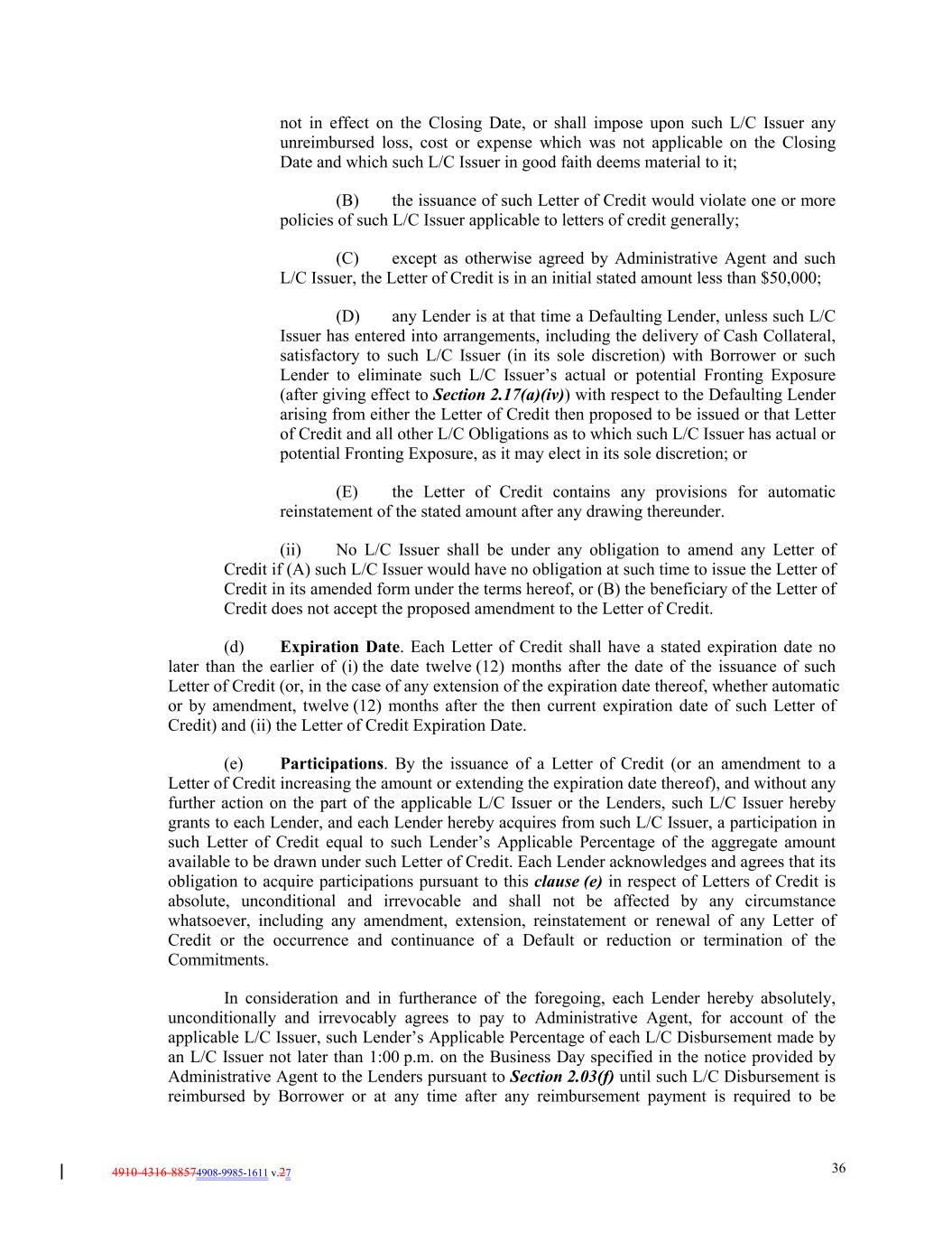 4910-4316-88574908-9985-1611 v.27 36 not in effect on the Closing Date, or shall impose upon such L/C Issuer any unreimbursed loss, cost or expense which was not applicable on the Closing Date and which such L/C Issuer in good faith deems material to it; (B) the issuance of such Letter of Credit would violate one or more policies of such L/C Issuer applicable to letters of credit generally; (C) except as otherwise agreed by Administrative Agent and such L/C Issuer, the Letter of Credit is in an initial stated amount less than $50,000; (D) any Lender is at that time a Defaulting Lender, unless such L/C Issuer has entered into arrangements, including the delivery of Cash Collateral, satisfactory to such L/C Issuer (in its sole discretion) with Borrower or such Lender to eliminate such L/C Issuer’s actual or potential Fronting Exposure (after giving effect to Section 2.17(a)(iv)) with respect to the Defaulting Lender arising from either the Letter of Credit then proposed to be issued or that Letter of Credit and all other L/C Obligations as to which such L/C Issuer has actual or potential Fronting Exposure, as it may elect in its sole discretion; or (E) the Letter of Credit contains any provisions for automatic reinstatement of the stated amount after any drawing thereunder. (ii) No L/C Issuer shall be under any obligation to amend any Letter of Credit if (A) such L/C Issuer would have no obligation at such time to issue the Letter of Credit in its amended form under the terms hereof, or (B) the beneficiary of the Letter of Credit does not accept the proposed amendment to the Letter of Credit. (d) Expiration Date. Each Letter of Credit shall have a stated expiration date no later than the earlier of (i) the date twelve (12) months after the date of the issuance of such Letter of Credit (or, in the case of any extension of the expiration date thereof, whether automatic or by amendment, twelve (12) months after the then current expiration date of such Letter of Credit) and (ii) the Letter of Credit Expiration Date. (e) Participations. By the issuance of a Letter of Credit (or an amendment to a Letter of Credit increasing the amount or extending the expiration date thereof), and without any further action on the part of the applicable L/C Issuer or the Lenders, such L/C Issuer hereby grants to each Lender, and each Lender hereby acquires from such L/C Issuer, a participation in such Letter of Credit equal to such Lender’s Applicable Percentage of the aggregate amount available to be drawn under such Letter of Credit. Each Lender acknowledges and agrees that its obligation to acquire participations pursuant to this clause (e) in respect of Letters of Credit is absolute, unconditional and irrevocable and shall not be affected by any circumstance whatsoever, including any amendment, extension, reinstatement or renewal of any Letter of Credit or the occurrence and continuance of a Default or reduction or termination of the Commitments. In consideration and in furtherance of the foregoing, each Lender hereby absolutely, unconditionally and irrevocably agrees to pay to Administrative Agent, for account of the applicable L/C Issuer, such Lender’s Applicable Percentage of each L/C Disbursement made by an L/C Issuer not later than 1:00 p.m. on the Business Day specified in the notice provided by Administrative Agent to the Lenders pursuant to Section 2.03(f) until such L/C Disbursement is reimbursed by Borrower or at any time after any reimbursement payment is required to be