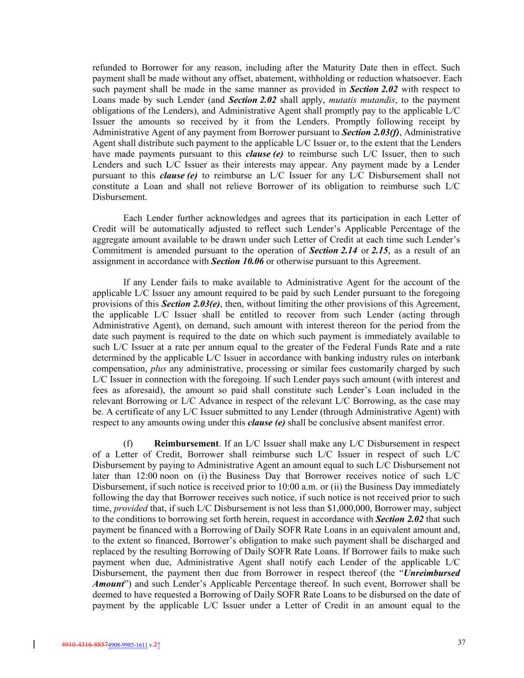 4910-4316-88574908-9985-1611 v.27 37 refunded to Borrower for any reason, including after the Maturity Date then in effect. Such payment shall be made without any offset, abatement, withholding or reduction whatsoever. Each such payment shall be made in the same manner as provided in Section 2.02 with respect to Loans made by such Lender (and Section 2.02 shall apply, mutatis mutandis, to the payment obligations of the Lenders), and Administrative Agent shall promptly pay to the applicable L/C Issuer the amounts so received by it from the Lenders. Promptly following receipt by Administrative Agent of any payment from Borrower pursuant to Section 2.03(f), Administrative Agent shall distribute such payment to the applicable L/C Issuer or, to the extent that the Lenders have made payments pursuant to this clause (e) to reimburse such L/C Issuer, then to such Lenders and such L/C Issuer as their interests may appear. Any payment made by a Lender pursuant to this clause (e) to reimburse an L/C Issuer for any L/C Disbursement shall not constitute a Loan and shall not relieve Borrower of its obligation to reimburse such L/C Disbursement. Each Lender further acknowledges and agrees that its participation in each Letter of Credit will be automatically adjusted to reflect such Lender’s Applicable Percentage of the aggregate amount available to be drawn under such Letter of Credit at each time such Lender’s Commitment is amended pursuant to the operation of Section 2.14 or 2.15, as a result of an assignment in accordance with Section 10.06 or otherwise pursuant to this Agreement. If any Lender fails to make available to Administrative Agent for the account of the applicable L/C Issuer any amount required to be paid by such Lender pursuant to the foregoing provisions of this Section 2.03(e), then, without limiting the other provisions of this Agreement, the applicable L/C Issuer shall be entitled to recover from such Lender (acting through Administrative Agent), on demand, such amount with interest thereon for the period from the date such payment is required to the date on which such payment is immediately available to such L/C Issuer at a rate per annum equal to the greater of the Federal Funds Rate and a rate determined by the applicable L/C Issuer in accordance with banking industry rules on interbank compensation, plus any administrative, processing or similar fees customarily charged by such L/C Issuer in connection with the foregoing. If such Lender pays such amount (with interest and fees as aforesaid), the amount so paid shall constitute such Lender’s Loan included in the relevant Borrowing or L/C Advance in respect of the relevant L/C Borrowing, as the case may be. A certificate of any L/C Issuer submitted to any Lender (through Administrative Agent) with respect to any amounts owing under this clause (e) shall be conclusive absent manifest error. (f) Reimbursement. If an L/C Issuer shall make any L/C Disbursement in respect of a Letter of Credit, Borrower shall reimburse such L/C Issuer in respect of such L/C Disbursement by paying to Administrative Agent an amount equal to such L/C Disbursement not later than 12:00 noon on (i) the Business Day that Borrower receives notice of such L/C Disbursement, if such notice is received prior to 10:00 a.m. or (ii) the Business Day immediately following the day that Borrower receives such notice, if such notice is not received prior to such time, provided that, if such L/C Disbursement is not less than $1,000,000, Borrower may, subject to the conditions to borrowing set forth herein, request in accordance with Section 2.02 that such payment be financed with a Borrowing of Daily SOFR Rate Loans in an equivalent amount and, to the extent so financed, Borrower’s obligation to make such payment shall be discharged and replaced by the resulting Borrowing of Daily SOFR Rate Loans. If Borrower fails to make such payment when due, Administrative Agent shall notify each Lender of the applicable L/C Disbursement, the payment then due from Borrower in respect thereof (the “Unreimbursed Amount”) and such Lender’s Applicable Percentage thereof. In such event, Borrower shall be deemed to have requested a Borrowing of Daily SOFR Rate Loans to be disbursed on the date of payment by the applicable L/C Issuer under a Letter of Credit in an amount equal to the