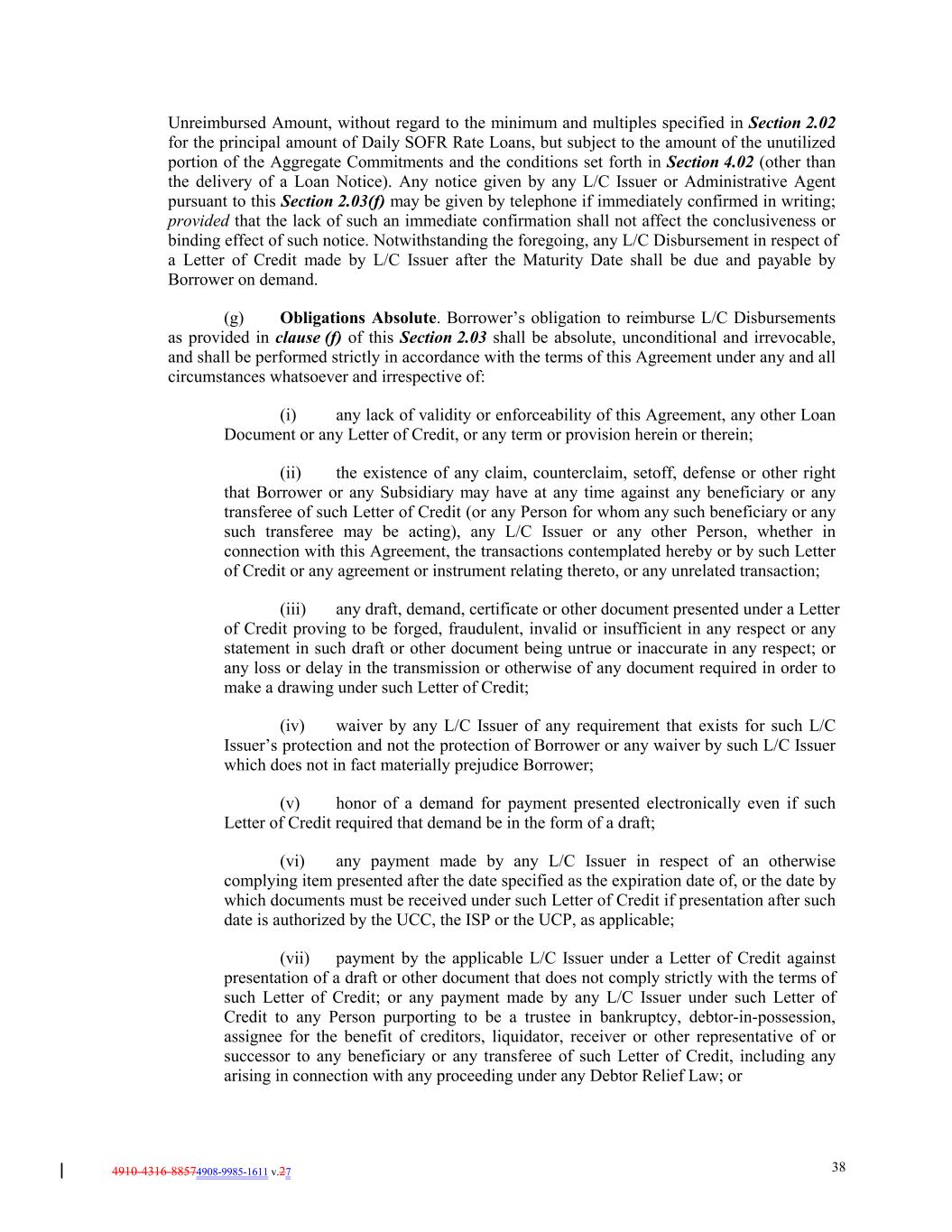 4910-4316-88574908-9985-1611 v.27 38 Unreimbursed Amount, without regard to the minimum and multiples specified in Section 2.02 for the principal amount of Daily SOFR Rate Loans, but subject to the amount of the unutilized portion of the Aggregate Commitments and the conditions set forth in Section 4.02 (other than the delivery of a Loan Notice). Any notice given by any L/C Issuer or Administrative Agent pursuant to this Section 2.03(f) may be given by telephone if immediately confirmed in writing; provided that the lack of such an immediate confirmation shall not affect the conclusiveness or binding effect of such notice. Notwithstanding the foregoing, any L/C Disbursement in respect of a Letter of Credit made by L/C Issuer after the Maturity Date shall be due and payable by Borrower on demand. (g) Obligations Absolute. Borrower’s obligation to reimburse L/C Disbursements as provided in clause (f) of this Section 2.03 shall be absolute, unconditional and irrevocable, and shall be performed strictly in accordance with the terms of this Agreement under any and all circumstances whatsoever and irrespective of: (i) any lack of validity or enforceability of this Agreement, any other Loan Document or any Letter of Credit, or any term or provision herein or therein; (ii) the existence of any claim, counterclaim, setoff, defense or other right that Borrower or any Subsidiary may have at any time against any beneficiary or any transferee of such Letter of Credit (or any Person for whom any such beneficiary or any such transferee may be acting), any L/C Issuer or any other Person, whether in connection with this Agreement, the transactions contemplated hereby or by such Letter of Credit or any agreement or instrument relating thereto, or any unrelated transaction; (iii) any draft, demand, certificate or other document presented under a Letter of Credit proving to be forged, fraudulent, invalid or insufficient in any respect or any statement in such draft or other document being untrue or inaccurate in any respect; or any loss or delay in the transmission or otherwise of any document required in order to make a drawing under such Letter of Credit; (iv) waiver by any L/C Issuer of any requirement that exists for such L/C Issuer’s protection and not the protection of Borrower or any waiver by such L/C Issuer which does not in fact materially prejudice Borrower; (v) honor of a demand for payment presented electronically even if such Letter of Credit required that demand be in the form of a draft; (vi) any payment made by any L/C Issuer in respect of an otherwise complying item presented after the date specified as the expiration date of, or the date by which documents must be received under such Letter of Credit if presentation after such date is authorized by the UCC, the ISP or the UCP, as applicable; (vii) payment by the applicable L/C Issuer under a Letter of Credit against presentation of a draft or other document that does not comply strictly with the terms of such Letter of Credit; or any payment made by any L/C Issuer under such Letter of Credit to any Person purporting to be a trustee in bankruptcy, debtor-in-possession, assignee for the benefit of creditors, liquidator, receiver or other representative of or successor to any beneficiary or any transferee of such Letter of Credit, including any arising in connection with any proceeding under any Debtor Relief Law; or