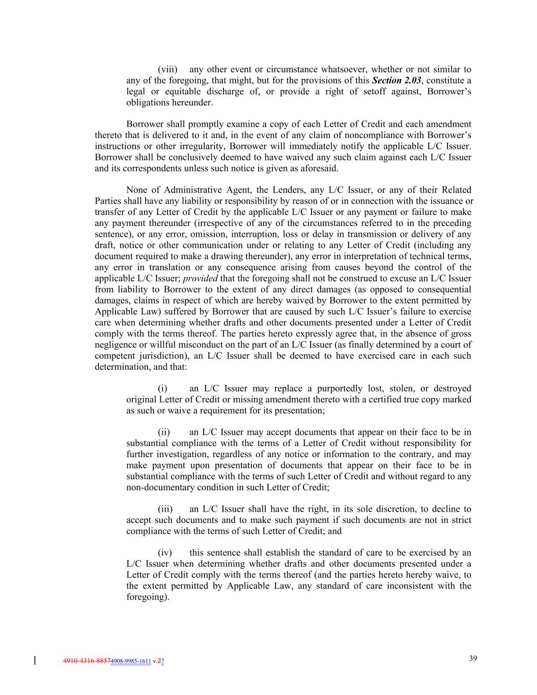 4910-4316-88574908-9985-1611 v.27 39 (viii) any other event or circumstance whatsoever, whether or not similar to any of the foregoing, that might, but for the provisions of this Section 2.03, constitute a legal or equitable discharge of, or provide a right of setoff against, Borrower’s obligations hereunder. Borrower shall promptly examine a copy of each Letter of Credit and each amendment thereto that is delivered to it and, in the event of any claim of noncompliance with Borrower’s instructions or other irregularity, Borrower will immediately notify the applicable L/C Issuer. Borrower shall be conclusively deemed to have waived any such claim against each L/C Issuer and its correspondents unless such notice is given as aforesaid. None of Administrative Agent, the Lenders, any L/C Issuer, or any of their Related Parties shall have any liability or responsibility by reason of or in connection with the issuance or transfer of any Letter of Credit by the applicable L/C Issuer or any payment or failure to make any payment thereunder (irrespective of any of the circumstances referred to in the preceding sentence), or any error, omission, interruption, loss or delay in transmission or delivery of any draft, notice or other communication under or relating to any Letter of Credit (including any document required to make a drawing thereunder), any error in interpretation of technical terms, any error in translation or any consequence arising from causes beyond the control of the applicable L/C Issuer; provided that the foregoing shall not be construed to excuse an L/C Issuer from liability to Borrower to the extent of any direct damages (as opposed to consequential damages, claims in respect of which are hereby waived by Borrower to the extent permitted by Applicable Law) suffered by Borrower that are caused by such L/C Issuer’s failure to exercise care when determining whether drafts and other documents presented under a Letter of Credit comply with the terms thereof. The parties hereto expressly agree that, in the absence of gross negligence or willful misconduct on the part of an L/C Issuer (as finally determined by a court of competent jurisdiction), an L/C Issuer shall be deemed to have exercised care in each such determination, and that: (i) an L/C Issuer may replace a purportedly lost, stolen, or destroyed original Letter of Credit or missing amendment thereto with a certified true copy marked as such or waive a requirement for its presentation; (ii) an L/C Issuer may accept documents that appear on their face to be in substantial compliance with the terms of a Letter of Credit without responsibility for further investigation, regardless of any notice or information to the contrary, and may make payment upon presentation of documents that appear on their face to be in substantial compliance with the terms of such Letter of Credit and without regard to any non-documentary condition in such Letter of Credit; (iii) an L/C Issuer shall have the right, in its sole discretion, to decline to accept such documents and to make such payment if such documents are not in strict compliance with the terms of such Letter of Credit; and (iv) this sentence shall establish the standard of care to be exercised by an L/C Issuer when determining whether drafts and other documents presented under a Letter of Credit comply with the terms thereof (and the parties hereto hereby waive, to the extent permitted by Applicable Law, any standard of care inconsistent with the foregoing).
